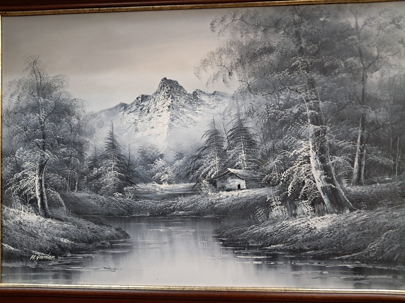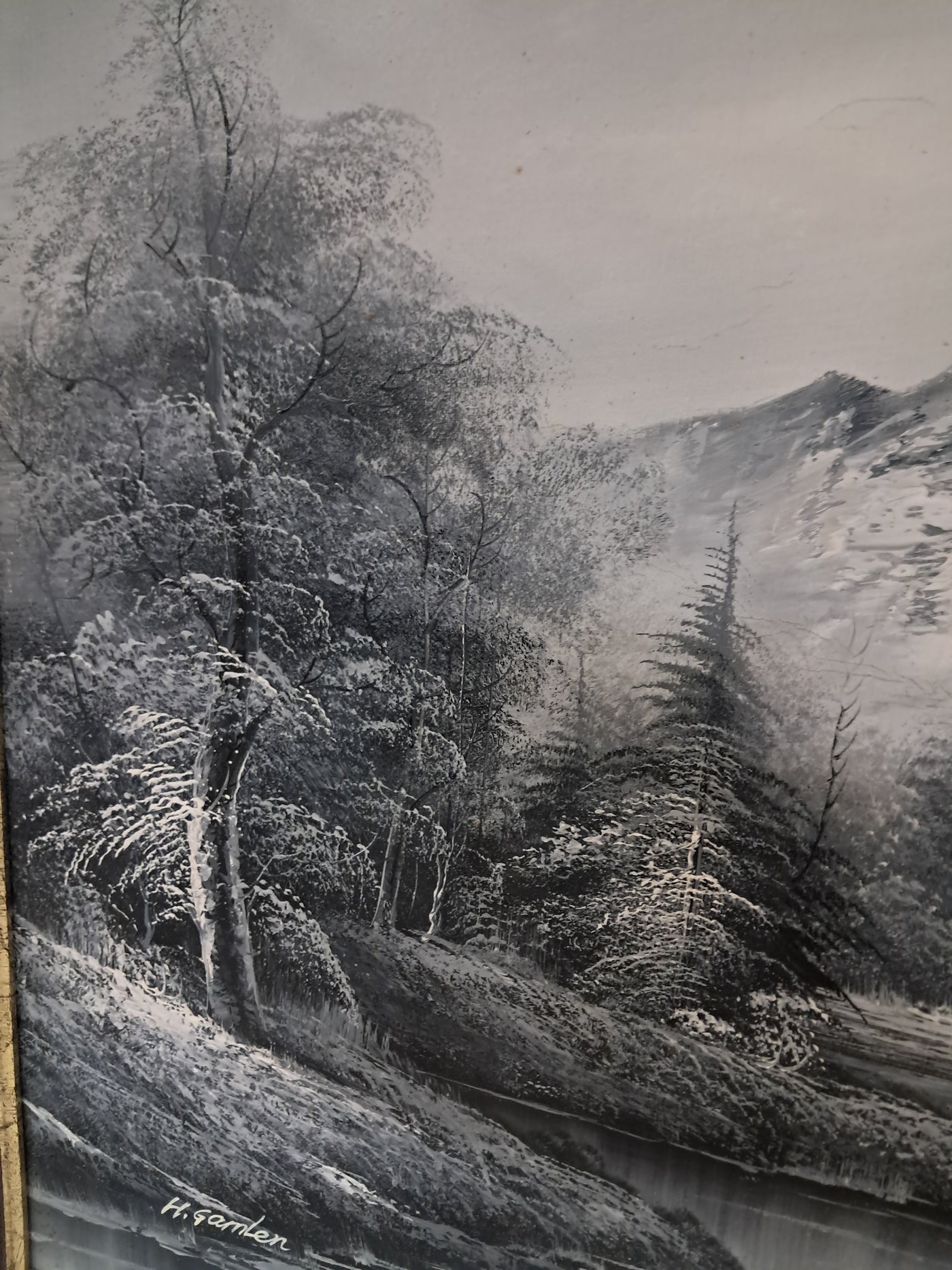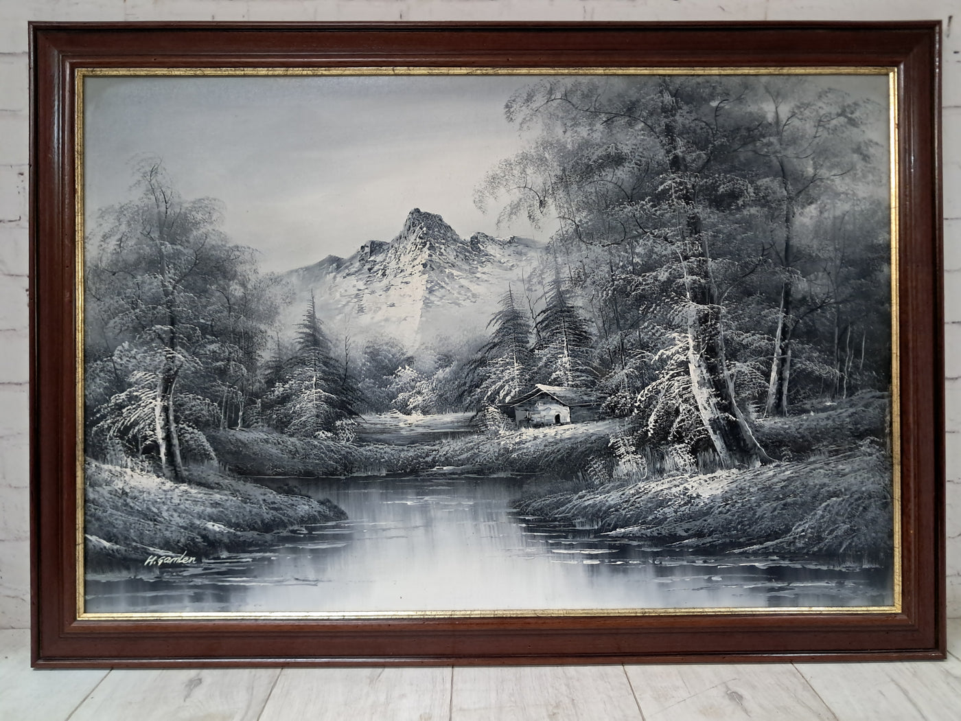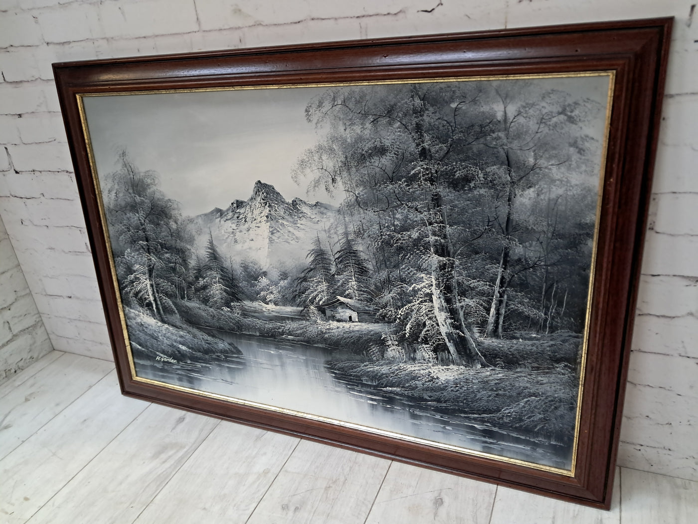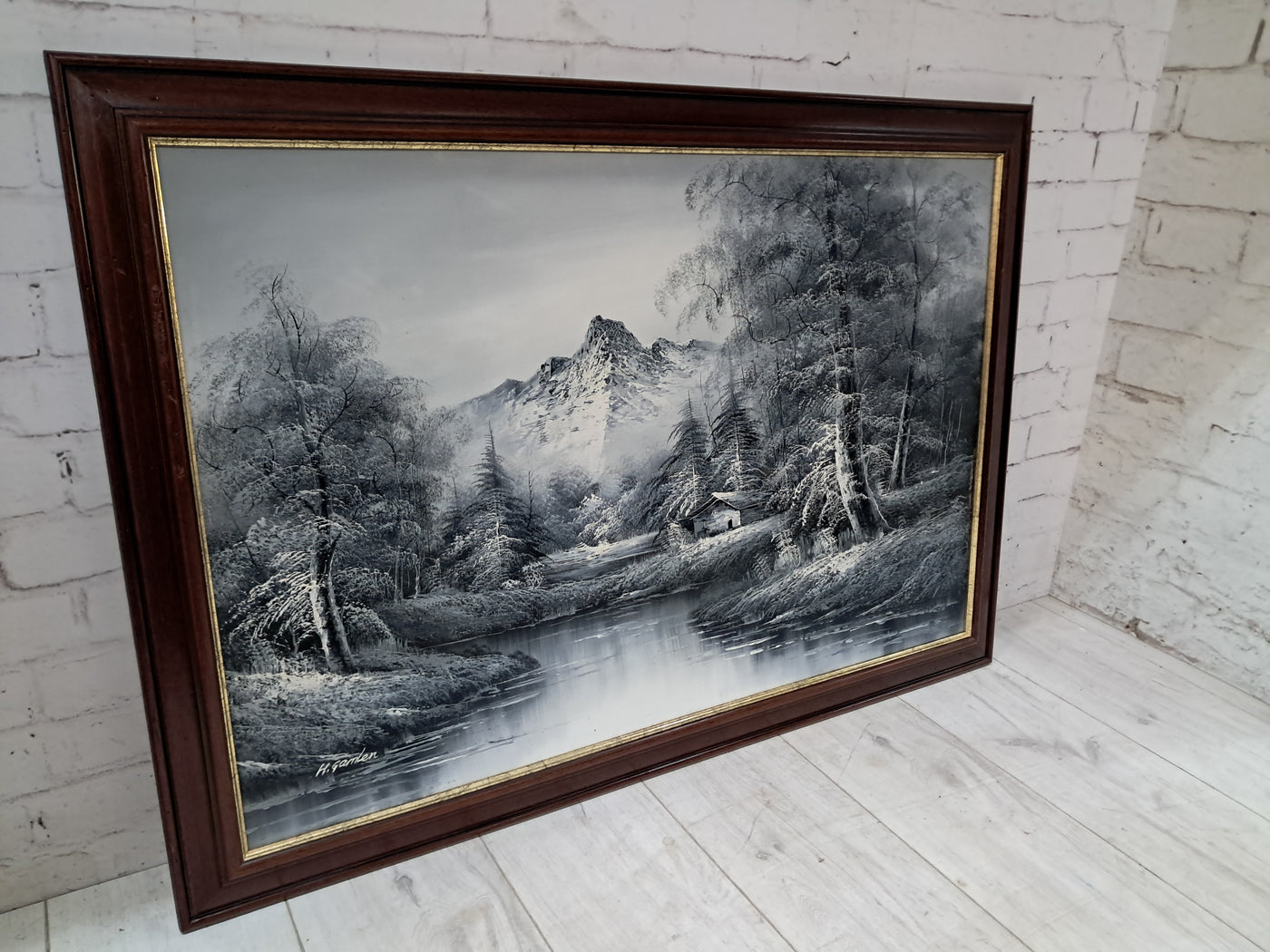 {"id":15606234775930,"title":"Large Oil Painting Black \u0026 White Winter Landscape On Canvas H Gamlen 1980 Framed","handle":"large-oil-painting-black-white-winter-landscape-on-canvas-h-gamlen-1980-framed","description":"\u003cdiv\u003e\n\u003cdiv\u003e\n\u003cdiv\u003e\u003cstrong\u003eLarge Vintage Black \u0026amp; White Winter Landscape Oil Painting On Canvas by H. Gamlen – 1980s – Framed \u0026amp; Signed\u003c\/strong\u003e\u003c\/div\u003e\n\u003cdiv\u003e\u003cbr\u003e\u003c\/div\u003e\n\u003cdiv\u003eThis large and atmospheric black and white winter landscape oil painting, signed by H. Gamlen and dating from the 1980s, is a striking and evocative work that brings a sense of calm, depth, and quiet drama to any interior. It is in superb condition.\u003c\/div\u003e\n\u003cdiv\u003e\u003cbr\u003e\u003c\/div\u003e\n\u003cdiv\u003eThe composition centres on a tranquil river winding through a snow-covered woodland, leading the eye towards a softly misted mountain in the distance. Bare winter trees frame the scene beautifully, their frost-laden branches rendered with delicate detail. Nestled discreetly among the trees is a small woodland cabin, adding warmth and narrative to the otherwise untouched landscape.\u003c\/div\u003e\n\u003cdiv\u003e\u003cbr\u003e\u003c\/div\u003e\n\u003cdiv\u003eThe restrained monochrome palette enhances the mood of the painting, allowing light, texture, and contrast to take precedence. It is easy to imagine sitting inside that secluded cabin on a cold winter’s day, the glow of a log fire inside while the frozen stillness outside remains undisturbed. The painting has a timeless, contemplative quality that invites the viewer to pause and escape.\u003c\/div\u003e\n\u003cdiv\u003e\u003cbr\u003e\u003c\/div\u003e\n\u003cdiv\u003ePresented in a substantial mahogany frame with an elegant speckled gold inner border, the artwork has a strong and confident presence. The frame complements the painting perfectly, adding warmth and refinement without overpowering the composition.\u003c\/div\u003e\n\u003cdiv\u003e\u003cbr\u003e\u003c\/div\u003e\n\u003cdiv\u003eThis is a commanding piece, ideal as a focal point above a fireplace, in a living room, study, or country home interior. It will appeal to collectors, interior designers, and those who appreciate expressive landscape art with atmosphere and narrative.\u003c\/div\u003e\n\u003cdiv\u003e\u003cb\u003e\u003cbr\u003e\u003c\/b\u003e\u003c\/div\u003e\n\u003cdiv\u003e\u003cb\u003eMeasurements:\u003c\/b\u003e\u003c\/div\u003e\n\u003cdiv\u003eOverall including frame: 103cm L x 72cm H x 3cm D\u003c\/div\u003e\n\u003cdiv\u003eActual canvas: 90cm L x 60cm H\u003c\/div\u003e\n\u003cdiv\u003e\u003cbr\u003e\u003c\/div\u003e\n\u003cdiv\u003eOur motto is to reuse and recycle these wonderful antique and vintage items so that they get a new lease of life and at the same time you will have a unique, personal item of good quality in your home that will also contribute to the world's carbon footprint. We owe it to our future generations NOT to be a throwaway society.\u003c\/div\u003e\n\u003cdiv\u003e\u003cbr\u003e\u003c\/div\u003e\n\u003cdiv\u003eThe delivery quoted in this listing is for mainland UK only.\u003c\/div\u003e\n\u003cdiv\u003ePlease contact us for a delivery quote to Cornwall, Scotland, Highlands or Islands or Offshore UK, Northern Ireland, Jersey, Guernsey, IOW, etc as it may be more than the price quoted.\u003c\/div\u003e\n\u003cdiv\u003e\u003cbr\u003e\u003c\/div\u003e\n\u003cdiv\u003eThis item is available to view at our showroom RetroNovia , 12 New Pond Parade, West End Road, Ruislip Gardens, Middlesex HA4 6LR . Please call us on 01895 675596 to make sure the item is available before coming to view.\u003c\/div\u003e\n\u003cdiv\u003e\u003cbr\u003e\u003c\/div\u003e\n\u003cdiv\u003eWe are located easy access from London and Oxford and are directly off the Main A40 Polish War memorial junction.\u003c\/div\u003e\n\u003c\/div\u003e\n\u003c\/div\u003e","published_at":"2026-01-07T11:32:36+00:00","created_at":"2026-01-07T11:32:36+00:00","vendor":"H Gamlen","type":"Art","tags":["Art","Impressionist","Oil Painting","Woodland"],"price":15000,"price_min":15000,"price_max":15000,"available":true,"price_varies":false,"compare_at_price":null,"compare_at_price_min":0,"compare_at_price_max":0,"compare_at_price_varies":false,"variants":[{"id":56428048187770,"title":"Default Title","option1":"Default Title","option2":null,"option3":null,"sku":"1551","requires_shipping":true,"taxable":false,"featured_image":null,"available":true,"name":"Large Oil Painting Black \u0026 White Winter Landscape On Canvas H Gamlen 1980 Framed","public_title":null,"options":["Default Title"],"price":15000,"weight":50000,"compare_at_price":null,"inventory_management":"shopify","barcode":null,"requires_selling_plan":false,"selling_plan_allocations":[]}],"images":["\/\/retronovia.co.uk\/cdn\/shop\/files\/Oil_on_canvas_black_and_white_landscape_1.jpg?v=1767785623","\/\/retronovia.co.uk\/cdn\/shop\/files\/Oil_on_canvas_black_and_white_landscape_2.jpg?v=1767785623","\/\/retronovia.co.uk\/cdn\/shop\/files\/Oil_on_canvas_black_and_white_landscape_3.jpg?v=1767785623","\/\/retronovia.co.uk\/cdn\/shop\/files\/Oil_on_canvas_black_and_white_landscape_4.jpg?v=1767785623","\/\/retronovia.co.uk\/cdn\/shop\/files\/Oil_on_canvas_black_and_white_landscape_5.jpg?v=1767785622","\/\/retronovia.co.uk\/cdn\/shop\/files\/Oil_on_canvas_black_and_white_landscape_6.jpg?v=1767785623","\/\/retronovia.co.uk\/cdn\/shop\/files\/Oil_on_canvas_black_and_white_landscape_7.jpg?v=1767785622","\/\/retronovia.co.uk\/cdn\/shop\/files\/Oil_on_canvas_black_and_white_landscape_8.jpg?v=1767785622","\/\/retronovia.co.uk\/cdn\/shop\/files\/Oil_on_canvas_black_and_white_landscape_9.jpg?v=1767785622","\/\/retronovia.co.uk\/cdn\/shop\/files\/Oil_on_canvas_black_and_white_landscape_10.jpg?v=1767785623","\/\/retronovia.co.uk\/cdn\/shop\/files\/Oil_on_canvas_black_and_white_landscape_11.jpg?v=1767785622","\/\/retr