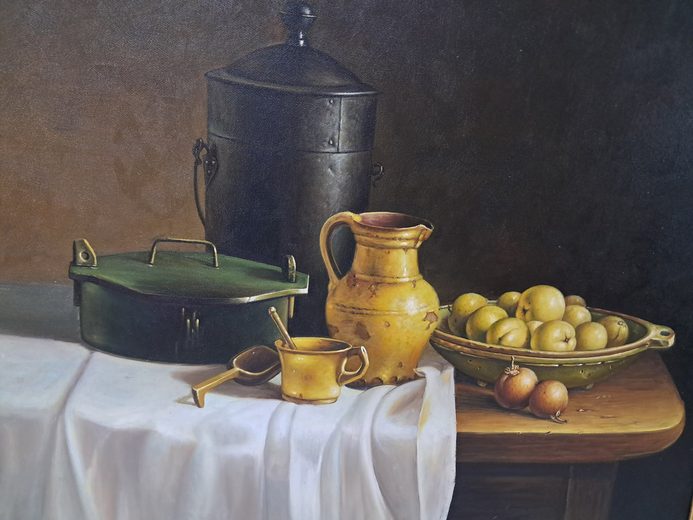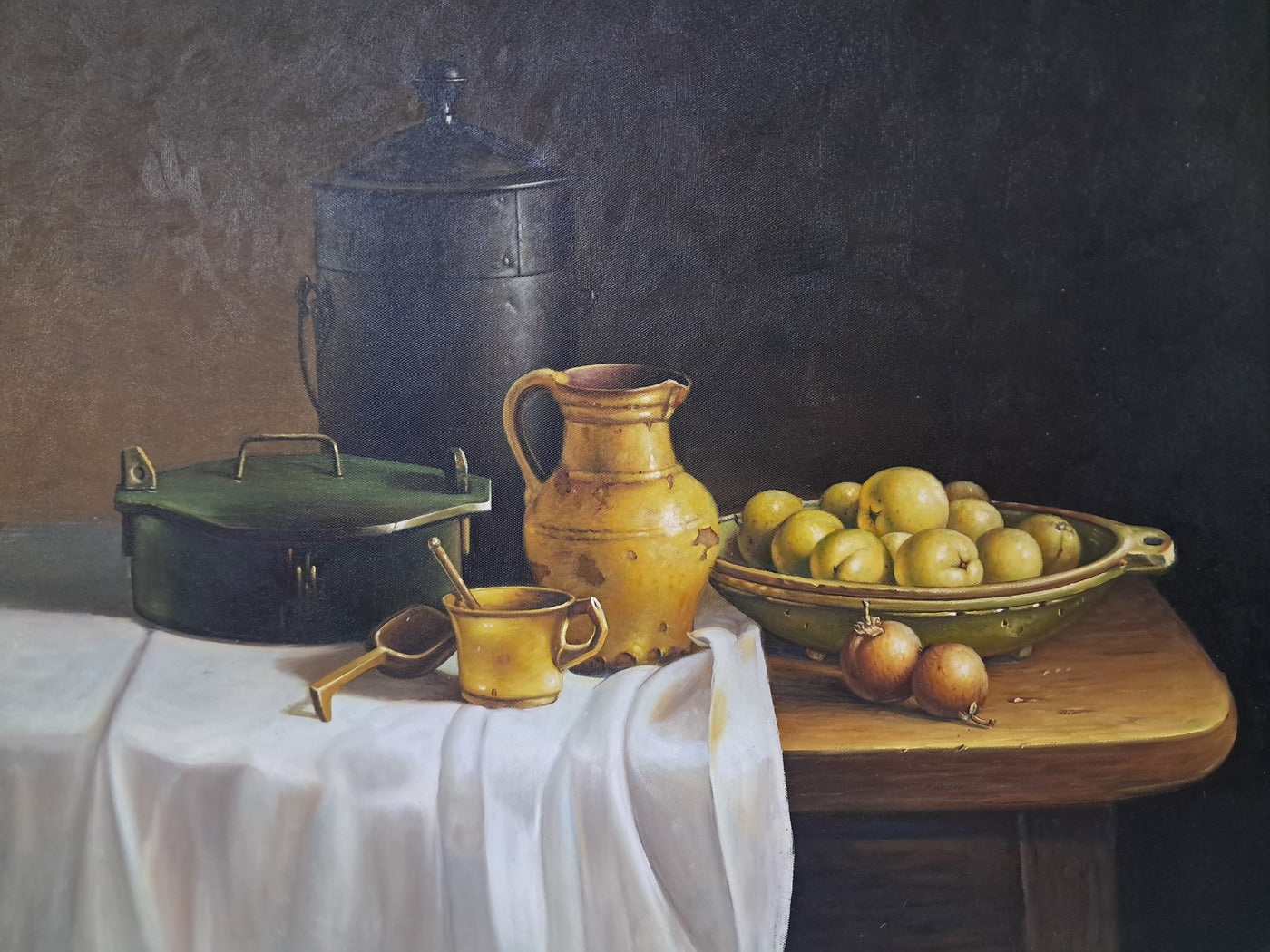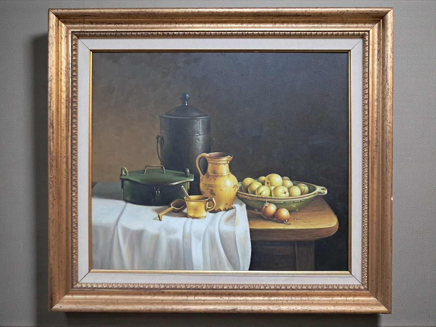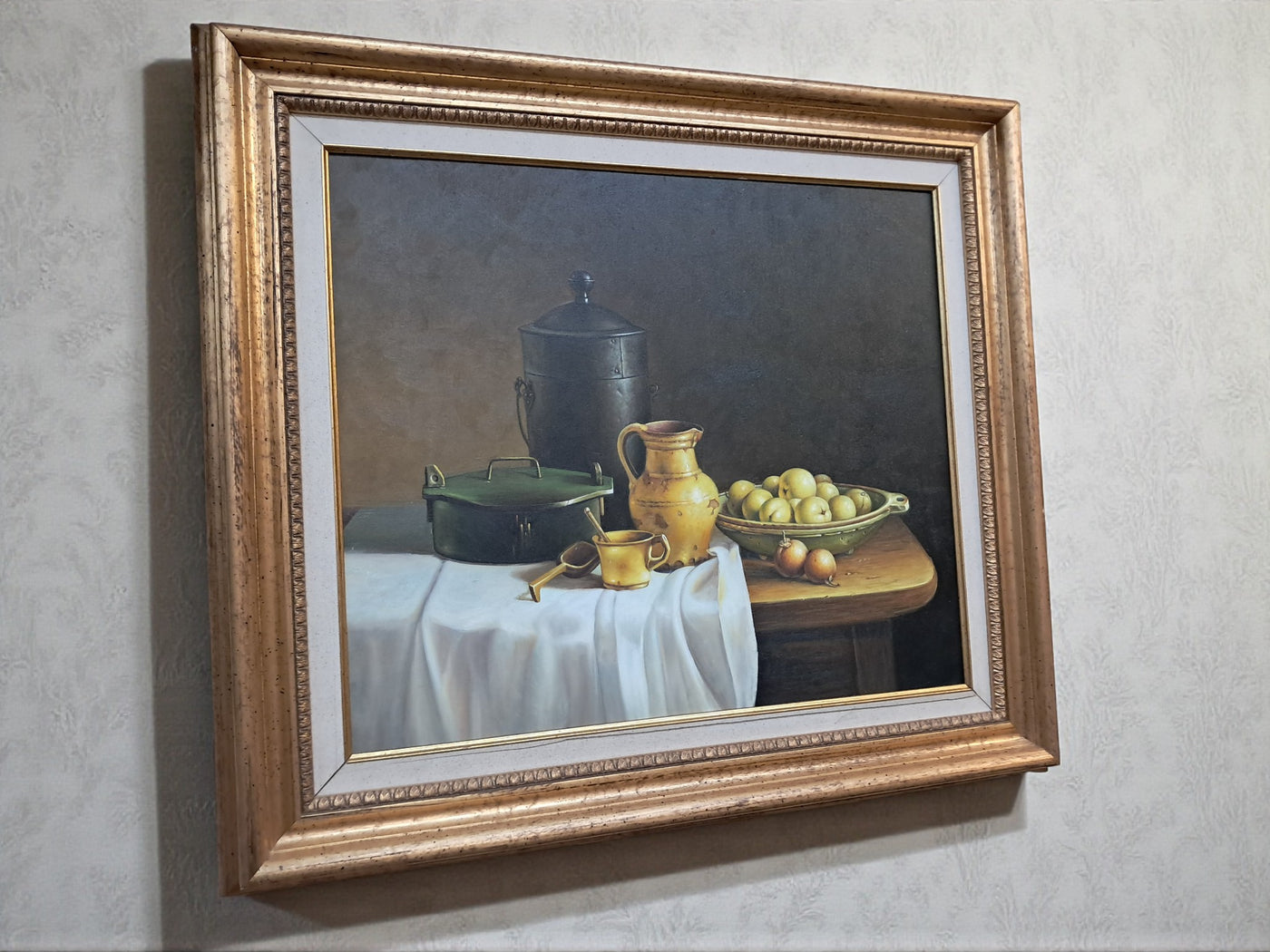 {"id":15606256370042,"title":"Vintage Still Life Oil Painting Canvas Fruit Framed Classical Table Top Scene 1980","handle":"vintage-still-life-oil-painting-canvas-fruit-framed-classical-table-top-scene-1980","description":"\u003cdiv\u003e\n\u003cdiv\u003e\u003cstrong\u003eVintage Still Life Oil Painting on Canvas Gilt Gold Frame Classical Table Top Scene 1980\u003c\/strong\u003e\u003c\/div\u003e\n\u003cdiv\u003e\n\u003cdiv\u003e\u003cbr\u003e\u003c\/div\u003e\n\u003cdiv\u003eThis beautifully composed oil on canvas still life exudes a quiet, classical elegance that will appeal to discerning collectors and lovers of traditional interior styling. This beautifully composed oil on canvas still life exudes a quiet, classical elegance that will appeal to discerning collectors and lovers of traditional interior styling. It is in superb condition.\u003c\/div\u003e\n\u003cdiv\u003e\u003cbr\u003e\u003c\/div\u003e\n\u003cdiv\u003eSet against a dark, atmospheric backdrop, the composition centres on a carefully arranged table top scene: a warm ochre ceramic jug, a lidded metal vessel, a green-painted box, and a shallow bowl of gently glowing fruit. A softly draped white cloth falls over the edge of the table, its subtle folds catching the light and creating a refined contrast with the deeper, earthy tones of the objects around it. The detailing throughout is exceptionally well observed, with crisp yet delicate definition that gives the piece a sense of depth, balance, and quiet realism.\u003c\/div\u003e\n\u003cdiv\u003e\u003cbr\u003e\u003c\/div\u003e\n\u003cdiv\u003eThe painting is presented in an impressive gold gilt wooden frame, delicately flecked and naturally patinated, enhancing its timeless appeal and giving the artwork a refined, gallery-quality presence. It would sit beautifully in a dining room, kitchen, study, or elegant hallway, adding warmth, character, and a sense of classical sophistication to the space.\u003c\/div\u003e\n\u003cdiv\u003e\u003cbr\u003e\u003c\/div\u003e\n\u003cdiv\u003e\u003cb\u003eMeasurements\u003c\/b\u003e\u003c\/div\u003e\n\u003cdiv\u003eOverall, including frame: 77cm L x 72cm H x 7cm D\u003c\/div\u003e\n\u003cdiv\u003eActual canvas: 60cm L x 50cm H\u003c\/div\u003e\n\u003cdiv\u003e\u003cbr\u003e\u003c\/div\u003e\n\u003cdiv\u003eOur motto is to reuse and recycle these wonderful antique and vintage items so that they get a new lease of life and at the same time you will have a unique, personal item of good quality in your home that will also contribute to the world's carbon footprint. We owe it to our future generations NOT to be a throwaway society. \u003c\/div\u003e\n\u003cdiv\u003e\u003cbr\u003e\u003c\/div\u003e\n\u003cdiv\u003eThe delivery quoted in this listing is for mainland UK only.\u003c\/div\u003e\n\u003cdiv\u003ePlease contact us for a delivery quote to Cornwall, Scotland, Highlands or Islands or Offshore UK, Northern Ireland, Jersey, Guernsey, IOW, etc as it may be more than the price quoted.\u003c\/div\u003e\n\u003cdiv\u003e\u003cbr\u003e\u003c\/div\u003e\n\u003cdiv\u003eThis item is available to view at our showroom RetroNovia , 12 New Pond Parade, West End Road, Ruislip Gardens, Middlesex HA4 6LR . Please call us on 01895 675596 to make sure the item is available before coming to view.\u003c\/div\u003e\n\u003cdiv\u003e\u003cbr\u003e\u003c\/div\u003e\n\u003cdiv\u003eWe are located easy access from London and Oxford and are directly off the Main A40 Polish War memorial junction.\u003c\/div\u003e\n\u003c\/div\u003e\n\u003c\/div\u003e","published_at":"2026-01-07T11:49:13+00:00","created_at":"2026-01-07T11:49:13+00:00","vendor":"RetroNovia","type":"Art","tags":["Art","Impressionist","Oil Painting","Woodland"],"price":25000,"price_min":25000,"price_max":25000,"available":true,"price_varies":false,"compare_at_price":null,"compare_at_price_min":0,"compare_at_price_max":0,"compare_at_price_varies":false,"variants":[{"id":56428102156666,"title":"Default Title","option1":"Default Title","option2":null,"option3":null,"sku":null,"requires_shipping":true,"taxable":false,"featured_image":null,"available":true,"name":"Vintage Still Life Oil Painting Canvas Fruit Framed Classical Table Top Scene 1980","public_title":null,"options":["Default Title"],"price":25000,"weight":50000,"compare_at_price":null,"inventory_management":"shopify","barcode":null,"requires_selling_plan":false,"selling_plan_allocations":[]}],"images":["\/\/retronovia.co.uk\/cdn\/shop\/files\/oil_painting_still_life_fruit_1.jpg?v=1767786606","\/\/retronovia.co.uk\/cdn\/shop\/files\/oil_painting_still_life_fruit_33.jpg?v=1767786687","\/\/retronovia.co.uk\/cdn\/shop\/files\/oil_painting_still_life_fruit_32.jpg?v=1767786687","\/\/retronovia.co.uk\/cdn\/shop\/files\/oil_painting_still_life_fruit_1a.jpg?v=1767786687","\/\/retronovia.co.uk\/cdn\/shop\/files\/oil_painting_still_life_fruit_17.jpg?v=1767786687","\/\/retronovia.co.uk\/cdn\/shop\/files\/oil_painting_still_life_fruit_18.jpg?v=1767786687","\/\/retronovia.co.uk\/cdn\/shop\/files\/oil_painting_still_life_fruit_19.jpg?v=1767786687","\/\/retronovia.co.uk\/cdn\/shop\/files\/oil_painting_still_life_fruit_20.jpg?v=1767786687","\/\/retronovia.co.uk\/cdn\/shop\/files\/oil_painting_still_life_fruit_21.jpg?v=1767786687","\/\/retronovia.co.uk\/cdn\/shop\/files\/oil_painting_still_life_fruit_22.jpg?v=1767786687","\/\/retronovia.co.uk\/cdn\/shop\/files\/oil_painting_still_life_fruit_23.jpg?v=1767786687","\/\/retronovia.co.uk\/cdn\/shop\/files\/oil_painting_still_life_fruit_24.jpg?v=1767786687","\/\/retronovia.co.uk\/cdn\/shop\/files\/oil_painting_still_life_fruit_25.jpg?v=1767786687","\/\/retronovia.co.uk\/cdn\/shop\/files\/oil_painting_still_life_fruit_26.jpg?v=1767786687","\/\/retronovia.co.uk\/cdn\/shop\/files\/oil_painting_still_life_fruit_27.jpg?v=1767786687","\/\/retronovia.co.uk\/cdn\/shop\/files\/oil_painting_still_life_fruit_28.jpg?v=1767786687","\/\/retronovia.co.uk\/cdn\/shop\/files\/oil_painting_still_life_fruit_29.jpg?v=1767786687","\/\/retronovia.co.u