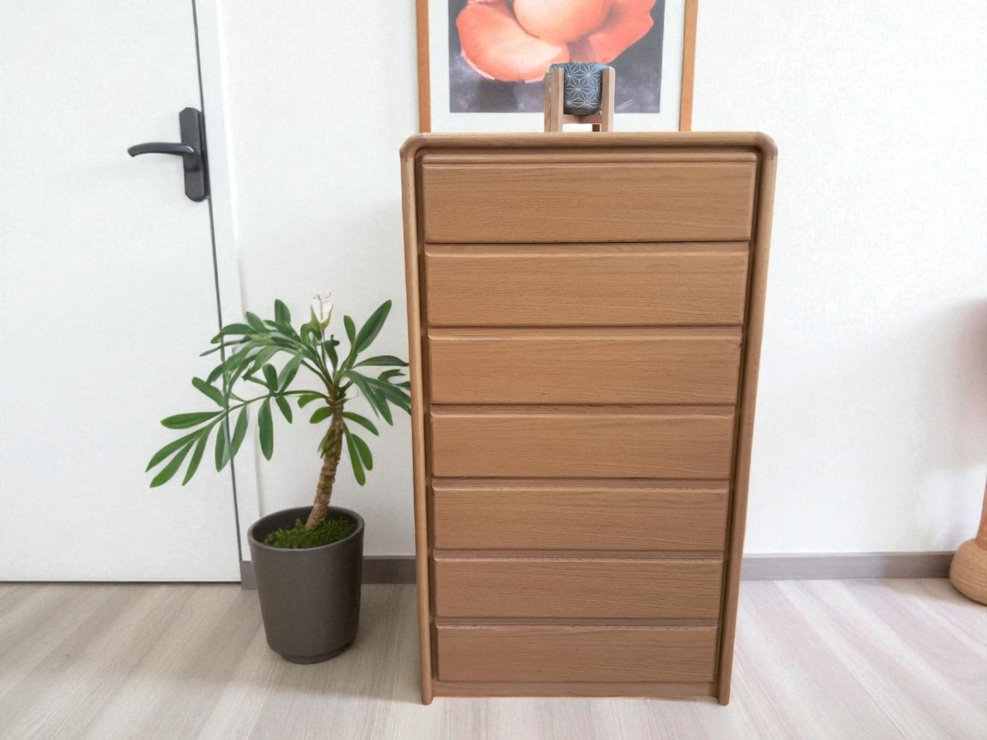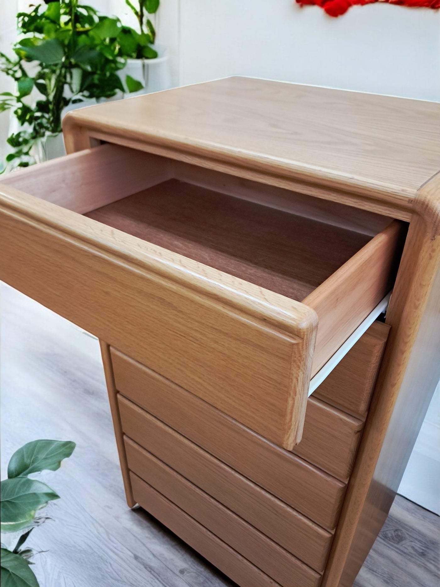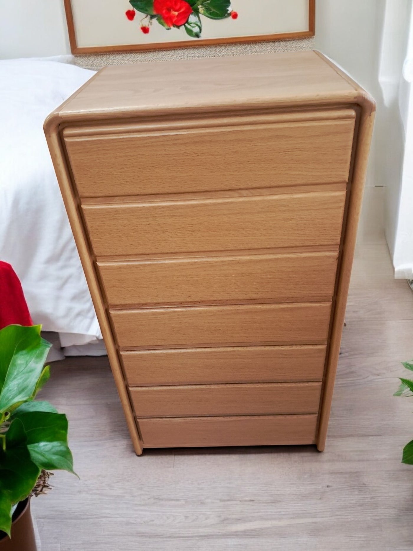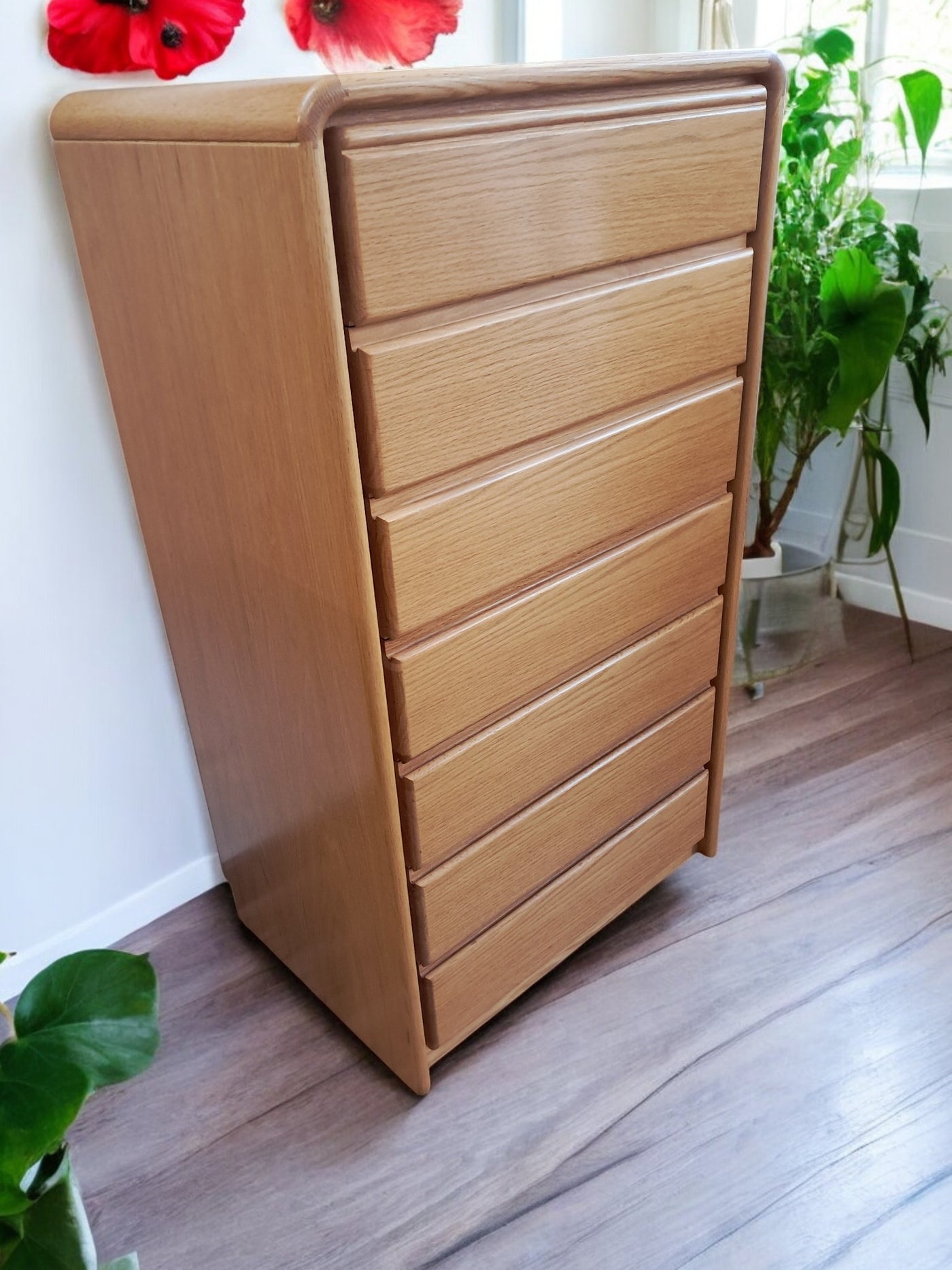 A beautifully crafted 1990s Danish mid-century style tallboy chest of drawers, made from solid oak with exceptional attention to detail. This striking piece features seven smoothly sliding drawers, framed within an elegantly curved body that eliminates sharp corners, giving it a uniquely streamlined and sculptural appearance.