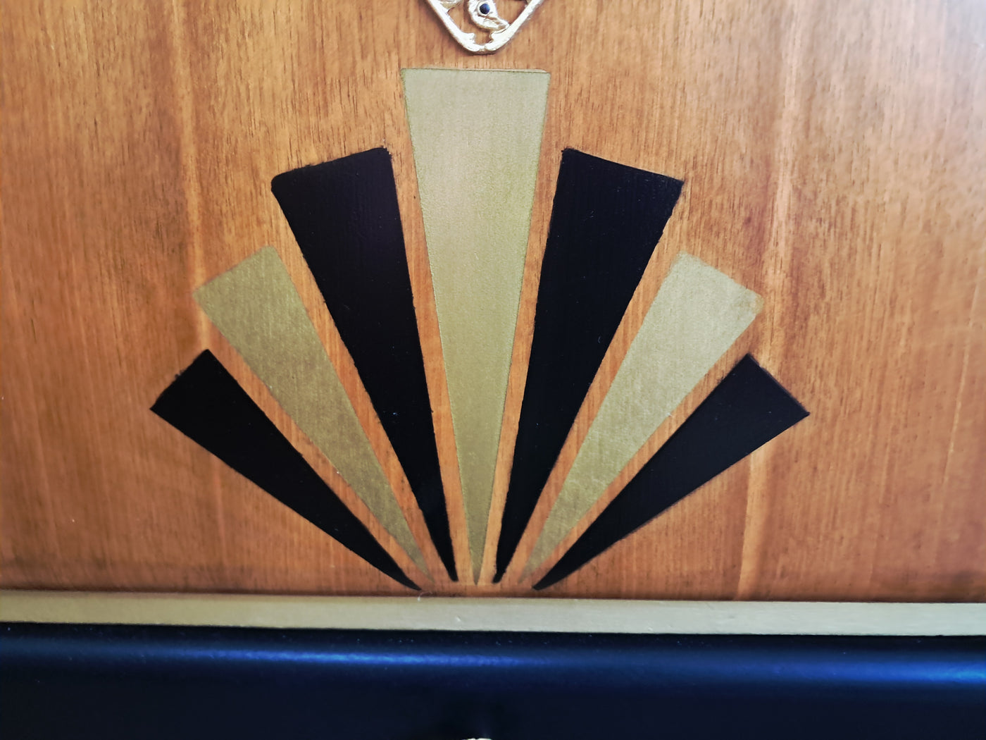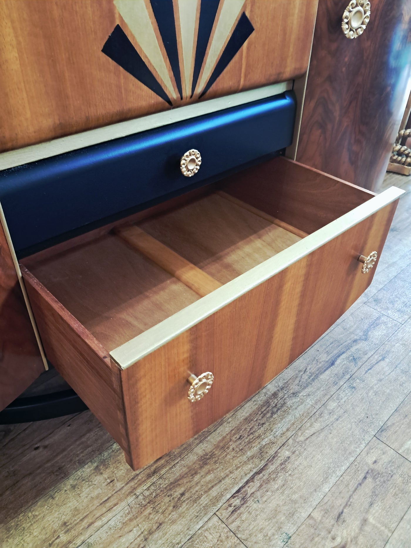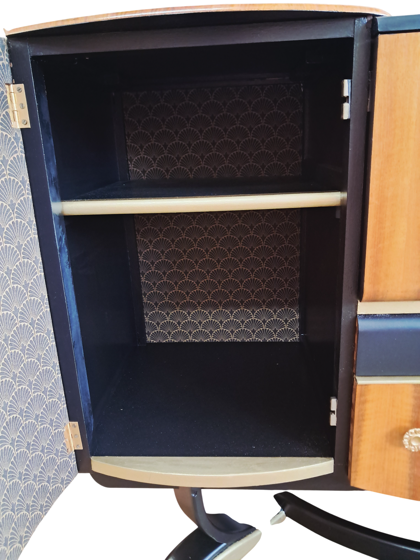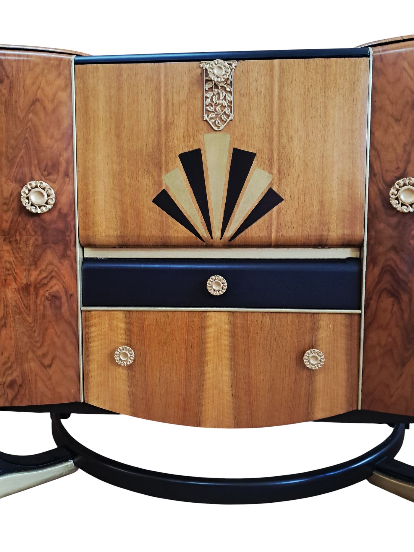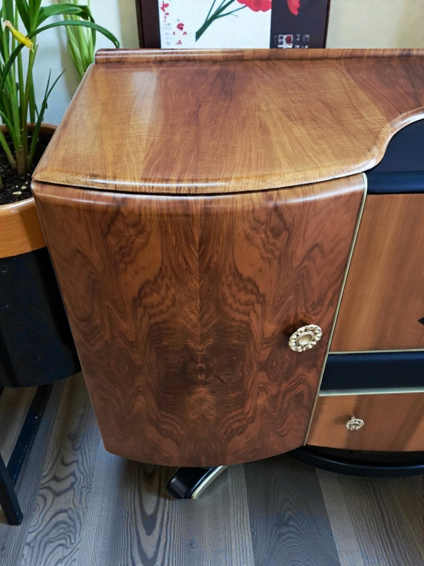 Lovingly restored by our in-house designer, Hawkeye, this cabinet has been finished using premium black mineral paint and refined gold stencilling to enhance its Art Deco character. The piece remains predominantly walnut veneer, showcasing beautifully figured grain, with carefully considered black and gold detailing used to accent and elevate the original design rather than overpower it. A striking gold Art Deco–inspired motif has been applied to the pull-down drinks cabinet, adding visual drama and period charm. To ensure longevity as well as beauty, the entire piece has been sealed with multiple coats of high-quality matt varnish, offering excellent protection and ensuring it remains in tip-top condition for years to come.