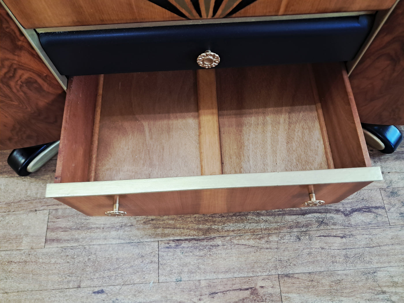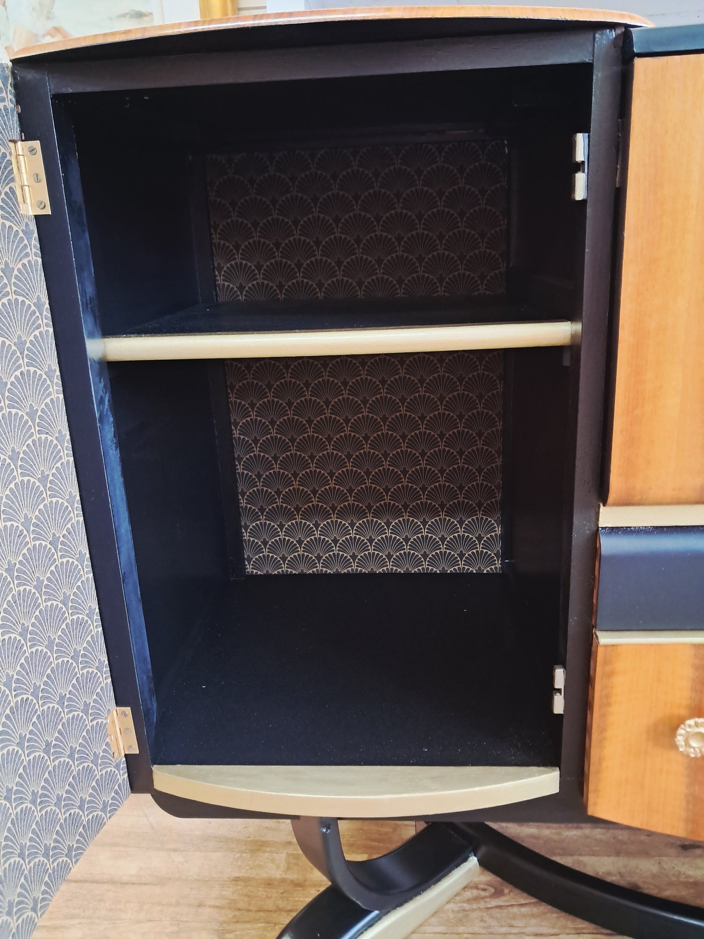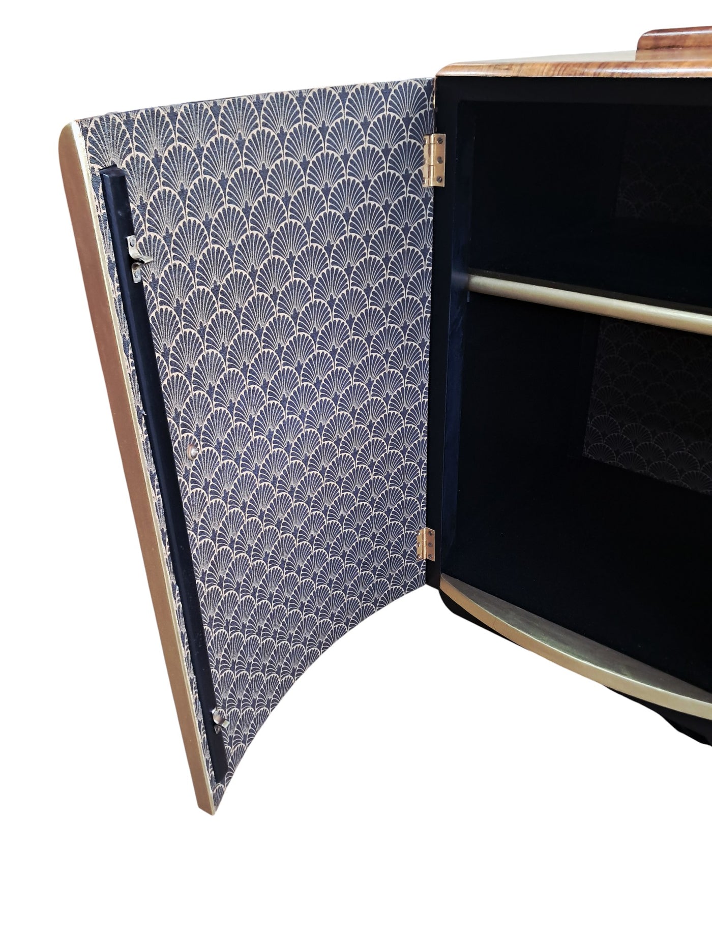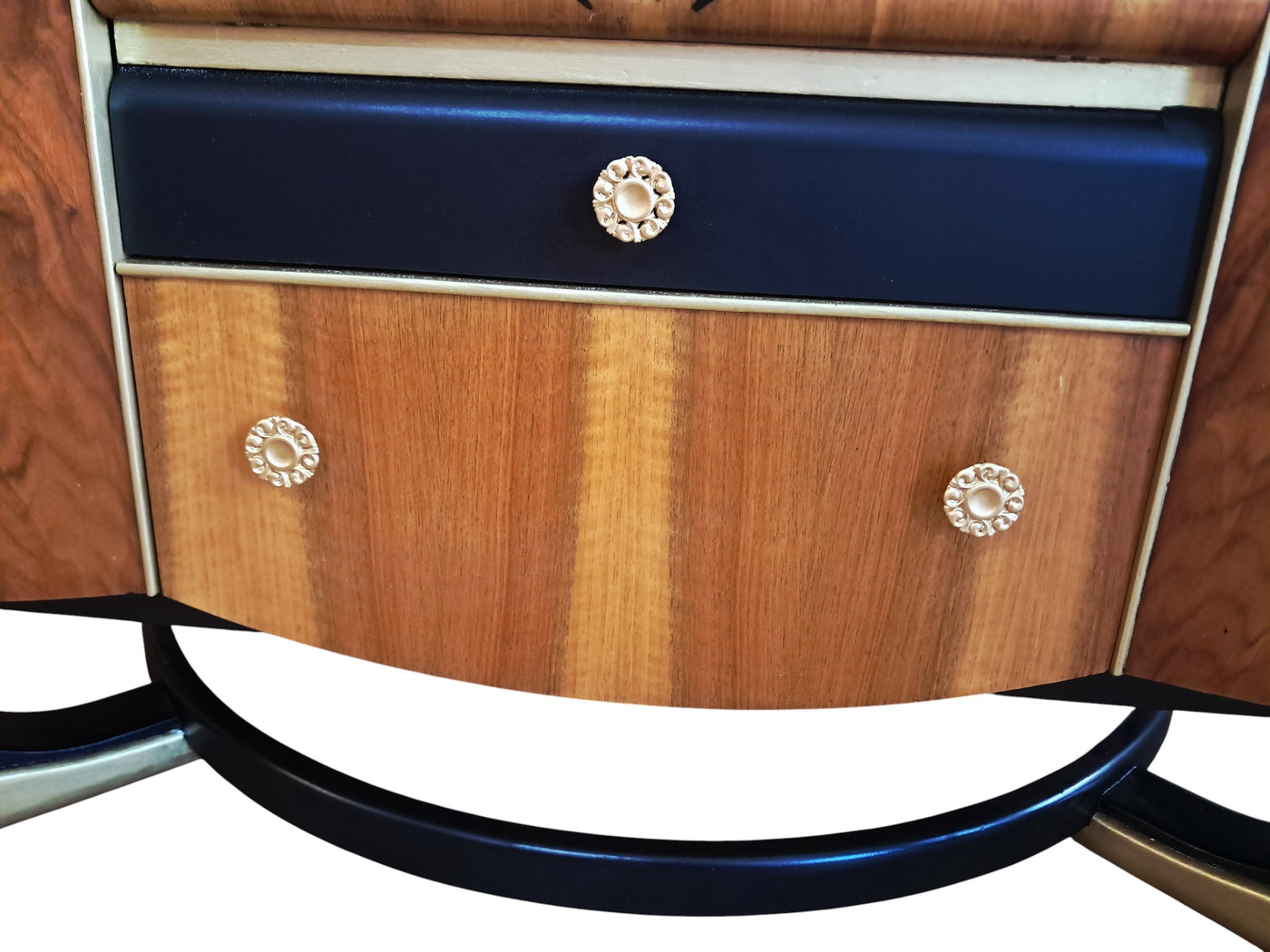 Lovingly restored by our in-house designer, Hawkeye, this cabinet has been finished using premium black mineral paint and refined gold stencilling to enhance its Art Deco character. The piece remains predominantly walnut veneer, showcasing beautifully figured grain, with carefully considered black and gold detailing used to accent and elevate the original design rather than overpower it. A striking gold Art Deco–inspired motif has been applied to the pull-down drinks cabinet, adding visual drama and period charm. To ensure longevity as well as beauty, the entire piece has been sealed with multiple coats of high-quality matt varnish, offering excellent protection and ensuring it remains in tip-top condition for years to come.