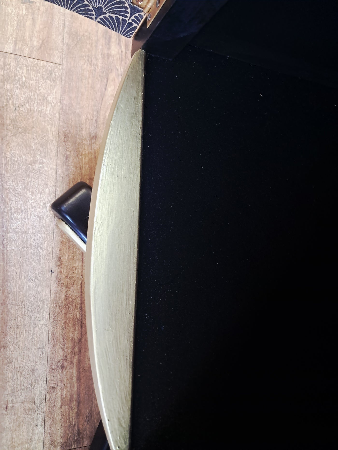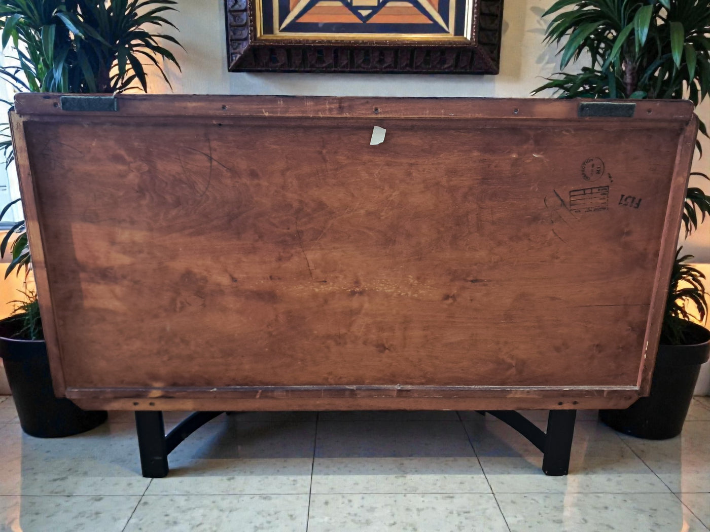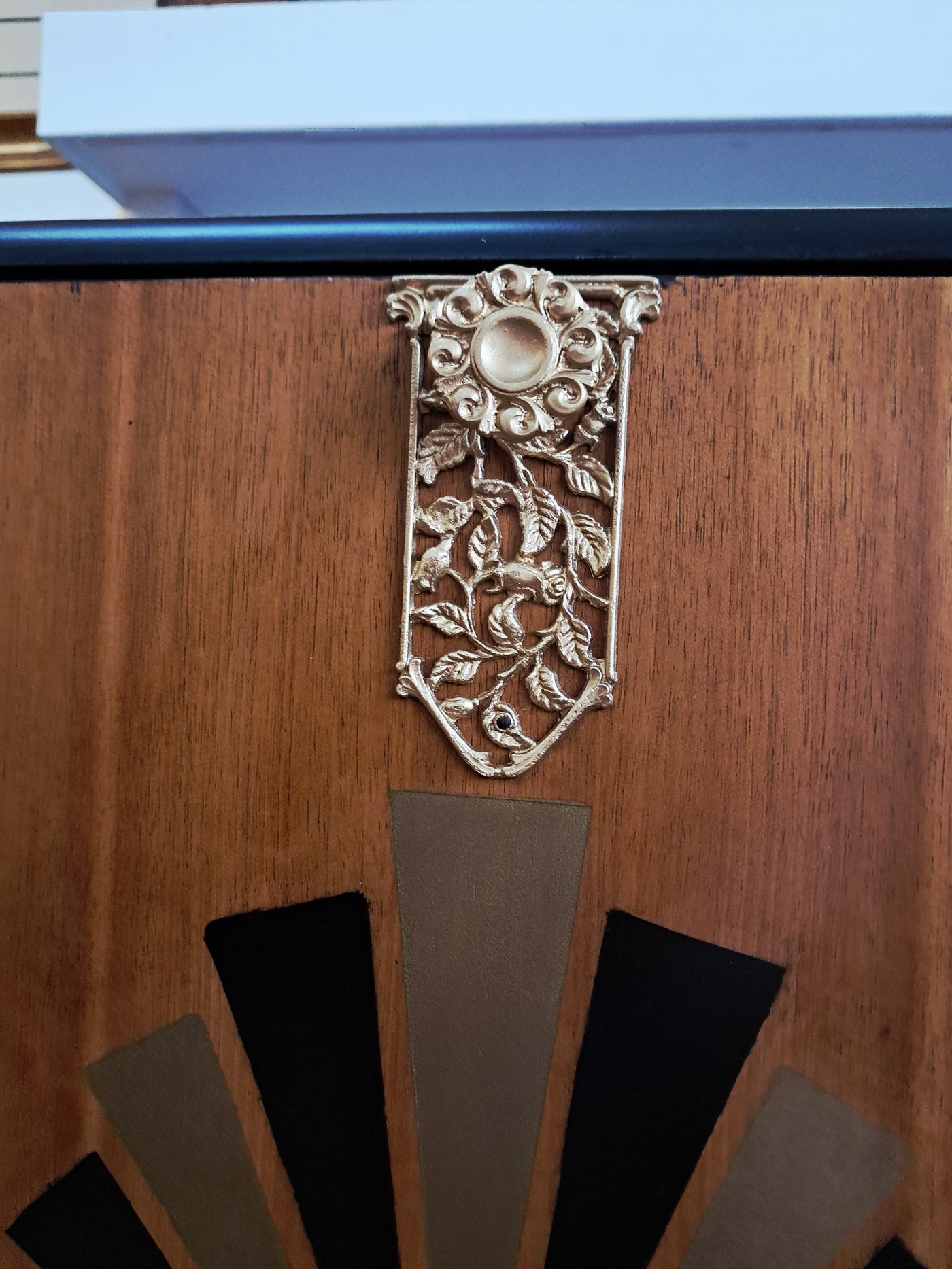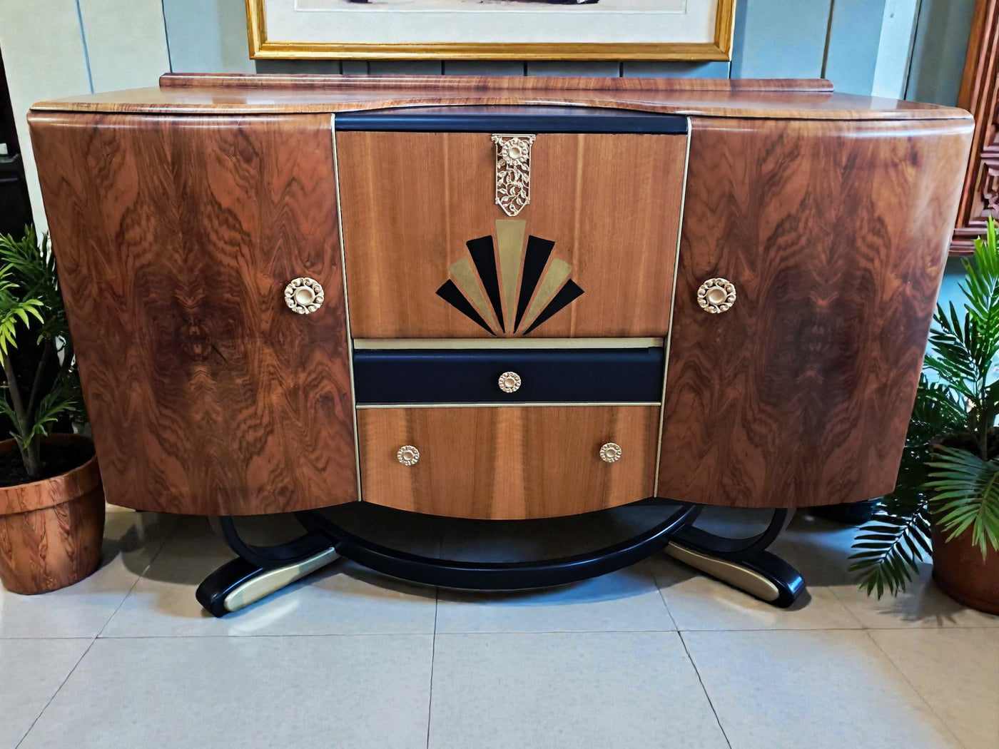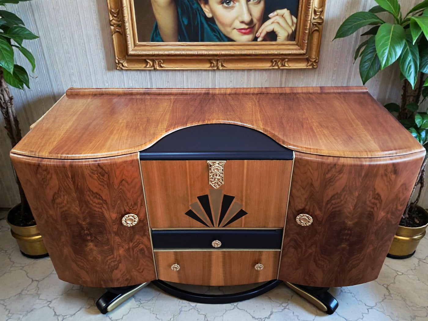 Lovingly restored by our in-house designer, Hawkeye, this cabinet has been finished using premium black mineral paint and refined gold stencilling to enhance its Art Deco character. The piece remains predominantly walnut veneer, showcasing beautifully figured grain, with carefully considered black and gold detailing used to accent and elevate the original design rather than overpower it. A striking gold Art Deco–inspired motif has been applied to the pull-down drinks cabinet, adding visual drama and period charm. To ensure longevity as well as beauty, the entire piece has been sealed with multiple coats of high-quality matt varnish, offering excellent protection and ensuring it remains in tip-top condition for years to come.
