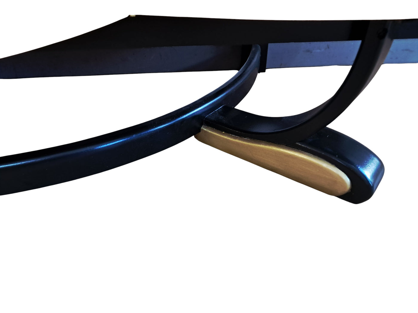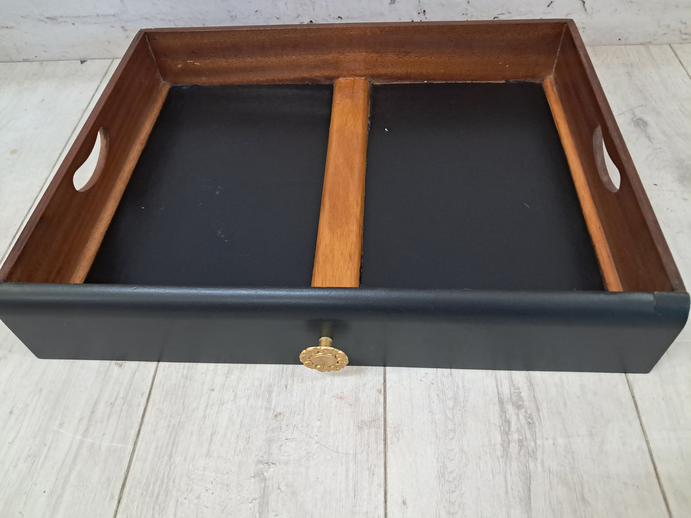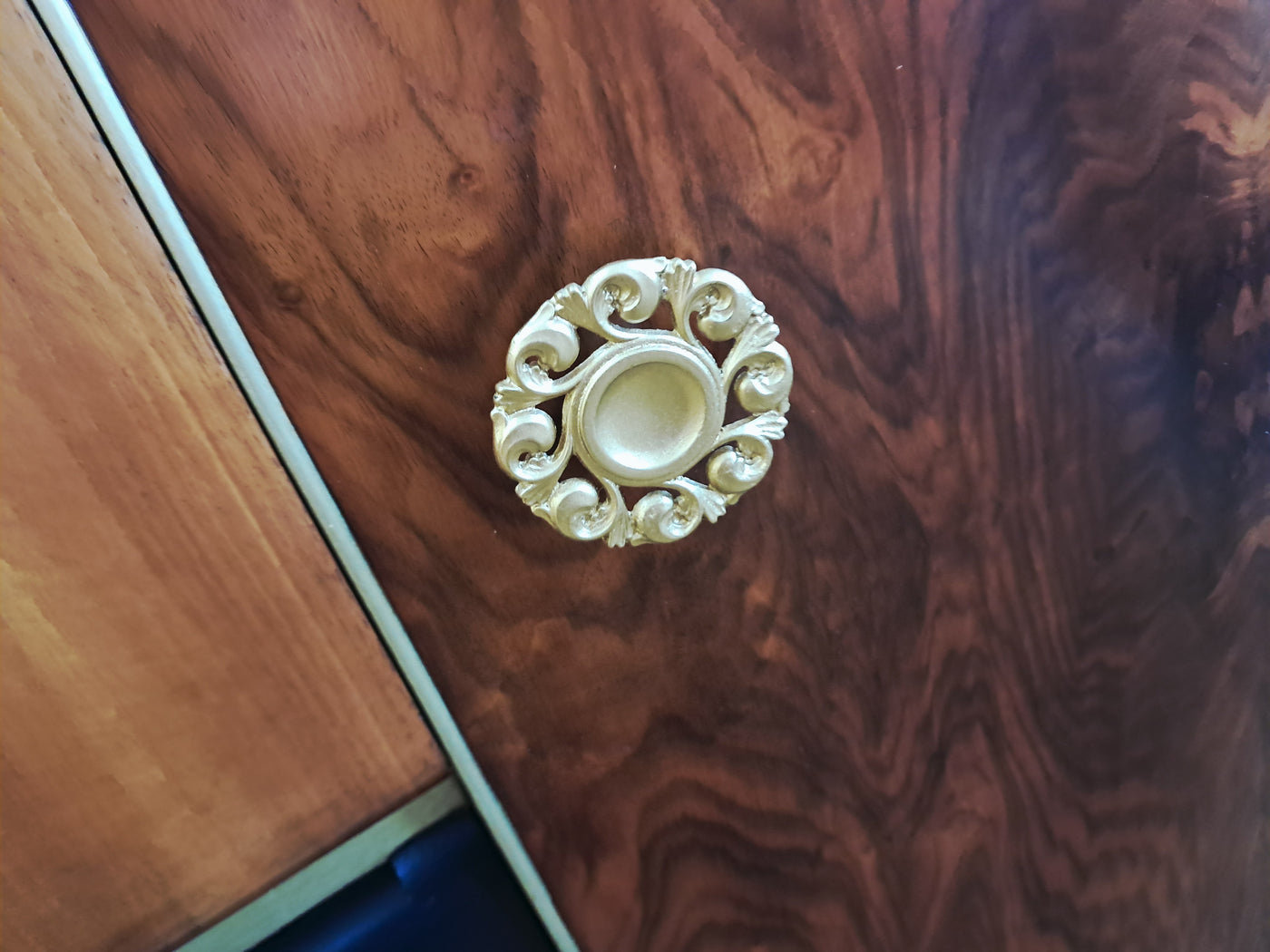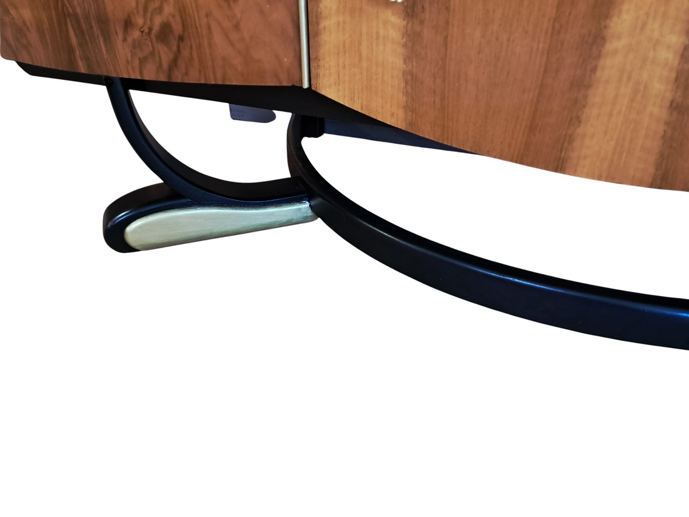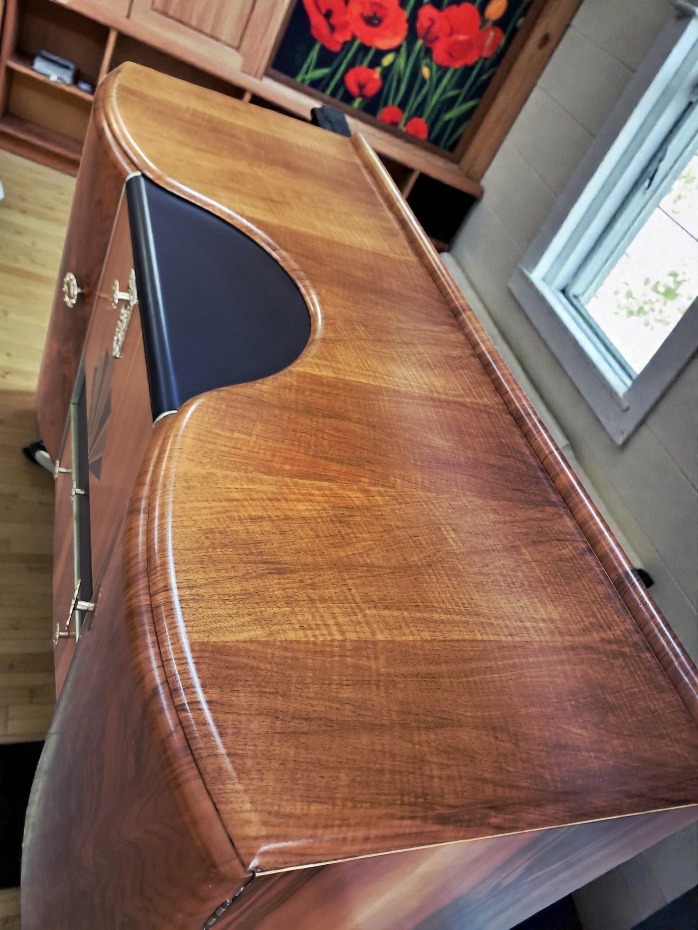 Lovingly restored by our in-house designer, Hawkeye, this cabinet has been finished using premium black mineral paint and refined gold stencilling to enhance its Art Deco character. The piece remains predominantly walnut veneer, showcasing beautifully figured grain, with carefully considered black and gold detailing used to accent and elevate the original design rather than overpower it. A striking gold Art Deco–inspired motif has been applied to the pull-down drinks cabinet, adding visual drama and period charm. To ensure longevity as well as beauty, the entire piece has been sealed with multiple coats of high-quality matt varnish, offering excellent protection and ensuring it remains in tip-top condition for years to come.