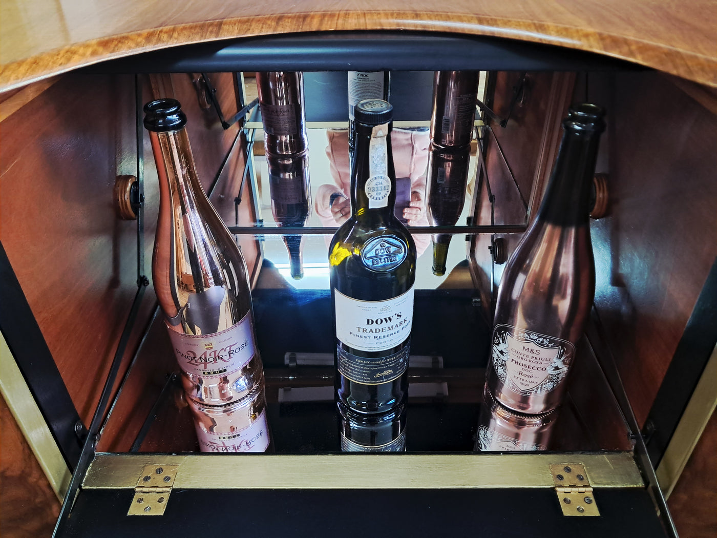 The central pull-down cocktail cabinet opens to reveal a mirrored interior, ideal for storing bottles, glassware and cocktail essentials. Below are two drawers: a spacious lower drawer and a cleverly designed middle drawer that fully extends and functions as a serving tray, complete with twin handles.