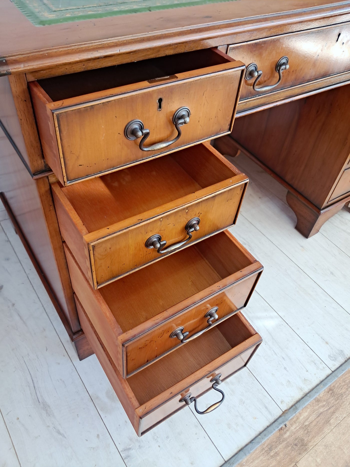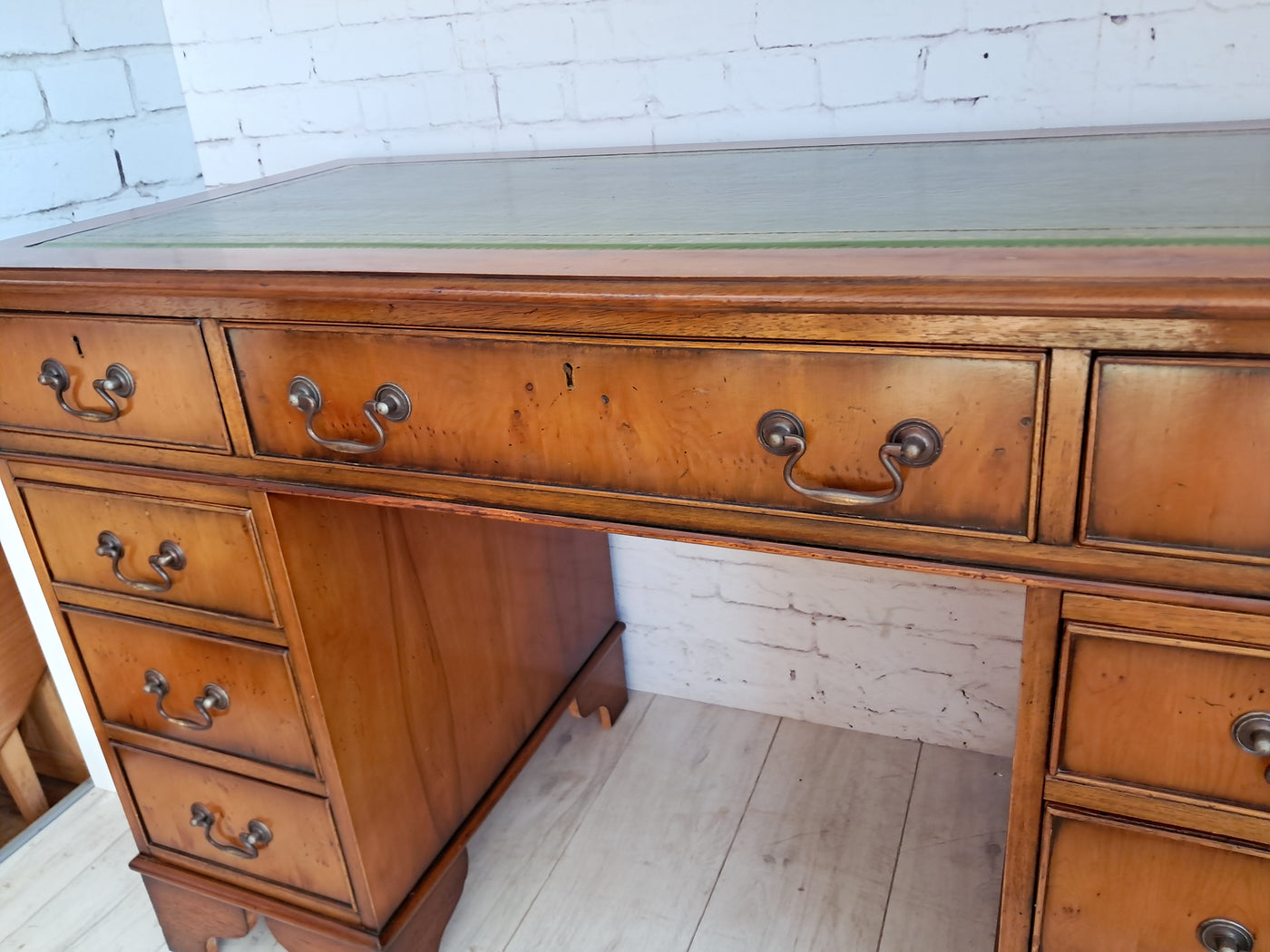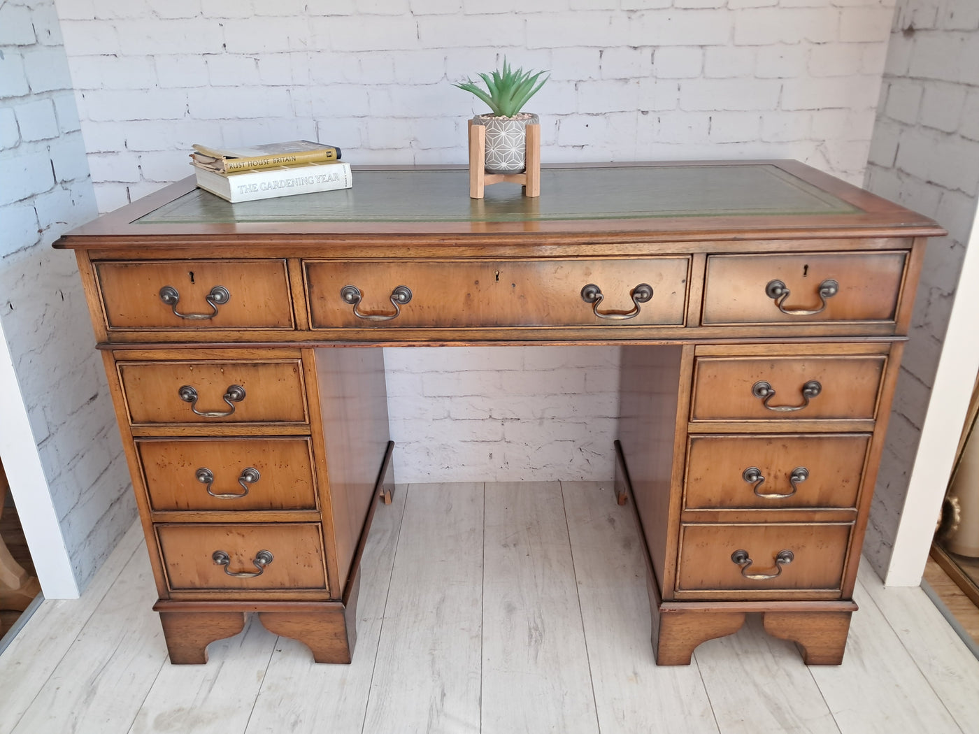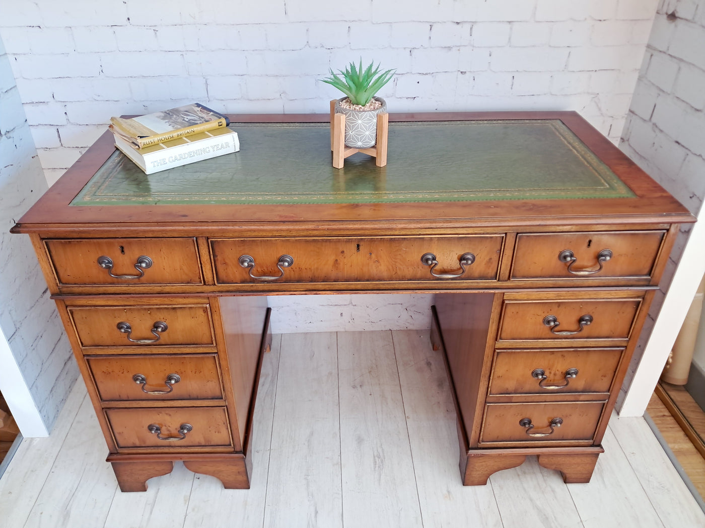 {"id":15415021601146,"title":"Antique Twin Pedestal Desk Wooden Vintage Desk Yew Wood Leather Top 1980","handle":"antique-twin-pedestal-desk-wooden-vintage-desk-yew-wood-leather-top-1980","description":"\u003cp\u003e\u003cspan\u003eIntroducing a magnificent vintage writing desk exuding the timeless elegance of Georgian style. Crafted in the 1980s, this double pedestal desk boasts a beautiful Yew wood finish, accentuated by a delightful green leather writing surface adorned with antique gold tooling along the edges. The Yew wood grain is simply mesmerising, adding a touch of sophistication to any space. This desk is in superb condition having been professionally cleaned and waxed.\u003c\/span\u003e\u003c\/p\u003e\n\u003cp\u003e \u003c\/p\u003e\n\u003cp\u003eFeaturing a total of 8 drawers, this vintage desk includes a spacious central drawer at the top, flanked by 4 drawers on one side and 2 drawers above a deeper drawer on the other. The design of the deeper drawer creates the appearance of 2 drawers, maintaining the desk's symmetrical look on both sides. The larger drawer could be used for filing as it can take suspension files. Each drawer is equipped with Georgian-style handles and impeccably crafted dovetail joints, reflecting the attention to detail characteristic of the era. The original key is included allowing you to lock away any important documents. Sitting on bracket feet this desk exudes both charm and functionality.\u003c\/p\u003e\n\u003cp\u003eVersatile in placement, this desk is equally captivating from any angle, thanks to its consistent Yew wood finish on all sides. Meticulously cleaned and restored to its former glory, it showcases the natural beauty of the wood grain, presenting itself in superb vintage condition.\u003c\/p\u003e\n\u003cp\u003eIdeal for both traditional and contemporary office settings, this desk's modest proportions make it a perfect fit for smaller home office spaces without compromising on style or functionality. Elevate your workspace with this distinguished piece, a testament to timeless design and enduring craftsmanship.\u003c\/p\u003e\n\u003cp\u003eThis desk will be dismantled into 3 parts to make delivery easy. The top simply lifts off the two pedestals containing the drawers.\u003c\/p\u003e\n\u003cp\u003ePlease note only the desk is for sale any other items shown in the photo are for aesthetic purposes but may be available to purchase separately.\u003c\/p\u003e\n\u003cp\u003eFREE collection from our shop by telephone appointment only. Viewing also available by appointment only - tel: 01895 675596 \u003c\/p\u003e\n\u003cp\u003eMeasurements - approximately\u003c\/p\u003e\n\u003cp\u003eWidth - 122 cm\u003c\/p\u003e\n\u003cp\u003eDepth - 60 cm\u003c\/p\u003e\n\u003cp\u003eHeight of desk: 78 cm\u003c\/p\u003e\n\u003cp\u003eOur motto is to reuse and recycle these wonderful antique and vintage items so that they get a new lease of life and at the same time you will have a unique, personal item of good quality in your home that will also contribute to the world's carbon footprint. We owe it to our future generations NOT to be a throwaway society.\u003c\/p\u003e\n\u003cp\u003eAll of our furniture has been restored\/upcycled or professionally cleaned with care and attention using quality paints and materials. However, as with all vintage items they may show some characteristics signs of age and some minor imperfections but this only adds to the overall appeal of vintage \u0026amp; antique items giving them a uniqueness that cannot be found in brand new items.\u003c\/p\u003e\n\u003cp\u003eFREE collection from our shop is available.\u003c\/p\u003e\n\u003cp\u003eThe delivery quoted in this listing is for mainland UK only.\u003c\/p\u003e\n\u003cp\u003ePlease contact us for a delivery quote to Cornwall, Scotland, Highlands or Islands or Offshore UK, Northern Ireland, Jersey, Guernsey, IOW, etc as it may be more than the price quote.\u003c\/p\u003e\n\u003cp\u003eCourier price quoted is for one man courier to ground floor level only – help will be needed your end. Timed and exact delivery day requests are not available but delivery will normally be within a two week window. If you wish to have a two man courier then we can give you a quote for this.\u003c\/p\u003e\n\u003cp\u003eThis item is available to view at our showroom RetroNovia, 12 New Pond Parade, West End Road, Ruislip Gardens, Middlesex HA4 6LR . Please call us on 01895 675596 to make sure the item is available before coming to view.\u003c\/p\u003e\n\u003cp\u003eWe are located easy access from London and Oxford and are directly off the Main A40 Polish War memorial junction.\u003c\/p\u003e","published_at":"2025-10-13T11:07:04+01:00","created_at":"2025-10-13T11:07:04+01:00","vendor":"RetroNovia","type":"Desk","tags":["Antique Style","Desk","Pedestal"],"price":45000,"price_min":45000,"price_max":45000,"available":false,"price_varies":false,"compare_at_price":null,"compare_at_price_min":0,"compare_at_price_max":0,"compare_at_price_varies":false,"variants":[{"id":56017216569722,"title":"Default Title","option1":"Default Title","option2":null,"option3":null,"sku":"1549","requires_shipping":true,"taxable":false,"featured_image":null,"available":false,"name":"Antique Twin Pedestal Desk Wooden Vintage Desk Yew Wood Leather Top 1980","public_title":null,"options":["Default Title"],"price":45000,"weight":70000,"compare_at_price":null,"inventory_management":"shopify","barcode":null,"requires_selling_plan":false,"selling_plan_allocations":[]}],"images":["\/\/retronovia.co.uk\/cdn\/shop\/files\/desk_pedestal_leather_top_3_0141cc20-efe3-47a3-ba2a-c58a11510d14.jpg?v=1760350398","\/\/retronovia.co.uk\/cdn\/shop\/files\/desk_pedestal_leather_top_1_a692df72-40d3-465f-989e-5dbb89b7a923.jpg?v=1760350398","\/\/retronovia.co.uk\/cdn\/shop\/files\/desk_pedestal_leather_top_2_91f339b5-aa2b-4c07-b3ae-56402345fc64.jpg?v=1760350398","\/\/retronovia.co.uk\/cdn\/shop\/files\/desk_pedestal_leather_top_4_43b7002e-597c-4fae-b718-9c5