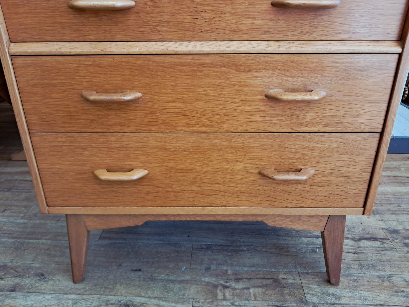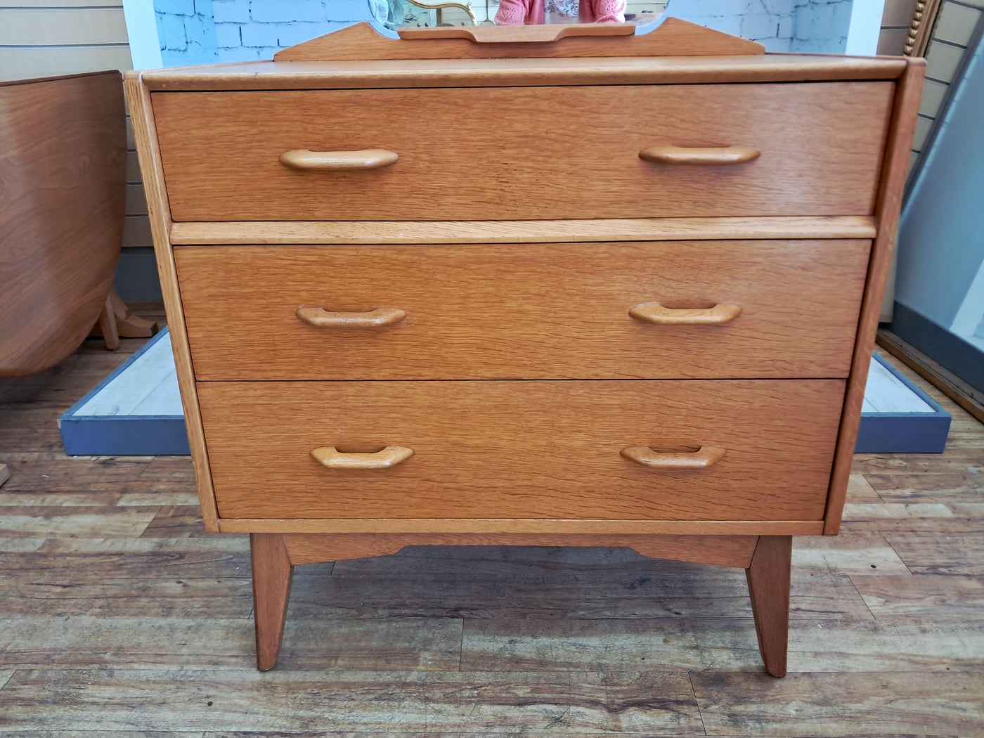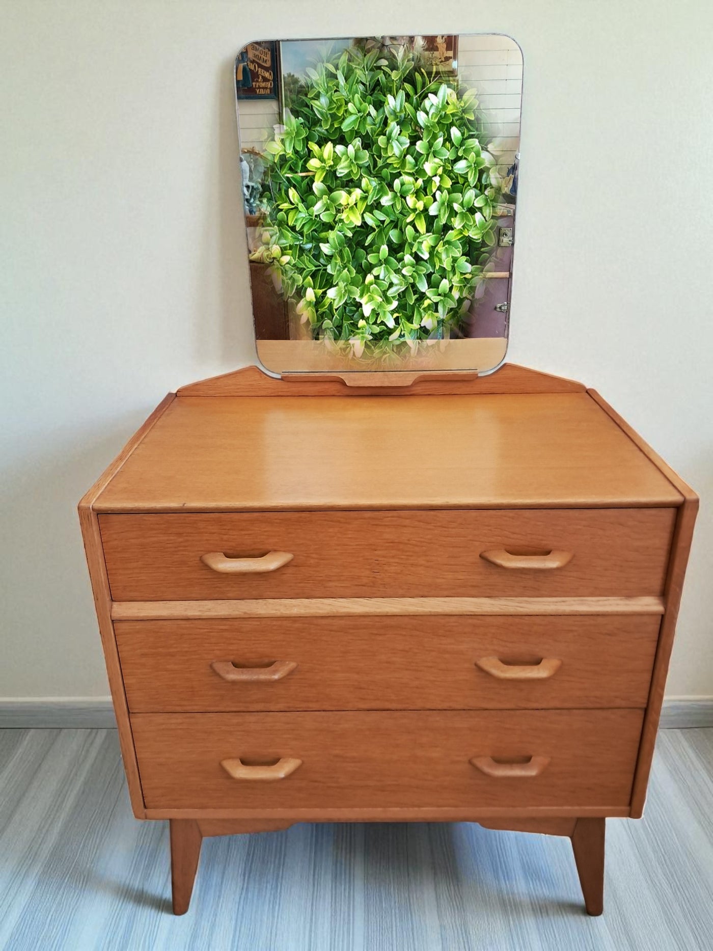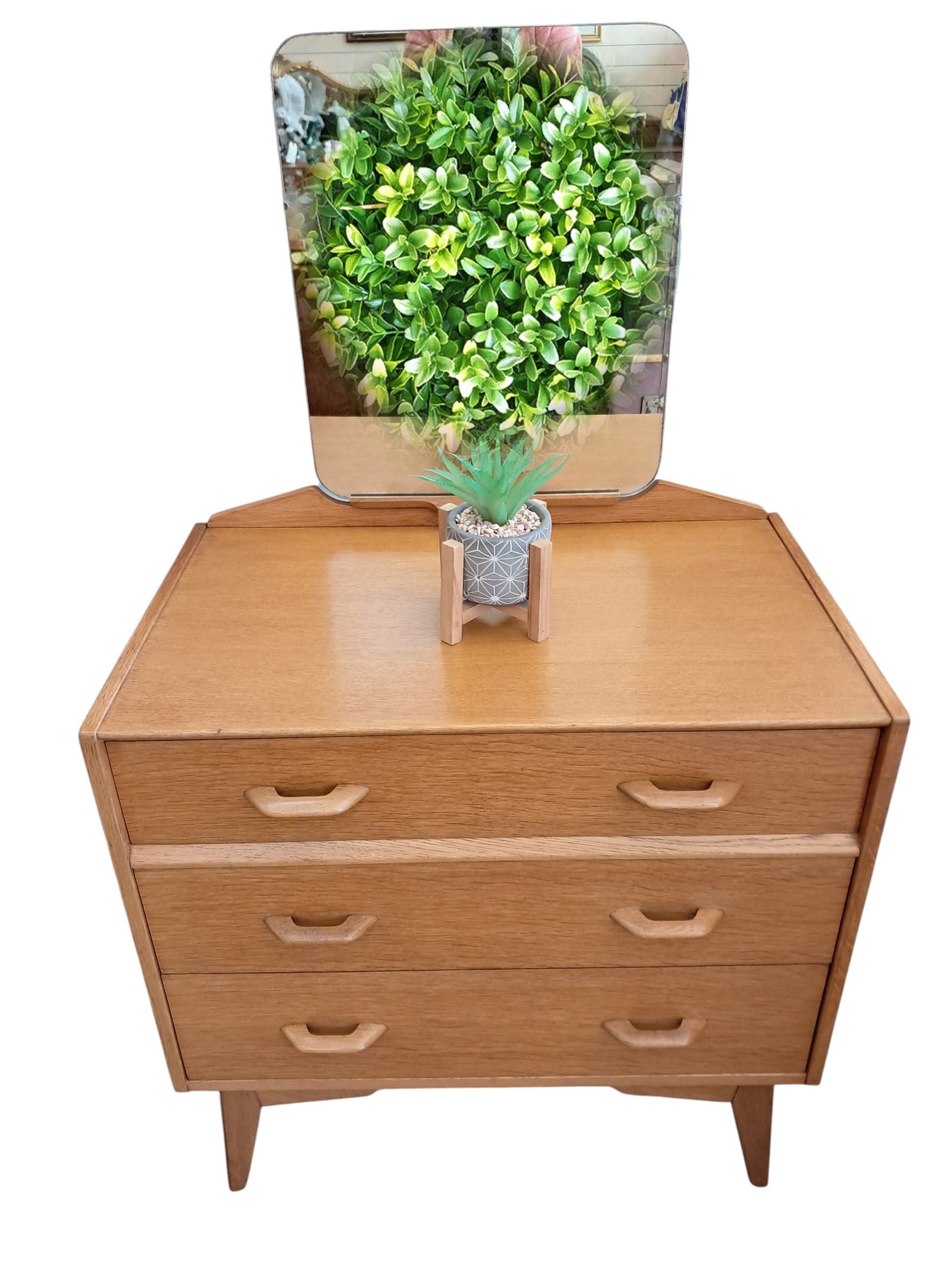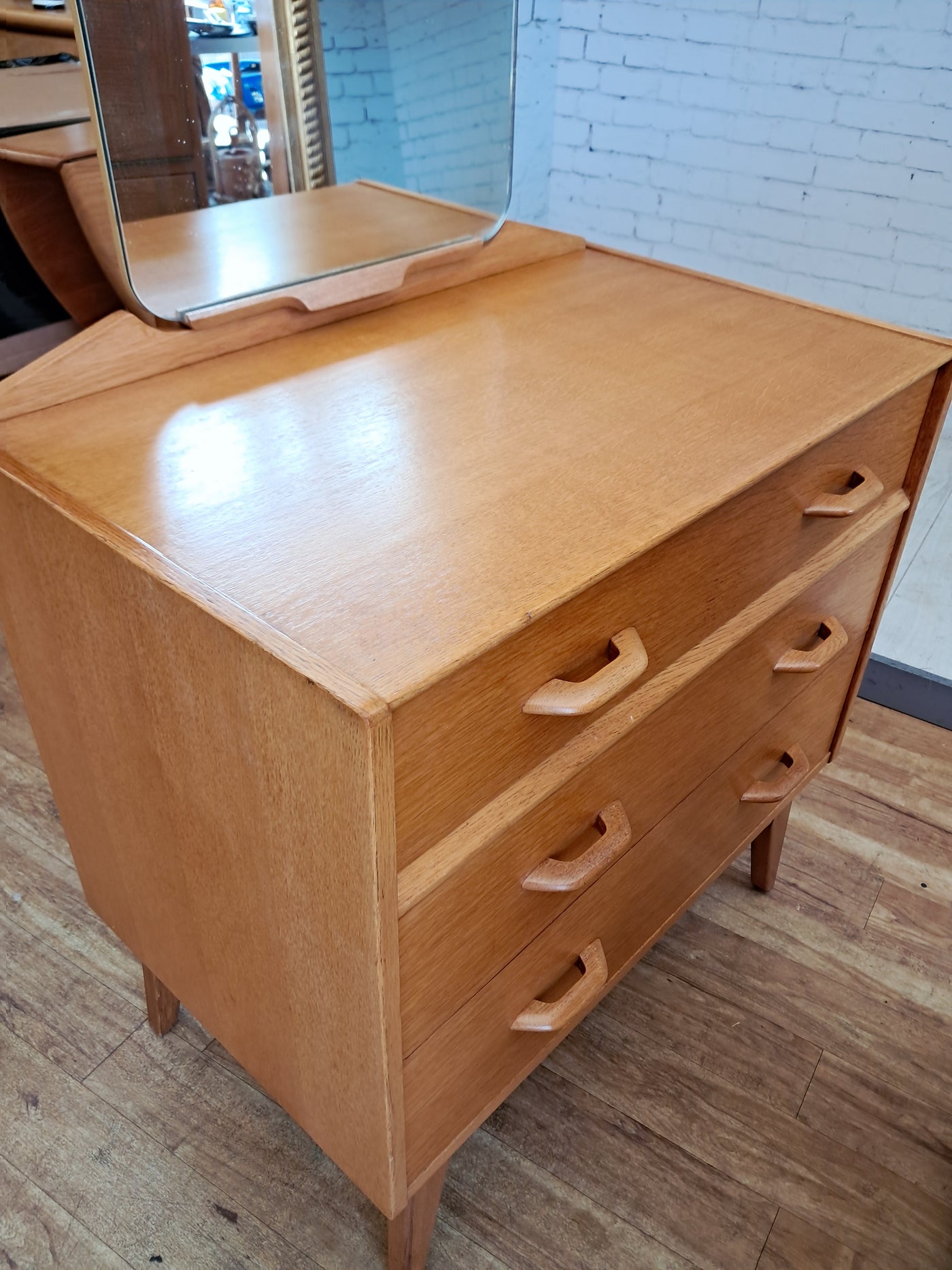 {"id":15396404134266,"title":"Mid Century G Plan Brandon Oak Dressing Table | Chest of Drawers + Mirror 1960 Compact","handle":"mid-century-g-plan-brandon-oak-dressing-table-chest-of-drawers-mirror-1960-compact","description":"\u003cp\u003eHere’s the refined version with your requested change:\u003c\/p\u003e\n\u003chr\u003e\n\u003cdiv data-sleek-node-id=\"cb7c7e\"\u003e\n\u003cdiv\u003e\u003cstrong\u003eMid Century G Plan Brandon Dressing Table \/ Chest of Drawers with Mirror – 1960s - Compact. In excellent vintage condition.\u003c\/strong\u003e\u003c\/div\u003e\n\u003cdiv\u003e\u003cbr\u003e\u003c\/div\u003e\n\u003cdiv\u003e\n\u003cstrong\u003eElevate your interior with an authentic piece of British mid-century design\u003c\/strong\u003e—a striking G Plan Brandon Oak Dressing Table with three drawers and an adjustable mirror. This exceptional piece embodies the timeless elegance and craftsmanship that define the G Plan legacy, offering both style and practicality for refined living spaces. This compact dressing table \/ chest of drawers is a particularly rare find, making it an ideal choice or smaller rooms or residences where space is at a premium.\u003c\/div\u003e\n\u003cdiv\u003e\u003cbr\u003e\u003c\/div\u003e\n\u003cdiv\u003eProfessionally cleaned and waxed, the oak grain reveals a warm, natural beauty that enhances its sophistication. Retaining its original G Plan gold stamp, this dressing table stands as a mark of heritage and quality, ensuring a level of craftsmanship rarely found in modern furniture. Perfectly proportioned, it makes an elegant addition to any bedroom or guest room.\u003c\/div\u003e\n\u003cdiv\u003e\u003cbr\u003e\u003c\/div\u003e\n\u003cdiv\u003eThe piece is crafted from solid oak with dovetail-jointed drawers that ensure enduring strength and stability. Its three drawers provide a perfect balance of style and functionality: two generously sized drawers to the base offer ample storage, while the top drawer is divided into three compartments for effortless organisation. The original G Plan gold stamp, located inside the top drawer, further confirms the authenticity and quality of this piece. Retaining its original Brandon-style handles, the design captures the clean, iconic lines of the mid-century era.\u003c\/div\u003e\n\u003cdiv\u003e\u003cbr\u003e\u003c\/div\u003e\n\u003cdiv\u003eFunctionality is as impressive as its design, with drawers that glide smoothly and a sturdy, beautifully balanced frame. The mirror, which complements the chest of drawers, can be tilted to the desired angle and is removable if preferred, offering versatility. The dressing table rests gracefully on four retro legs, completing its classic mid-century profile.\u003c\/div\u003e\n\u003cdiv\u003e\u003cbr\u003e\u003c\/div\u003e\n\u003cdiv\u003e\u003cstrong\u003eFor Lovers of Vintage Furniture \u0026amp; Accessories\u003c\/strong\u003e\u003c\/div\u003e\n\u003cdiv\u003eA timeless and stylish addition to any home, this G Plan Brandon Dressing Table is perfect for those who appreciate mid-century design and craftsmanship. Its combination of functionality, elegance, and heritage makes it a standout piece for bedrooms or dressing areas, while its authentic vintage character ensures it remains unique and full of charm.\u003c\/div\u003e\n\u003cdiv\u003e\u003cbr\u003e\u003c\/div\u003e\n\u003cdiv\u003e\u003cstrong\u003eFor Interior Designers\u003c\/strong\u003e\u003c\/div\u003e\n\u003cdiv\u003eThis piece represents an exceptional opportunity for interior designers seeking original mid-century furniture for high-end projects. Its authenticity, versatility, and refined aesthetic make it a sophisticated addition to curated interiors, offering both design pedigree and practical function.\u003c\/div\u003e\n\u003cdiv\u003e\u003cbr\u003e\u003c\/div\u003e\n\u003cdiv\u003e\n\u003cstrong\u003eFREE collection\u003c\/strong\u003e\u003cspan\u003e \u003c\/span\u003efrom our shop by appointment only. If you would like to view this item please make an appointment by telephoning 01895 675596.\u003c\/div\u003e\n\u003cdiv\u003e\u003cbr\u003e\u003c\/div\u003e\n\u003cdiv\u003eDimensions: (Approx)\u003c\/div\u003e\n\u003cdiv\u003eWidth: 75.5cm \u003c\/div\u003e\n\u003cdiv\u003e-Depth: 46cm \u003c\/div\u003e\n\u003cdiv\u003eHeight: 76cm to top of chest of drawers 130cm height to top of mirror from floor.\u003c\/div\u003e\n\u003cdiv\u003eMirror: 53cm H x 43cm W\u003c\/div\u003e\n\u003cdiv\u003e\u003cbr\u003e\u003c\/div\u003e\n\u003cdiv\u003eOur motto is to reuse and recycle these wonderful antique and vintage items so that they get a new lease of life and at the same time you will have a unique, personal item of good quality in your home that will also contribute to the world's carbon footprint. We owe it to our future generations NOT to be a throwaway society.\u003c\/div\u003e\n\u003cdiv\u003e\u003cbr\u003e\u003c\/div\u003e\n\u003cdiv\u003eAll of our furniture has been cleaned or restored\/upcycled professionally with care and attention using quality paints and materials. Please note that vintage pieces may show minor imperfections or signs or subtle marks of time. These do not affect their functionality or appeal; rather, they add to the character, individuality, and timeless charm that make vintage furniture so distinctive.\u003c\/div\u003e\n\u003cdiv\u003e\u003cbr\u003e\u003c\/div\u003e\n\u003cdiv\u003eFREE collection from our shop by appointment only. If you would like to view this item please make an appointment by telephoning 01895 675596.\u003c\/div\u003e\n\u003cdiv\u003e \u003c\/div\u003e\n\u003cdiv\u003eThe delivery quoted in this listing is for mainland UK only.\u003c\/div\u003e\n\u003cdiv\u003ePlease contact us for a delivery quote to Cornwall , Scotland, Highlands or Islands or Offshore UK, Northern Ireland, Jersey, Guernsey, IOW, etc as it may be more than the price quote.\u003c\/div\u003e\n\u003cdiv\u003e\u003cbr\u003e\u003c\/div\u003e\n\u003cdiv\u003eCourier price quoted is for one man courier to ground