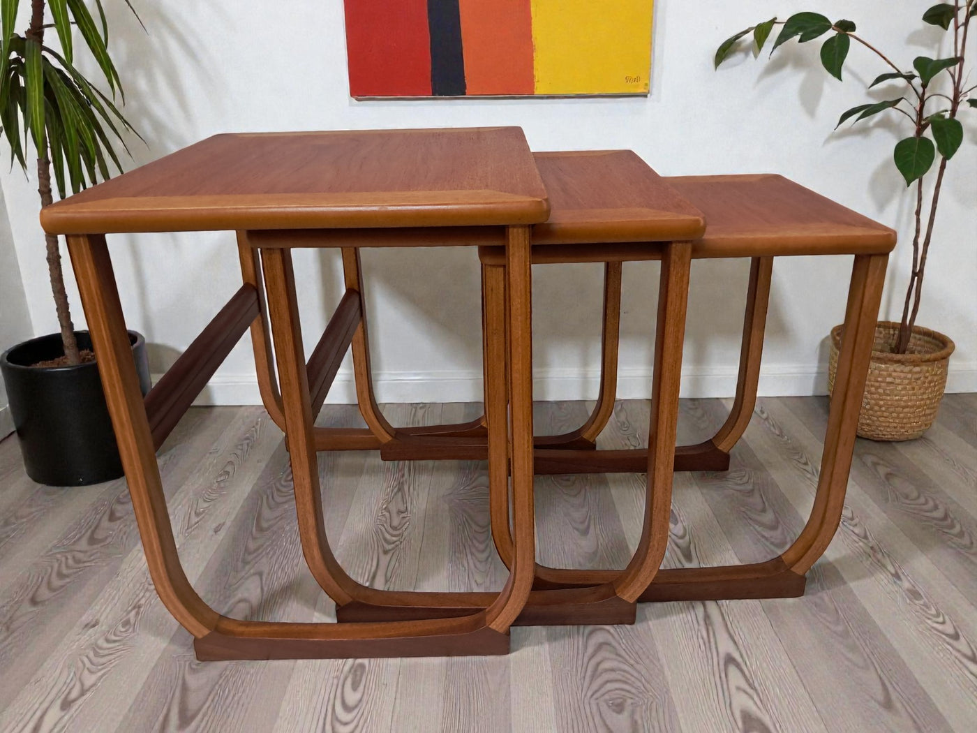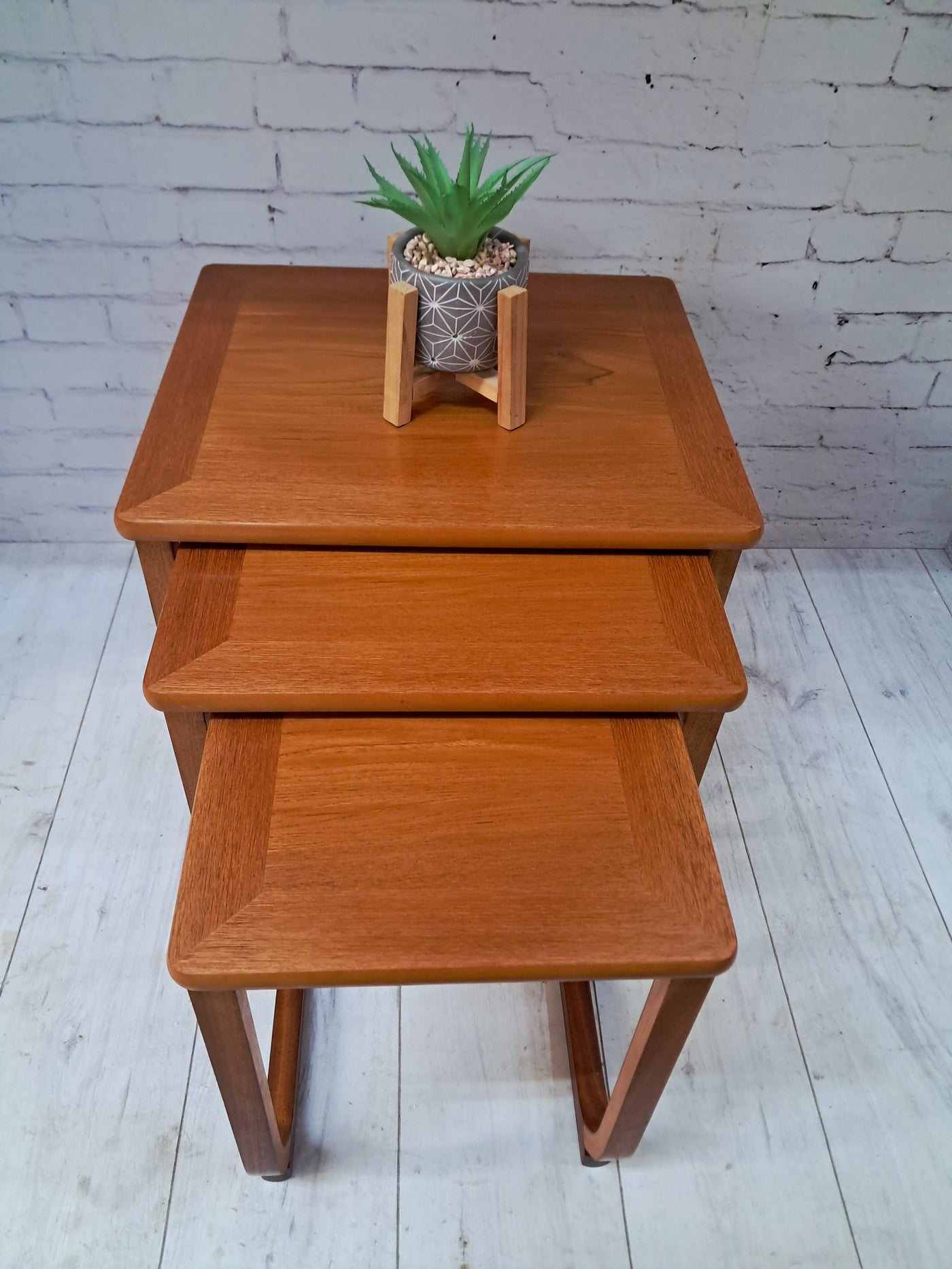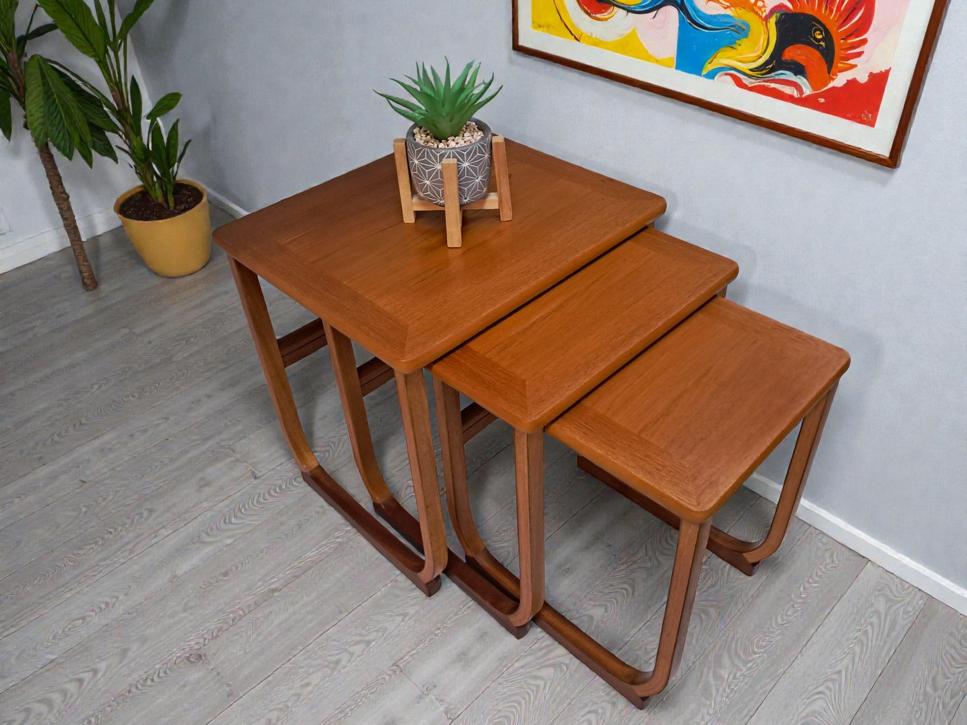 {"id":15546031112570,"title":"Mid Century Nathan Nest of Tables Side Table Teak Vintage Retro Trio 1970's","handle":"mid-century-nathan-nest-of-tables-side-table-teak-vintage-retro-trio-1970s","description":"\u003cp\u003e\u003cstrong\u003e1970s Nathan Teak Nest of Three Tables by Parker Knoll In Excellent Condition\u003c\/strong\u003e\u003c\/p\u003e\n\u003cp\u003eThis elegant trio of 1970s teak nesting tables is a lovely example of mid-century design by Nathan, produced during the period when Parker Knoll was manufacturing pieces in this style. One of the tables still retains its original Parker Knoll label, confirming authenticity and the quality craftsmanship associated with the brand.\u003c\/p\u003e\n\u003cp\u003eThe set features beautifully curved sled-style legs, crafted from bentwood into graceful elongated arches that provide both stability and a refined, light presence. Each table top displays a rich warm teak grain, professionally cleaned and oiled to enhance the natural depth and character of the wood.\u003c\/p\u003e\n\u003cp\u003eDesigned with practicality in mind, the three tables slide seamlessly together when not in use, offering a superb space-saving solution. When separated, they function perfectly as side tables, lamp tables, coffee table extensions, plant stands, or occasional tables for entertaining. Their versatility ensures they complement both modern and classic interiors.\u003c\/p\u003e\n\u003cp\u003e\u003cstrong\u003eFor Discerning Collectors \u0026amp; Interior Designers\u003c\/strong\u003e\u003c\/p\u003e\n\u003cp\u003eA timeless and stylish addition to any home, this set is perfect for those who appreciate mid-century design, as well as interior designers looking to bring its elegance into their projects.\u003c\/p\u003e\n\u003cp\u003e\u003cstrong\u003eFor Lovers of Vintage Furniture \u0026amp; Accessories\u003c\/strong\u003e\u003c\/p\u003e\n\u003cp\u003eWhether placing them in a sitting room, study, or contemporary open-plan space, these elegant nesting tables offer versatility, sophistication, and enduring mid-century charm.\u003c\/p\u003e\n\u003cp\u003eMeasurements:(approx) - individual tables\u003cbr\u003eTable 1: 48cm W x 41.5cm D x 48.5cm H\u003cbr\u003eTable 2: 40cm W x 40cm D x 45.5cm H\u003cbr\u003eTable 3: 32cm W x 39.5cm D x 43cm H\u003c\/p\u003e\n\u003cp\u003eFREE collection from our shop by telephone appointment only. Viewing also available by appointment only - tel: 01895 675596. \u003c\/p\u003e\n\u003cp\u003eAll of our furniture has been restored\/upcycled professionally with care and attention using quality paints and materials. However, as with all vintage items they may show some characteristics signs of age and some minor imperfections.\u003c\/p\u003e\n\u003cp\u003eOur motto is to reuse and recycle these wonderful antique and vintage items so that they get a new lease of life and at the same time you will have a unique, personal item of good quality in your home that will also contribute to the world's carbon footprint.\u003c\/p\u003e\n\u003cp\u003eThe delivery quoted is for mainland UK only.\u003cbr\u003ePlease contact for quote for Cornwall, Scotland, (Highland, Islands, and Northern Ireland) Highlands, Islands and Offshore UK\/Northern Ireland will be more.\u003c\/p\u003e\n\u003cp\u003eThis item is available to view at our showroom RetroNovia, 12 New Pond Parade, West End Road, Ruislip Gardens, Middlesex HA4 6LR . Please call us on 01895 675596 to make sure the item is available before coming to view.\u003c\/p\u003e","published_at":"2025-12-10T12:37:03+00:00","created_at":"2025-12-10T12:37:04+00:00","vendor":"Nathan - Parker Knoll","type":"Tables","tags":["Coffee Table","Danish Style","Mid Century","Nest Tables","Tables"],"price":22500,"price_min":22500,"price_max":22500,"available":true,"price_varies":false,"compare_at_price":27500,"compare_at_price_min":27500,"compare_at_price_max":27500,"compare_at_price_varies":false,"variants":[{"id":56288776290682,"title":"Default Title","option1":"Default Title","option2":null,"option3":null,"sku":"1557","requires_shipping":true,"taxable":false,"featured_image":null,"available":true,"name":"Mid Century Nathan Nest of Tables Side Table Teak Vintage Retro Trio 1970's","public_title":null,"options":["Default Title"],"price":22500,"weight":70000,"compare_at_price":27500,"inventory_management":"shopify","barcode":null,"requires_selling_plan":false,"selling_plan_allocations":[]}],"images":["\/\/retronovia.co.uk\/cdn\/shop\/files\/nest_tables_trio_nathan_4.jpg?v=1765370487","\/\/retronovia.co.uk\/cdn\/shop\/files\/nest_tables_trio_nathan_1.jpg?v=1765370487","\/\/retronovia.co.uk\/cdn\/shop\/files\/nest_tables_trio_nathan_7.jpg?v=1765370487","\/\/retronovia.co.uk\/cdn\/shop\/files\/nest_tables_trio_nathan_6a.jpg?v=1765370487","\/\/retronovia.co.uk\/cdn\/shop\/files\/nest_tables_trio_nathan_2.jpg?v=1765370487","\/\/retronovia.co.uk\/cdn\/shop\/files\/nest_tables_trio_nathan_8.jpg?v=1765370487","\/\/retronovia.co.uk\/cdn\/shop\/files\/nest_tables_trio_nathan_3.jpg?v=1765370487","\/\/retronovia.co.uk\/cdn\/shop\/files\/nest_tables_trio_nathan_9.jpg?v=1765370487","\/\/retronovia.co.uk\/cdn\/shop\/files\/nest_tables_trio_nathan_5.jpg?v=1765370487","\/\/retronovia.co.uk\/cdn\/shop\/files\/nest_tables_trio_nathan_10.jpg?v=1765370341","\/\/retronovia.co.uk\/cdn\/shop\/files\/nest_tables_trio_nathan_11.jpg?v=1765370343","\/\/retronovia.co.uk\/cdn\/shop\/files\/nest_tables_trio_nathan_12.jpg?v=1765370342","\/\/retronovia.co.uk\/cdn\/shop\/files\/nest_tables_trio_nathan_13.jpg?v=1765370342","\/\/retronovia.co.uk\/cdn\/shop\/files\/nest_tables_trio_nathan_14.jpg?v=1765370342","\/\/retronovia.co.uk\/cdn\/shop\/files\/nest_tables_trio_nathan_15.jpg?v=1765370342","\/\/retronovia.co.uk\/cdn\/shop\/files\/nest_tables_trio_nathan_16.jpg?v=1765370342","\/\/retronovia.co.uk\/cdn\/shop\/files\/nest_tables_trio_nathan_17.jpg?v=1765370342","\/\/retronovia.co.uk\/cdn\/shop\/files\/nest_tables_trio_nathan_18.jpg?v=1765370342","\/\/re