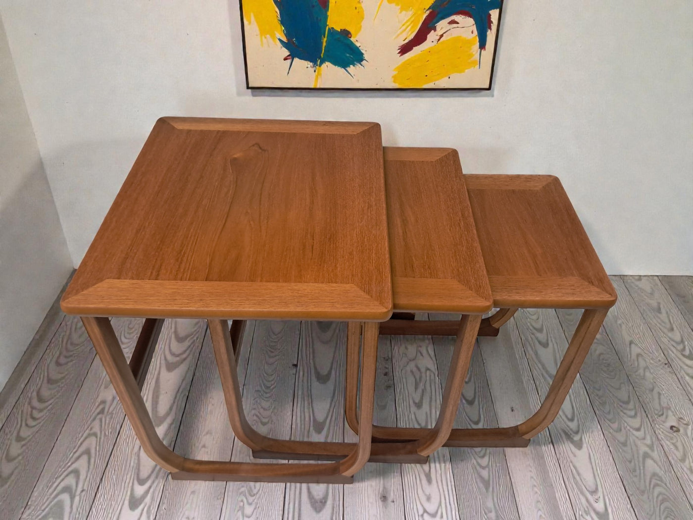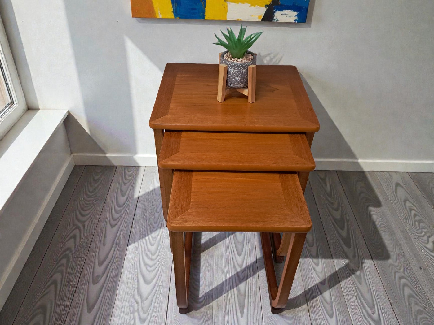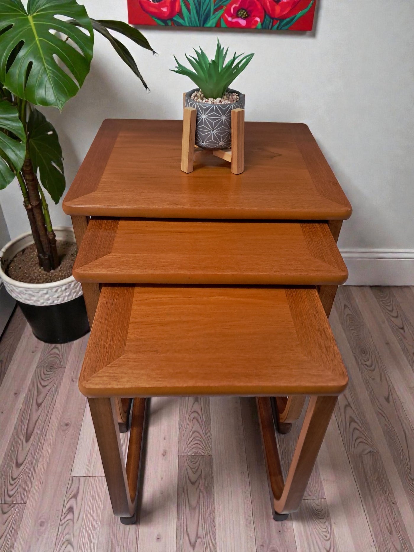 {"id":15546031112570,"title":"Mid Century Nathan Nest of Tables Side Table Teak Vintage Retro Trio 1970's","handle":"mid-century-nathan-nest-of-tables-side-table-teak-vintage-retro-trio-1970s","description":"\u003cp\u003e\u003cstrong\u003e1970s Nathan Teak Nest of Three Tables by Parker Knoll In Excellent Condition\u003c\/strong\u003e\u003c\/p\u003e\n\u003cp\u003eThis elegant trio of 1970s teak nesting tables is a lovely example of mid-century design by Nathan, produced during the period when Parker Knoll was manufacturing pieces in this style. One of the tables still retains its original Parker Knoll label, confirming authenticity and the quality craftsmanship associated with the brand.\u003c\/p\u003e\n\u003cp\u003eThe set features beautifully curved sled-style legs, crafted from bentwood into graceful elongated arches that provide both stability and a refined, light presence. Each table top displays a rich warm teak grain, professionally cleaned and oiled to enhance the natural depth and character of the wood.\u003c\/p\u003e\n\u003cp\u003eDesigned with practicality in mind, the three tables slide seamlessly together when not in use, offering a superb space-saving solution. When separated, they function perfectly as side tables, lamp tables, coffee table extensions, plant stands, or occasional tables for entertaining. Their versatility ensures they complement both modern and classic interiors.\u003c\/p\u003e\n\u003cp\u003e\u003cstrong\u003eFor Discerning Collectors \u0026amp; Interior Designers\u003c\/strong\u003e\u003c\/p\u003e\n\u003cp\u003eA timeless and stylish addition to any home, this set is perfect for those who appreciate mid-century design, as well as interior designers looking to bring its elegance into their projects.\u003c\/p\u003e\n\u003cp\u003e\u003cstrong\u003eFor Lovers of Vintage Furniture \u0026amp; Accessories\u003c\/strong\u003e\u003c\/p\u003e\n\u003cp\u003eWhether placing them in a sitting room, study, or contemporary open-plan space, these elegant nesting tables offer versatility, sophistication, and enduring mid-century charm.\u003c\/p\u003e\n\u003cp\u003eMeasurements:(approx) - individual tables\u003cbr\u003eTable 1: 48cm W x 41.5cm D x 48.5cm H\u003cbr\u003eTable 2: 40cm W x 40cm D x 45.5cm H\u003cbr\u003eTable 3: 32cm W x 39.5cm D x 43cm H\u003c\/p\u003e\n\u003cp\u003eFREE collection from our shop by telephone appointment only. Viewing also available by appointment only - tel: 01895 675596. \u003c\/p\u003e\n\u003cp\u003eAll of our furniture has been restored\/upcycled professionally with care and attention using quality paints and materials. However, as with all vintage items they may show some characteristics signs of age and some minor imperfections.\u003c\/p\u003e\n\u003cp\u003eOur motto is to reuse and recycle these wonderful antique and vintage items so that they get a new lease of life and at the same time you will have a unique, personal item of good quality in your home that will also contribute to the world's carbon footprint.\u003c\/p\u003e\n\u003cp\u003eThe delivery quoted is for mainland UK only.\u003cbr\u003ePlease contact for quote for Cornwall, Scotland, (Highland, Islands, and Northern Ireland) Highlands, Islands and Offshore UK\/Northern Ireland will be more.\u003c\/p\u003e\n\u003cp\u003eThis item is available to view at our showroom RetroNovia, 12 New Pond Parade, West End Road, Ruislip Gardens, Middlesex HA4 6LR . Please call us on 01895 675596 to make sure the item is available before coming to view.\u003c\/p\u003e","published_at":"2025-12-10T12:37:03+00:00","created_at":"2025-12-10T12:37:04+00:00","vendor":"Nathan - Parker Knoll","type":"Tables","tags":["Coffee Table","Danish Style","Mid Century","Nest Tables","Tables"],"price":22500,"price_min":22500,"price_max":22500,"available":true,"price_varies":false,"compare_at_price":27500,"compare_at_price_min":27500,"compare_at_price_max":27500,"compare_at_price_varies":false,"variants":[{"id":56288776290682,"title":"Default Title","option1":"Default Title","option2":null,"option3":null,"sku":"1557","requires_shipping":true,"taxable":false,"featured_image":null,"available":true,"name":"Mid Century Nathan Nest of Tables Side Table Teak Vintage Retro Trio 1970's","public_title":null,"options":["Default Title"],"price":22500,"weight":70000,"compare_at_price":27500,"inventory_management":"shopify","barcode":null,"requires_selling_plan":false,"selling_plan_allocations":[]}],"images":["\/\/retronovia.co.uk\/cdn\/shop\/files\/nest_tables_trio_nathan_4.jpg?v=1765370487","\/\/retronovia.co.uk\/cdn\/shop\/files\/nest_tables_trio_nathan_1.jpg?v=1765370487","\/\/retronovia.co.uk\/cdn\/shop\/files\/nest_tables_trio_nathan_7.jpg?v=1765370487","\/\/retronovia.co.uk\/cdn\/shop\/files\/nest_tables_trio_nathan_6a.jpg?v=1765370487","\/\/retronovia.co.uk\/cdn\/shop\/files\/nest_tables_trio_nathan_2.jpg?v=1765370487","\/\/retronovia.co.uk\/cdn\/shop\/files\/nest_tables_trio_nathan_8.jpg?v=1765370487","\/\/retronovia.co.uk\/cdn\/shop\/files\/nest_tables_trio_nathan_3.jpg?v=1765370487","\/\/retronovia.co.uk\/cdn\/shop\/files\/nest_tables_trio_nathan_9.jpg?v=1765370487","\/\/retronovia.co.uk\/cdn\/shop\/files\/nest_tables_trio_nathan_5.jpg?v=1765370487","\/\/retronovia.co.uk\/cdn\/shop\/files\/nest_tables_trio_nathan_10.jpg?v=1765370341","\/\/retronovia.co.uk\/cdn\/shop\/files\/nest_tables_trio_nathan_11.jpg?v=1765370343","\/\/retronovia.co.uk\/cdn\/shop\/files\/nest_tables_trio_nathan_12.jpg?v=1765370342","\/\/retronovia.co.uk\/cdn\/shop\/files\/nest_tables_trio_nathan_13.jpg?v=1765370342","\/\/retronovia.co.uk\/cdn\/shop\/files\/nest_tables_trio_nathan_14.jpg?v=1765370342","\/\/retronovia.co.uk\/cdn\/shop\/files\/nest_tables_trio_nathan_15.jpg?v=1765370342","\/\/retronovia.co.uk\/cdn\/shop\/files\/nest_tables_trio_nathan_16.jpg?v=1765370342","\/\/retronovia.co.uk\/cdn\/shop\/files\/nest_tables_trio_nathan_17.jpg?v=1765370342","\/\/retronovia.co.uk\/cdn\/shop\/files\/nest_tables_trio_nathan_18.jpg?v=1765370342","\/\/re