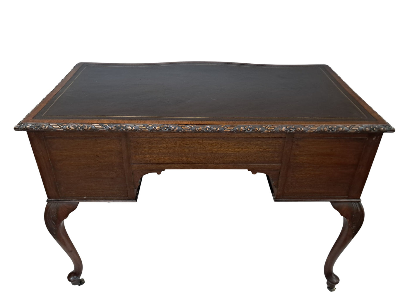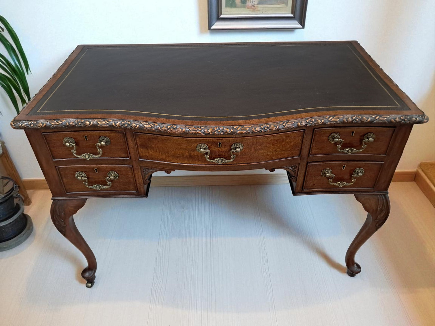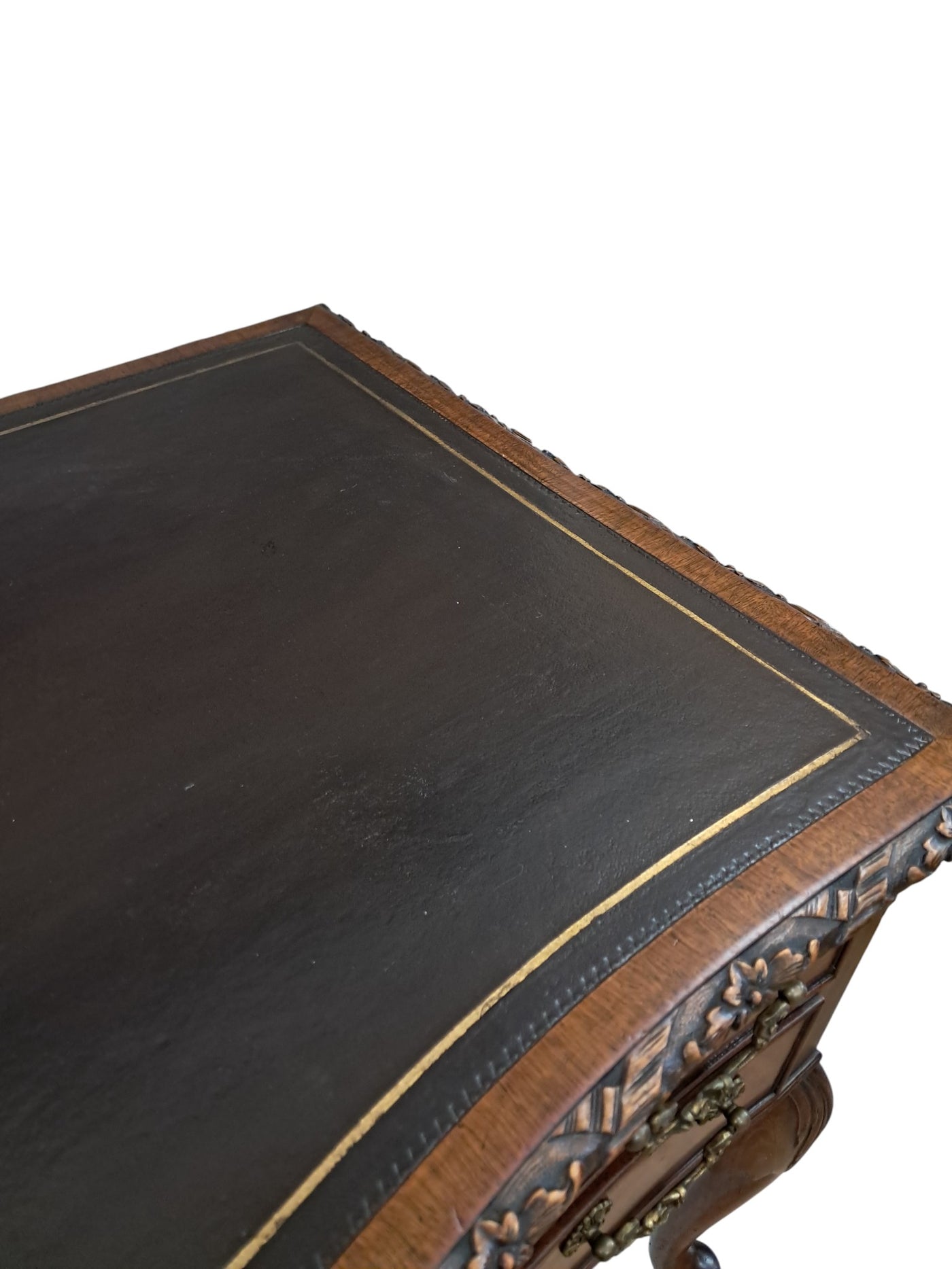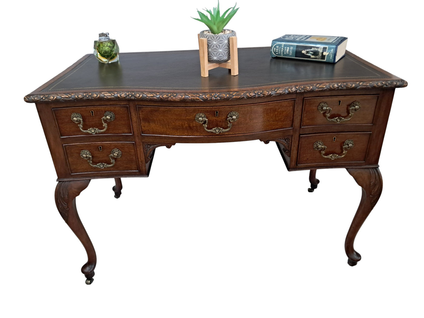 {"id":15423364891002,"title":"Antique Desk Writing Desk Edwardian Queen Anne Style Vintage Desk Leather Top 1910 Restored","handle":"antique-desk-writing-desk-edwardian-queen-anne-style-vintage-desk-leather-top-1910-restored","description":"\u003cp\u003e\u003cstrong\u003eEdwardian Mahogany Bowfront Desk with Gilt Tooled Leather Top\u003c\/strong\u003e\u003c\/p\u003e\n\u003cp\u003e\u003cstrong\u003eAn exquisite early 20th century Edwardian mahogany bowfront desk\u003c\/strong\u003e, crafted in the elegant Queen Anne Revival style. This beautifully proportioned piece features a gilt-tooled brown leather inset top above an arrangement of five drawers — the central drawer flanked by two sets of smaller drawers. Each drawer is finished with finely cast brass handles in a floral motif and constructed with traditional dovetail joints, reflecting the superb craftsmanship of the period.\u003c\/p\u003e\n\u003cp\u003eThe desk stands gracefully on carved cabriole legs with floral detailing to the knees, set upon original castors for ease of movement. Additional carved floral embellishments adorn the top edge, adding decorative refinement and timeless character. Professionally restored to an excellent standard, the desk is solid and sturdy, with drawers that glide smoothly.\u003c\/p\u003e\n\u003cp\u003eA striking and functional piece that combines elegance with practicality — ideal for a refined home office, study, boutique hotel reception, or as a distinguished writing table in a period or contemporary interior.\u003c\/p\u003e\n\u003cp\u003e\u003cstrong\u003eFor Lovers of Vintage Furniture \u0026amp; Accessories\u003c\/strong\u003e\u003c\/p\u003e\n\u003cp\u003eA timeless and stylish addition to any home, this desk is perfect for those who appreciate fine craftsmanship and early 20th century design, as well as interior designers seeking to bring enduring sophistication and character into their projects.\u003c\/p\u003e\n\u003cp\u003eApproximate Measurements:\u003cbr\u003e- Length: 107 cm\u003cbr\u003e- Depth: 60 cm\u003cbr\u003e- Desk Height: 74 cm\u003c\/p\u003e\n\u003cp\u003eAt our vintage furniture website, we pride ourselves on our commitment to reuse and recycle these extraordinary antique and vintage items, giving them a new lease on life. By incorporating these pieces into your home, you not only acquire a unique and high-quality personal item but also contribute to reducing the world's carbon footprint. Let's work together to create a future that values sustainability and rejects the throwaway culture.\u003c\/p\u003e\n\u003cp\u003ePlease note that all our furniture has been lovingly restored, upcycled, or professionally cleaned using quality paints and materials. As with all vintage items, they may exhibit characteristic signs of age and minor imperfections, which only add to the overall charm and appeal of these vintage and antique treasures, setting them apart from brand-new items.\u003c\/p\u003e\n\u003cp\u003eFREE collection is available from our shop by appointment only.\u003cbr\u003eThe delivery quoted in this listing is for mainland UK only.\u003cbr\u003ePlease contact us for a delivery quote to Cornwall, Scotland, Highlands or Islands or Offshore UK, Northern Ireland, Jersey, Guernsey, IOW, etc as it may be more than the price quote.\u003c\/p\u003e\n\u003cp\u003eCourier price quoted is for one man courier to ground floor level only – help will be needed your end. Timed and exact delivery day requests are not available but delivery will normally be within a two week window. If you wish to have a two man courier then we can give you a quote for this.\u003c\/p\u003e\n\u003cp\u003eThis item is available to view at our showroom RetroNovia, 12 New Pond Parade, West End Road, Ruislip Gardens, Middlesex HA4 6LR . Please call us on 01895 675596 to make sure the item is available before coming to view.\u003c\/p\u003e\n\u003cp\u003eWe are located easy access from London and Oxford and are directly off the Main A40 Polish War memorial junction.\u003c\/p\u003e","published_at":"2025-10-17T09:27:19+01:00","created_at":"2025-10-17T09:27:19+01:00","vendor":"RetroNovia","type":"Desk","tags":["Antique Style","Desk","Pedestal"],"price":49500,"price_min":49500,"price_max":49500,"available":true,"price_varies":false,"compare_at_price":null,"compare_at_price_min":0,"compare_at_price_max":0,"compare_at_price_varies":false,"variants":[{"id":56034473050490,"title":"Default Title","option1":"Default Title","option2":null,"option3":null,"sku":"1548","requires_shipping":true,"taxable":false,"featured_image":null,"available":true,"name":"Antique Desk Writing Desk Edwardian Queen Anne Style Vintage Desk Leather Top 1910 Restored","public_title":null,"options":["Default Title"],"price":49500,"weight":70000,"compare_at_price":null,"inventory_management":"shopify","barcode":null,"requires_selling_plan":false,"selling_plan_allocations":[]}],"images":["\/\/retronovia.co.uk\/cdn\/shop\/files\/desk_antique_writing_desk_1.jpg?v=1760689757","\/\/retronovia.co.uk\/cdn\/shop\/files\/desk_antique_writing_desk_3.jpg?v=1760689882","\/\/retronovia.co.uk\/cdn\/shop\/files\/desk_antique_writing_desk_4.jpg?v=1760689882","\/\/retronovia.co.uk\/cdn\/shop\/files\/desk_antique_writing_desk_2.jpg?v=1760689882","\/\/retronovia.co.uk\/cdn\/shop\/files\/desk_antique_writing_desk_5.jpg?v=1760689758","\/\/retronovia.co.uk\/cdn\/shop\/files\/desk_antique_writing_desk_7.jpg?v=1760689756","\/\/retronovia.co.uk\/cdn\/shop\/files\/desk_antique_writing_desk_8.jpg?v=1760689757","\/\/retronovia.co.uk\/cdn\/shop\/files\/desk_antique_writing_desk_9.jpg?v=1760689757","\/\/retronovia.co.uk\/cdn\/shop\/files\/desk_antique_writing_desk_10.jpg?v=1760689757","\/\/retronovia.co.uk\/cdn\/shop\/files\/desk_antique_writing_desk_11.jpg?v=1760689756","\/\/retronovia.co.uk\/cdn\/shop\/files\/desk_antique_writing_desk_12.jpg?v=1760689757","\/\/retronovia.co.uk\/cdn\/shop\/files\/desk_antique_writing_desk_13.jpg?v=1760689756","\/\/retronovia.co.uk\/cdn\/shop\/fil