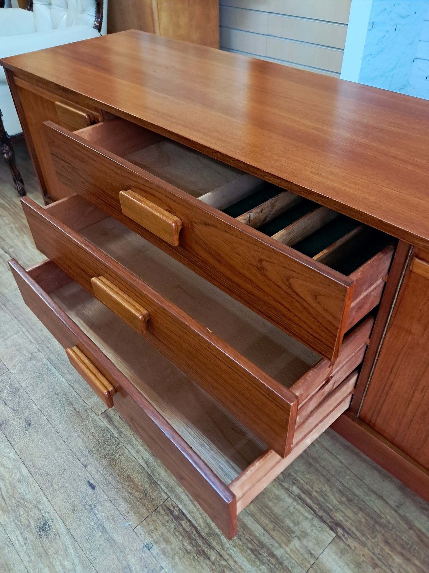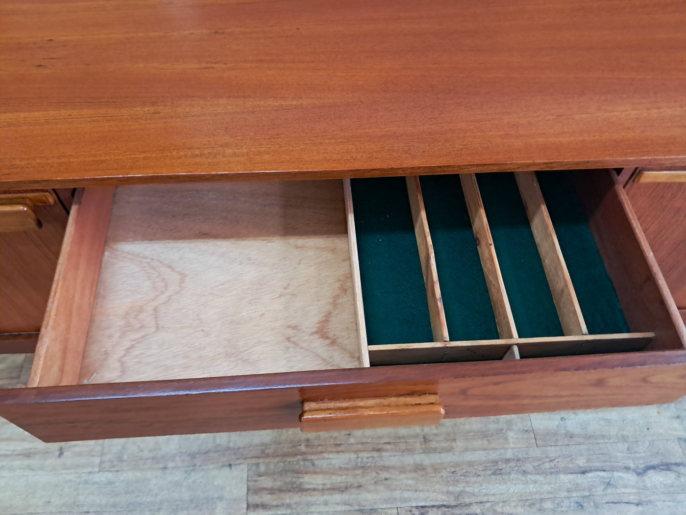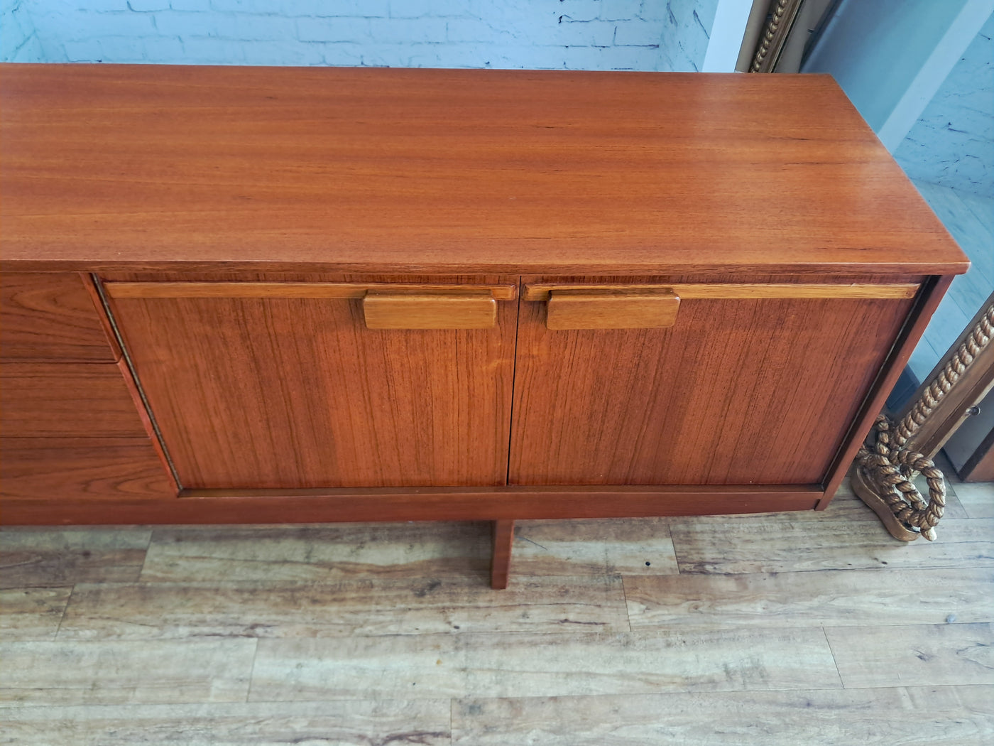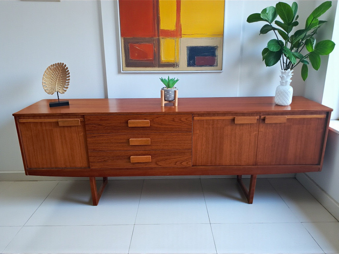 {"id":15466556359034,"title":"Mid-Century Teak Sideboard: Vintage Danish Style 1960s Drinks Cabinet Restored","handle":"mid-century-teak-sideboard-vitntage-danish-style-1960s-drinks-cabinet-restored","description":"\u003cp\u003e\u003cstrong\u003eMid-Century Danish Style Teak Sideboard, c.1960s - Restored to a High Standard\u003c\/strong\u003e\u003c\/p\u003e\n\u003cp\u003eA stunning and exceptionally rare Danish-style teak sideboard dating from the 1960s. Measuring an impressive 250 cm in length, this piece embodies the refined simplicity and craftsmanship synonymous with mid-century Scandinavian design.\u003c\/p\u003e\n\u003cp\u003eThe sideboard showcases a beautiful teak wood grain throughout — rich, warm, and exceptionally well-figured — making it a true statement piece for any interior. It features striking solid teak handles, elegantly sculpted into substantial rectangular forms with softly rounded edges, perfectly complementing its clean, architectural lines.\u003c\/p\u003e\n\u003cp\u003eTo the left-hand side is a pull-down drinks cabinet revealing a white Formica serving surface, ideal for preparing or serving drinks. Inside, a removable shelf offers ample space for bottles and glassware. The central section comprises three drawers, including a top drawer lined in green felt for cutlery or smaller items. To the right, a double-door cupboard opens to reveal generous storage with a removable shelf — perfect for tableware or linens.\u003c\/p\u003e\n\u003cp\u003eThe cabinet stands gracefully on sleek, angled sleigh legs that enhance its light, balanced profile and timeless silhouette.\u003c\/p\u003e\n\u003cp\u003eRestored to an exceptionally high standard, this sideboard is in superb condition throughout. Most likely Danish in origin, it is an extremely rare model, with no identical examples currently found online — a true collector’s piece of exceptional quality and design pedigree.\u003c\/p\u003e\n\u003cp\u003e\u003cstrong\u003eFor Lovers of Vintage Furniture \u0026amp; Accessories\u003c\/strong\u003e\u003c\/p\u003e\n\u003cp\u003eA timeless and stylish addition to any home, this sideboard is perfect for those who appreciate mid-century design, as well as interior designers looking to bring its understated sophistication into their projects.\u003c\/p\u003e\n\u003cp\u003e\u003cstrong\u003eThe measurements are: (approx)\u003c\/strong\u003e\u003c\/p\u003e\n\u003cp\u003eLength: 250cm Depth: 43.5cm Height: 72.5cm\u003c\/p\u003e\n\u003cp\u003e\u003cstrong\u003eFREE collection from our shop\u003cspan\u003e \u003c\/span\u003e\u003c\/strong\u003eand viewing also available. Please telephone: 01895 675596 to make an appointment.\u003c\/p\u003e\n\u003cp\u003eOur motto is to reuse and recycle these wonderful antique and vintage items so that they get a new lease of life and at the same time you will have a unique, personal item of good quality in your home that will also contribute to the world's carbon footprint. We owe it to our future generations NOT to be a throwaway society.\u003c\/p\u003e\n\u003cp\u003eAll of our furniture has been restored\/upcycled professionally with care and attention using quality paints and materials. This sideboard is in exceptional condition.\u003c\/p\u003e\n\u003cp\u003eThe delivery quoted in this listing is for mainland UK only.\u003c\/p\u003e\n\u003cp\u003ePlease contact us for a delivery quote to Cornwall, Scotland, Highlands or Islands or Offshore UK, Northern Ireland, Jersey, Guernsey, IOW, etc as it may be more than the price quote.\u003c\/p\u003e\n\u003cp\u003eCourier price quoted is for one man courier to ground floor level only – help will be needed your end. Timed and exact delivery day requests are not available but delivery will normally be within a two week window. If you wish to have a two man courier then we can give you a quote for this.\u003c\/p\u003e\n\u003cp\u003eThis item is available to view in our showroom RetroNovia, 12 New Pond Parade, West End Road, Ruislip Gardens, Middlesex HA4 6LR . Please call us on 01895 675596 to make sure the item is available before coming to view.\u003c\/p\u003e\n\u003cp\u003eWe are located easy access from London and Oxford and are directly off the Main A40 Polish War memorial junction\u003c\/p\u003e","published_at":"2025-11-06T21:42:20+00:00","created_at":"2025-11-06T21:42:20+00:00","vendor":"RetroNovia","type":"Sideboard","tags":["Mid Century","Sideboard"],"price":114000,"price_min":114000,"price_max":114000,"available":true,"price_varies":false,"compare_at_price":120000,"compare_at_price_min":120000,"compare_at_price_max":120000,"compare_at_price_varies":false,"variants":[{"id":56141723992442,"title":"Default Title","option1":"Default Title","option2":null,"option3":null,"sku":null,"requires_shipping":true,"taxable":false,"featured_image":null,"available":true,"name":"Mid-Century Teak Sideboard: Vintage Danish Style 1960s Drinks Cabinet Restored","public_title":null,"options":["Default Title"],"price":114000,"weight":80000,"compare_at_price":120000,"inventory_management":"shopify","barcode":null,"requires_selling_plan":false,"selling_plan_allocations":[]}],"images":["\/\/retronovia.co.uk\/cdn\/shop\/files\/sideboard_teak_midcentury_1_-Photoroom.jpg?v=1762465494","\/\/retronovia.co.uk\/cdn\/shop\/files\/sideboard_teak_midcentury_2_-Photoroom.jpg?v=1762465494","\/\/retronovia.co.uk\/cdn\/shop\/files\/sideboard_teak_midcentury_3_-Photoroom.jpg?v=1762465495","\/\/retronovia.co.uk\/cdn\/shop\/files\/sideboard_teak_midcentury_4_-Photoroom.jpg?v=1762465494","\/\/retronovia.co.uk\/cdn\/shop\/files\/sideboard_teak_midcentury_5_-Photoroom.jpg?v=1762465495","\/\/retronovia.co.uk\/cdn\/shop\/files\/sideboard_teak_midcentury_6_-Photoroom.jpg?v=1762465495","\/\/retronovia.co.uk\/cdn\/shop\/files\/sideboard_teak_midcentury_7_-Photoroom.jpg?v=1762465495","\/\/retronovia.co.uk\/cdn\/shop\/files\/sideboard_teak_midcentury_8_-Photoroom.jpg?v=1762465495","\/\/retronovia.co.uk\/cdn\/shop\/files\/sideboard_teak_midcentury