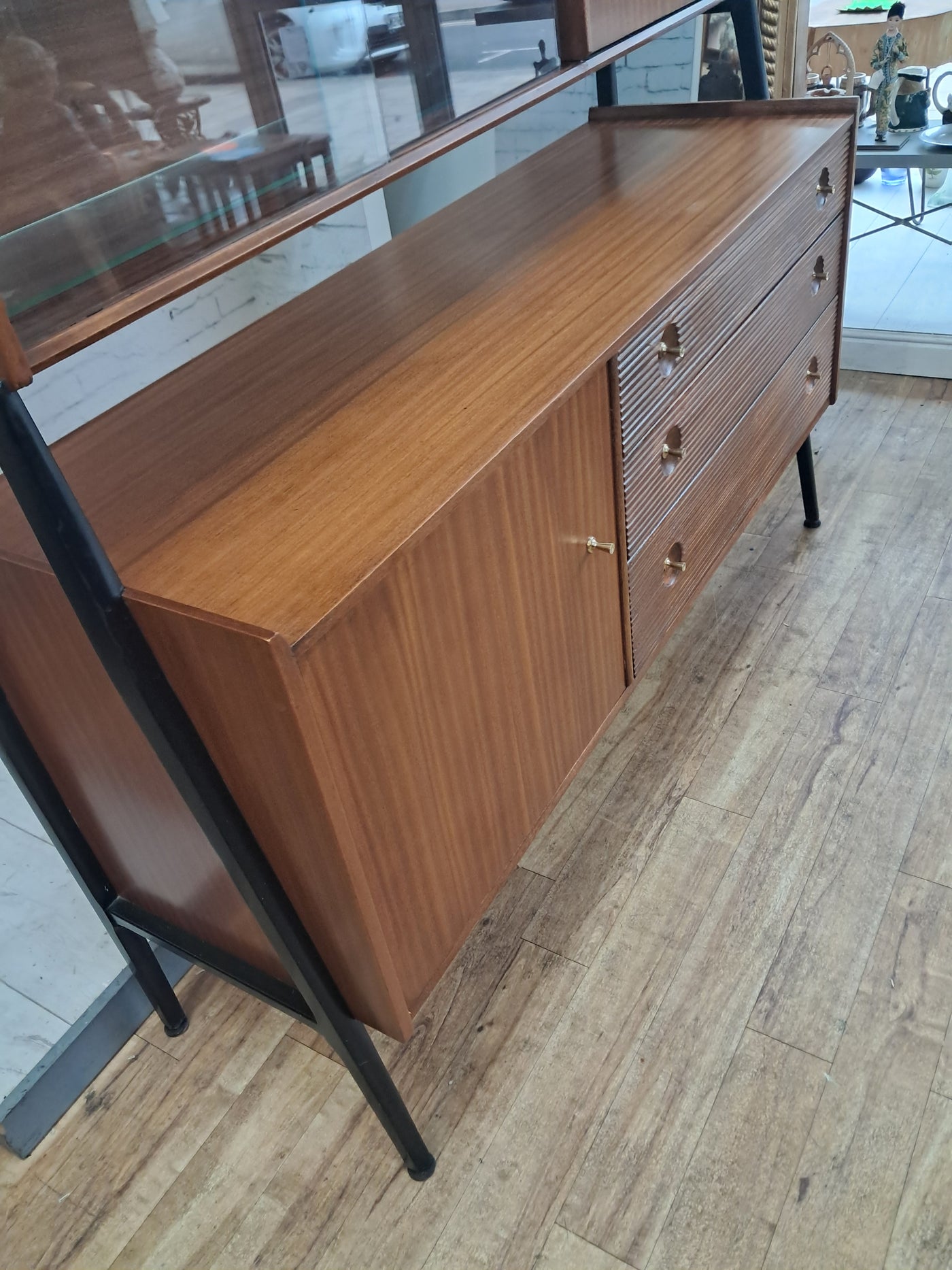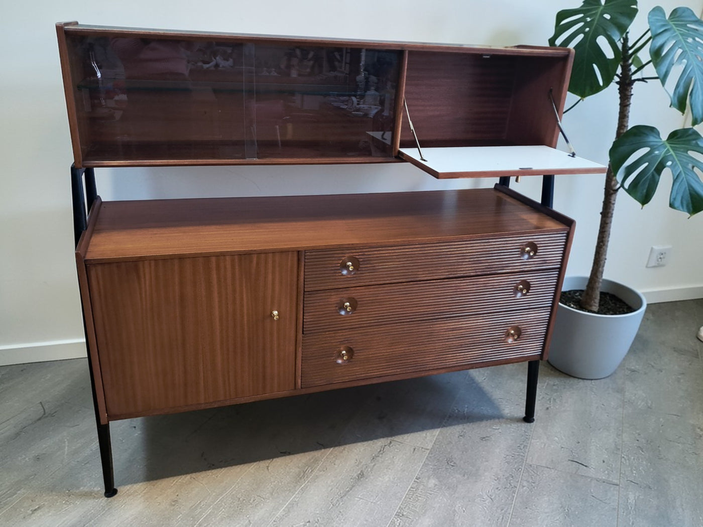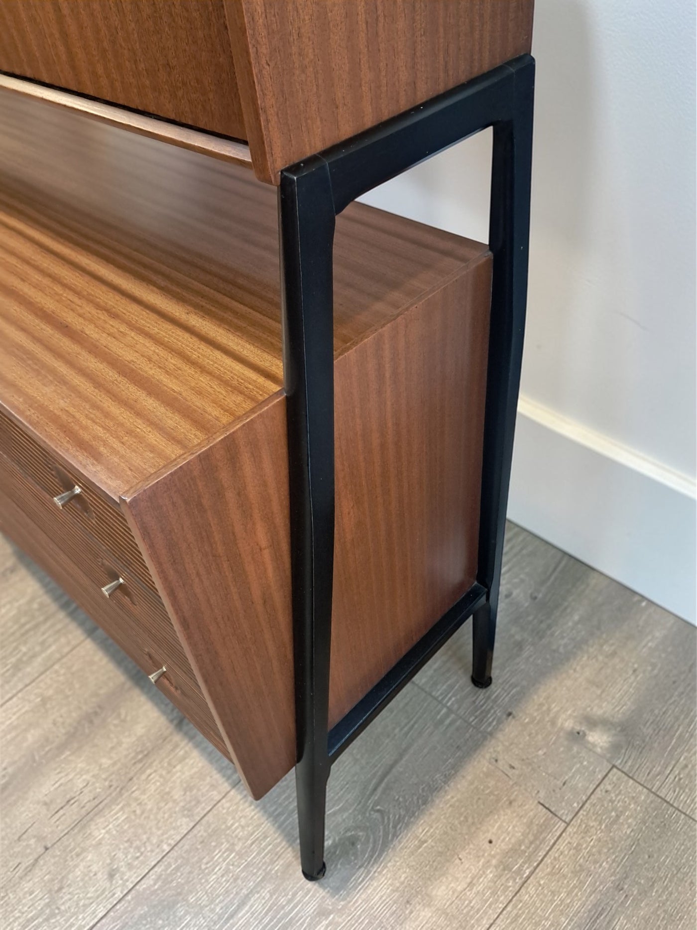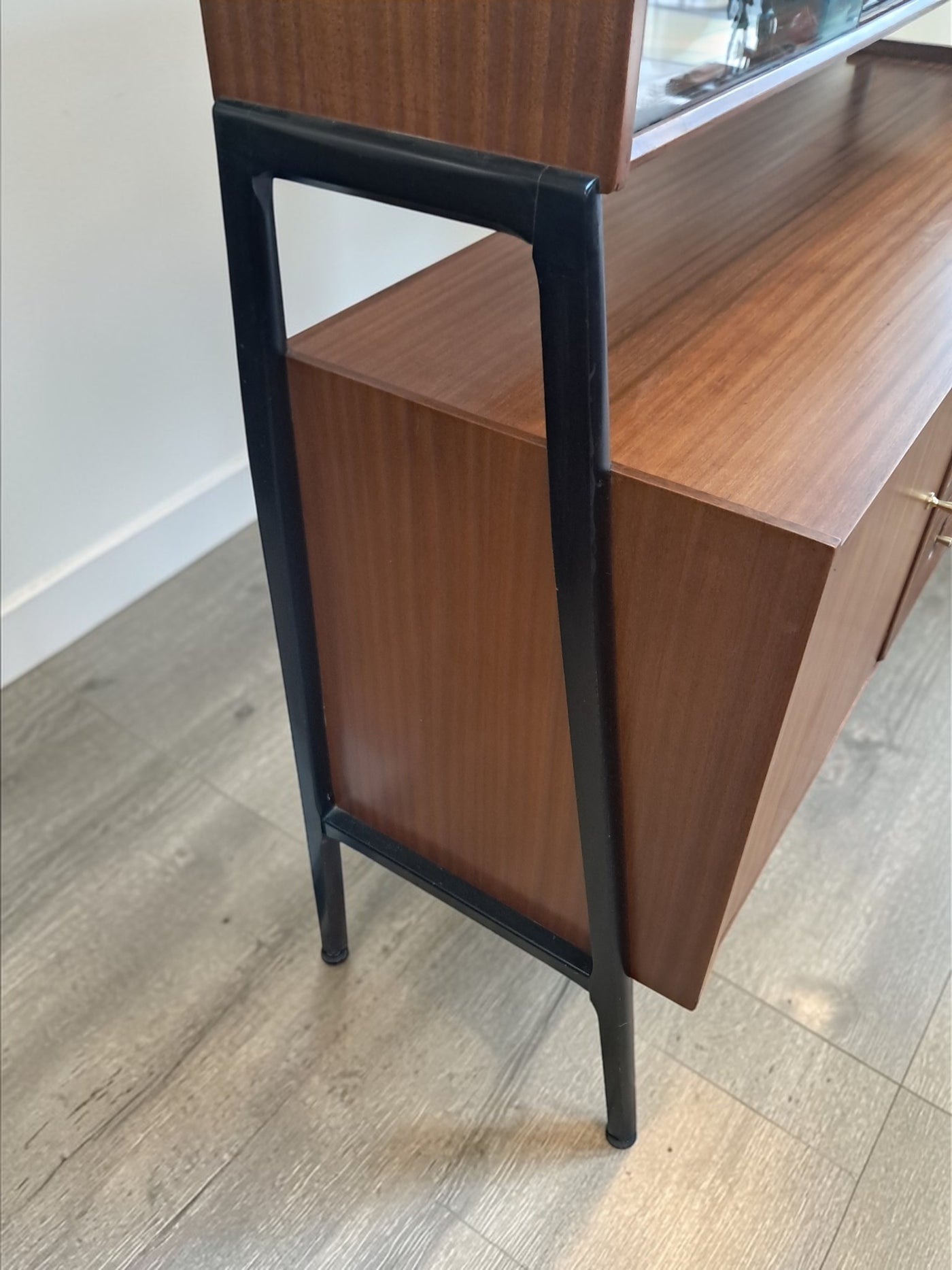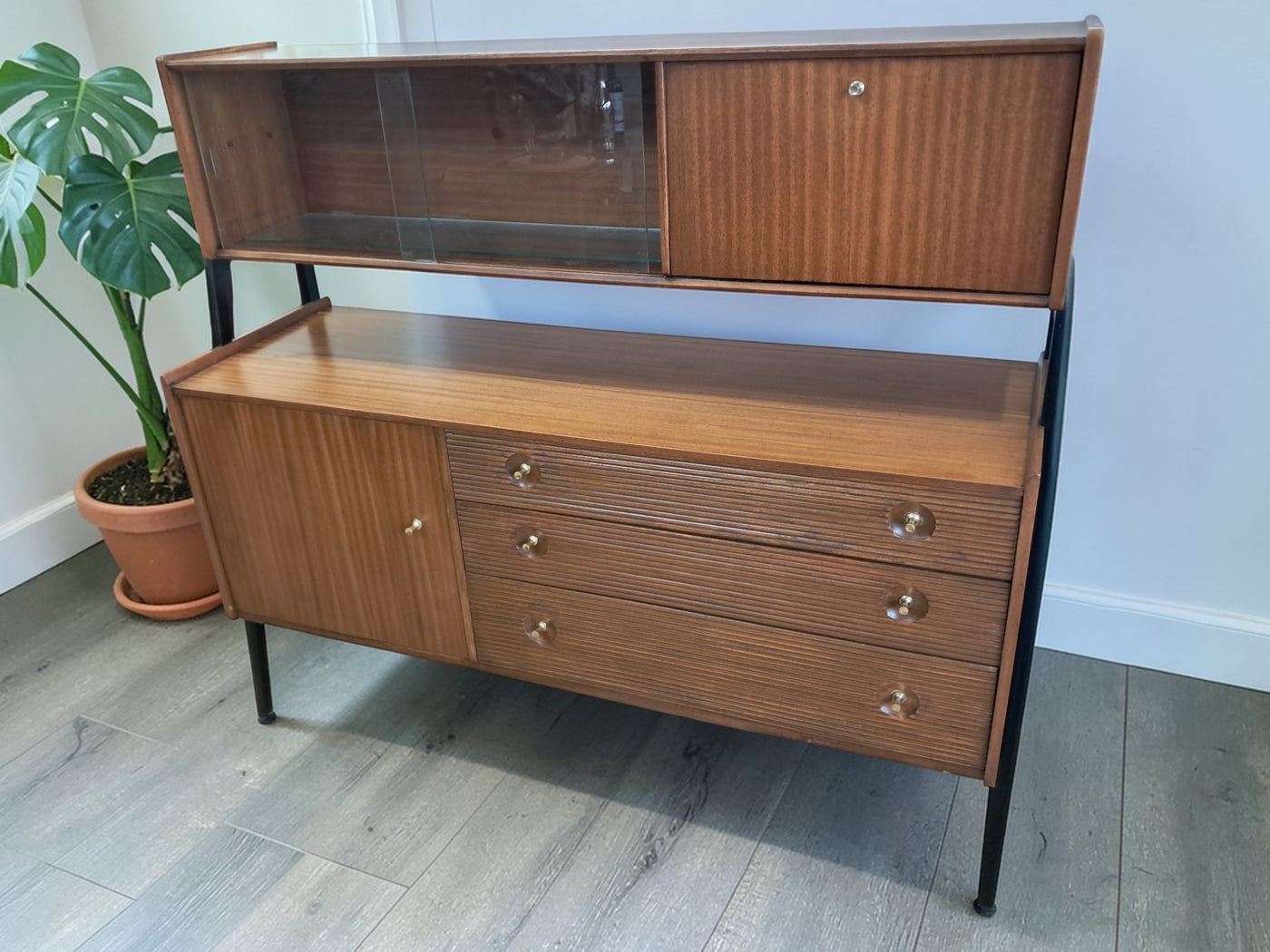 {"id":15775261524346,"title":"Mid Century Vintage Nathan Sideboard Highboard Drinks Cabinet Teak Retro 1960","handle":"mid-century-vintage-nathan-sideboard-highboard-drinks-cabinet-teak-retro-1960","description":"\u003cp\u003e\u003cstrong\u003eNathan Mid-Century Modern Highboard \/ Cocktail Cabinet, 1960s\u003c\/strong\u003e\u003c\/p\u003e\n\u003cp\u003eA refined and architectural Nathan drinks cabinet dating from the mid-1960s, presented in exceptional vintage condition. Crafted in richly toned teak, the cabinet is elevated on a distinctive black trapeze-style frame, giving it a light, floating appearance and strong mid-century presence.\u003c\/p\u003e\n\u003cp\u003eThe upper right section features a fall-front cocktail cabinet, opening to reveal a practical white Formica serving surface—ideal for mixing and serving drinks—along with dedicated internal storage for bottles and barware. To the left, a sliding glass-fronted cupboard with internal glass shelf provides elegant display space, perfect for showcasing glassware or decorative pieces.\u003c\/p\u003e\n\u003cp\u003eBelow, the base offers generous storage. Three wide drawers with reeded fronts and brass pull knobs create striking texture and contrast against the teak grain. The top drawer includes a green felt-lined cutlery compartment, and all drawers are dovetail-jointed, reflecting quality craftsmanship. A single-door cupboard to the left, fitted with an internal shelf, completes the storage arrangement.\u003c\/p\u003e\n\u003cp\u003eThe piece retains its original Nathan label and has been professionally cleaned and oiled to enhance the depth and warmth of the teak. A superb example of 1960s British mid-century design—both functional and visually distinctive.\u003c\/p\u003e\n\u003cp\u003e\u003cstrong\u003eApproximate Dimensions:\u003c\/strong\u003e\u003c\/p\u003e\n\u003cp\u003eWidth: 137 cm\u003c\/p\u003e\n\u003cp\u003eDepth: 45 cm\u003c\/p\u003e\n\u003cp\u003eHeight: 125 cm\u003c\/p\u003e\n\u003cp\u003e\u003cstrong\u003eFREE collection from our shop\u003cspan\u003e \u003c\/span\u003e\u003c\/strong\u003eby appointment only: Tel: 01895 675596\u003c\/p\u003e\n\u003cp\u003eAll of our furniture has been restored\/upcycled professionally with care and attention using quality paints and materials. This item is in exceptional vintage condition.\u003c\/p\u003e\n\u003cp\u003eOur motto is to reuse and recycle these wonderful antique and vintage items so that they get a new lease of life and at the same time you will have a unique, personal item of good quality in your home that will also contribute to the world's carbon footprint. We owe it to our future generations NOT to be a throwaway society.\u003c\/p\u003e\n\u003cp\u003eFREE collection from our shop by appointment only: Tel: 01895 675596\u003c\/p\u003e\n\u003cp\u003eThe delivery quoted in this listing is for mainland UK only.\u003c\/p\u003e\n\u003cp\u003ePlease contact us for a delivery quote to Cornwall, Scotland, Highlands or Islands or Offshore UK, Northern Ireland, Jersey, Guernsey, IOW, etc as it may be more than the price quote.\u003c\/p\u003e\n\u003cp\u003eCourier price quoted is for one man courier to ground floor level only – help will be needed your end. Timed and exact delivery day requests are not available but delivery will normally be within a two week window. If you wish to have a two man courier then we can give you a quote for this.\u003c\/p\u003e\n\u003cp\u003eThis item is available to view at our showroom RetroNovia, 12 New Pond Parade, West End Road, Ruislip Gardens, Middlesex HA4 6LR . Please call us on 01895 675596 to make sure the item is available before coming to view.\u003c\/p\u003e\n\u003cp\u003eWe are located easy access from London and Oxford and are directly off the Main A40 Polish War memorial junction.\u003c\/p\u003e","published_at":"2026-02-28T08:36:19+00:00","created_at":"2026-02-28T08:36:19+00:00","vendor":"Nathan","type":"Sideboard","tags":["Mid Century","Sideboard"],"price":52500,"price_min":52500,"price_max":52500,"available":true,"price_varies":false,"compare_at_price":55000,"compare_at_price_min":55000,"compare_at_price_max":55000,"compare_at_price_varies":false,"variants":[{"id":56632362959226,"title":"Default Title","option1":"Default Title","option2":null,"option3":null,"sku":null,"requires_shipping":true,"taxable":false,"featured_image":null,"available":true,"name":"Mid Century Vintage Nathan Sideboard Highboard Drinks Cabinet Teak Retro 1960","public_title":null,"options":["Default Title"],"price":52500,"weight":80000,"compare_at_price":55000,"inventory_management":"shopify","barcode":null,"requires_selling_plan":false,"selling_plan_allocations":[]}],"images":["\/\/retronovia.co.uk\/cdn\/shop\/files\/nathan_sideboard_drinks_cabinet_1.jpg?v=1772267836","\/\/retronovia.co.uk\/cdn\/shop\/files\/nathan_sideboard_drinks_cabinet_2.jpg?v=1772267835","\/\/retronovia.co.uk\/cdn\/shop\/files\/nathan_sideboard_drinks_cabinet_3.jpg?v=1772267836","\/\/retronovia.co.uk\/cdn\/shop\/files\/nathan_sideboard_drinks_cabinet_4.jpg?v=1772267836","\/\/retronovia.co.uk\/cdn\/shop\/files\/nathan_sideboard_drinks_cabinet_5.jpg?v=1772267836","\/\/retronovia.co.uk\/cdn\/shop\/files\/nathan_sideboard_drinks_cabinet_6.jpg?v=1772267836","\/\/retronovia.co.uk\/cdn\/shop\/files\/nathan_sideboard_drinks_cabinet_7.jpg?v=1772267836","\/\/retronovia.co.uk\/cdn\/shop\/files\/nathan_sideboard_drinks_cabinet_8.jpg?v=1772267836","\/\/retronovia.co.uk\/cdn\/shop\/files\/nathan_sideboard_drinks_cabinet_9.jpg?v=1772267835","\/\/retronovia.co.uk\/cdn\/shop\/files\/nathan_sideboard_drinks_cabinet_10.jpg?v=1772267835","\/\/retronovia.co.uk\/cdn\/shop\/files\/nathan_sideboard_drinks_cabinet_11.jpg?v=1772267837","\/\/retronovia.co.uk\/cdn\/shop\/files\/nathan_sideboard_drinks_cabinet_12.jpg?v=1772267837","\/\/retronovia.co.uk\/cdn\/shop\/files\/nathan_sideboard_drinks_cabinet_13.jpg?v=1772267837","\/\/retronovia.co.uk\/cdn\/shop\/files\/nathan_sideboard_drinks_cabinet_14.jpg?v=1772