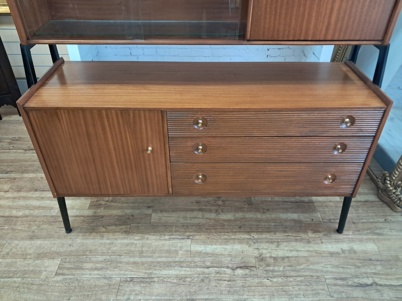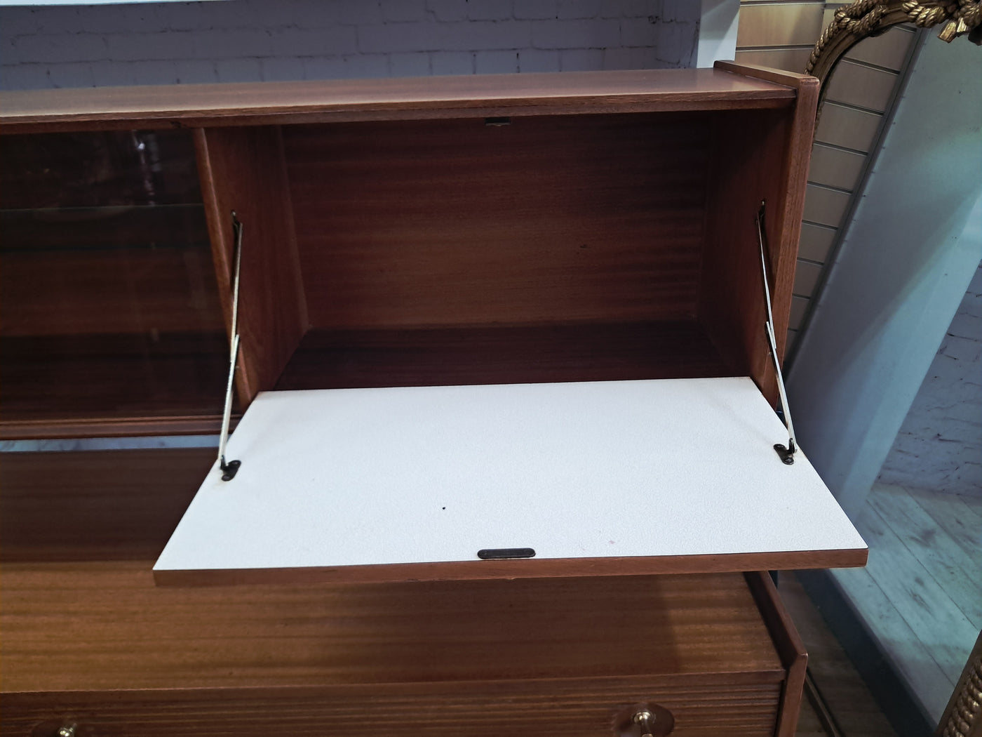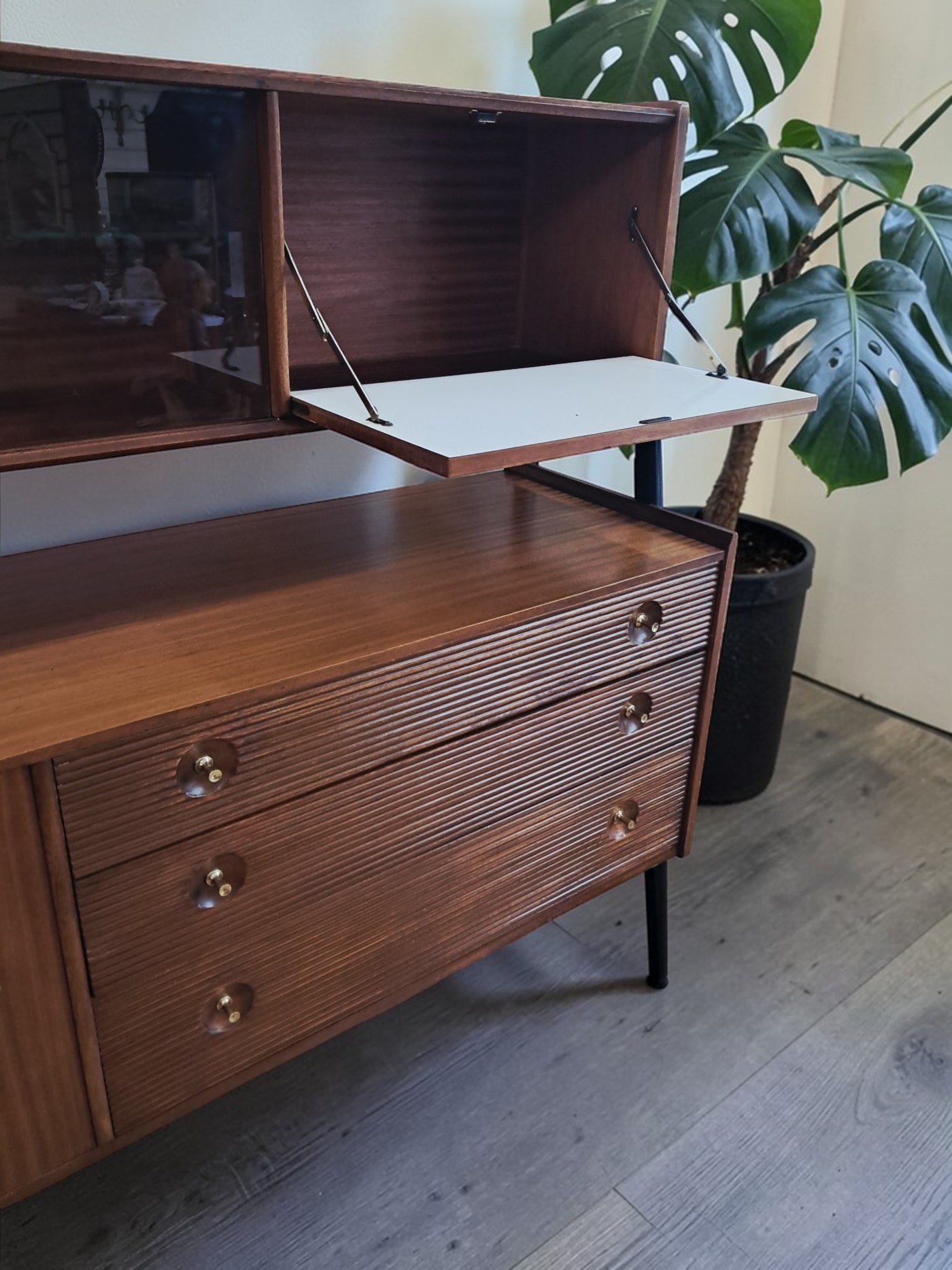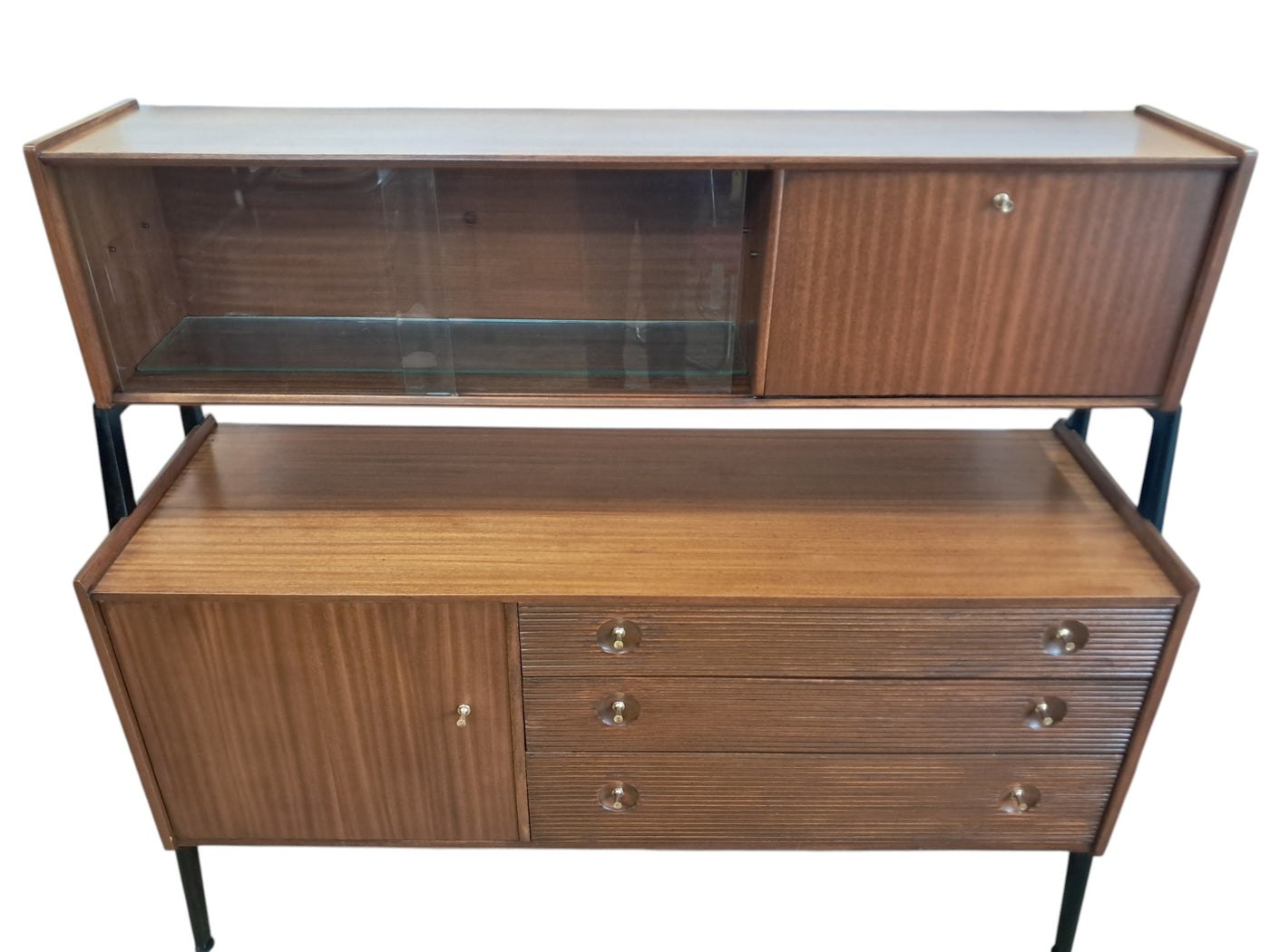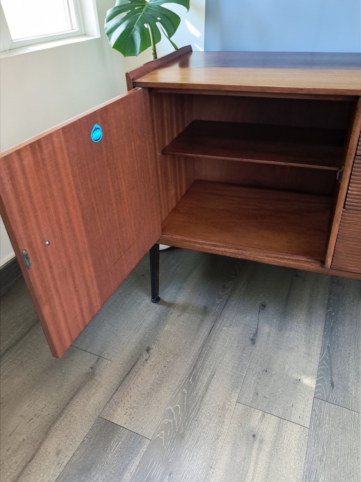 {"id":15775261524346,"title":"Mid Century Vintage Nathan Sideboard Highboard Drinks Cabinet Teak Retro 1960","handle":"mid-century-vintage-nathan-sideboard-highboard-drinks-cabinet-teak-retro-1960","description":"\u003cp\u003e\u003cstrong\u003eNathan Mid-Century Modern Highboard \/ Cocktail Cabinet, 1960s\u003c\/strong\u003e\u003c\/p\u003e\n\u003cp\u003eA refined and architectural Nathan drinks cabinet dating from the mid-1960s, presented in exceptional vintage condition. Crafted in richly toned teak, the cabinet is elevated on a distinctive black trapeze-style frame, giving it a light, floating appearance and strong mid-century presence.\u003c\/p\u003e\n\u003cp\u003eThe upper right section features a fall-front cocktail cabinet, opening to reveal a practical white Formica serving surface—ideal for mixing and serving drinks—along with dedicated internal storage for bottles and barware. To the left, a sliding glass-fronted cupboard with internal glass shelf provides elegant display space, perfect for showcasing glassware or decorative pieces.\u003c\/p\u003e\n\u003cp\u003eBelow, the base offers generous storage. Three wide drawers with reeded fronts and brass pull knobs create striking texture and contrast against the teak grain. The top drawer includes a green felt-lined cutlery compartment, and all drawers are dovetail-jointed, reflecting quality craftsmanship. A single-door cupboard to the left, fitted with an internal shelf, completes the storage arrangement.\u003c\/p\u003e\n\u003cp\u003eThe piece retains its original Nathan label and has been professionally cleaned and oiled to enhance the depth and warmth of the teak. A superb example of 1960s British mid-century design—both functional and visually distinctive.\u003c\/p\u003e\n\u003cp\u003e\u003cstrong\u003eApproximate Dimensions:\u003c\/strong\u003e\u003c\/p\u003e\n\u003cp\u003eWidth: 137 cm\u003c\/p\u003e\n\u003cp\u003eDepth: 45 cm\u003c\/p\u003e\n\u003cp\u003eHeight: 125 cm\u003c\/p\u003e\n\u003cp\u003e\u003cstrong\u003eFREE collection from our shop\u003cspan\u003e \u003c\/span\u003e\u003c\/strong\u003eby appointment only: Tel: 01895 675596\u003c\/p\u003e\n\u003cp\u003eAll of our furniture has been restored\/upcycled professionally with care and attention using quality paints and materials. This item is in exceptional vintage condition.\u003c\/p\u003e\n\u003cp\u003eOur motto is to reuse and recycle these wonderful antique and vintage items so that they get a new lease of life and at the same time you will have a unique, personal item of good quality in your home that will also contribute to the world's carbon footprint. We owe it to our future generations NOT to be a throwaway society.\u003c\/p\u003e\n\u003cp\u003eFREE collection from our shop by appointment only: Tel: 01895 675596\u003c\/p\u003e\n\u003cp\u003eThe delivery quoted in this listing is for mainland UK only.\u003c\/p\u003e\n\u003cp\u003ePlease contact us for a delivery quote to Cornwall, Scotland, Highlands or Islands or Offshore UK, Northern Ireland, Jersey, Guernsey, IOW, etc as it may be more than the price quote.\u003c\/p\u003e\n\u003cp\u003eCourier price quoted is for one man courier to ground floor level only – help will be needed your end. Timed and exact delivery day requests are not available but delivery will normally be within a two week window. If you wish to have a two man courier then we can give you a quote for this.\u003c\/p\u003e\n\u003cp\u003eThis item is available to view at our showroom RetroNovia, 12 New Pond Parade, West End Road, Ruislip Gardens, Middlesex HA4 6LR . Please call us on 01895 675596 to make sure the item is available before coming to view.\u003c\/p\u003e\n\u003cp\u003eWe are located easy access from London and Oxford and are directly off the Main A40 Polish War memorial junction.\u003c\/p\u003e","published_at":"2026-02-28T08:36:19+00:00","created_at":"2026-02-28T08:36:19+00:00","vendor":"Nathan","type":"Sideboard","tags":["Mid Century","Sideboard"],"price":52500,"price_min":52500,"price_max":52500,"available":true,"price_varies":false,"compare_at_price":55000,"compare_at_price_min":55000,"compare_at_price_max":55000,"compare_at_price_varies":false,"variants":[{"id":56632362959226,"title":"Default Title","option1":"Default Title","option2":null,"option3":null,"sku":null,"requires_shipping":true,"taxable":false,"featured_image":null,"available":true,"name":"Mid Century Vintage Nathan Sideboard Highboard Drinks Cabinet Teak Retro 1960","public_title":null,"options":["Default Title"],"price":52500,"weight":80000,"compare_at_price":55000,"inventory_management":"shopify","barcode":null,"requires_selling_plan":false,"selling_plan_allocations":[]}],"images":["\/\/retronovia.co.uk\/cdn\/shop\/files\/nathan_sideboard_drinks_cabinet_1.jpg?v=1772267836","\/\/retronovia.co.uk\/cdn\/shop\/files\/nathan_sideboard_drinks_cabinet_2.jpg?v=1772267835","\/\/retronovia.co.uk\/cdn\/shop\/files\/nathan_sideboard_drinks_cabinet_3.jpg?v=1772267836","\/\/retronovia.co.uk\/cdn\/shop\/files\/nathan_sideboard_drinks_cabinet_4.jpg?v=1772267836","\/\/retronovia.co.uk\/cdn\/shop\/files\/nathan_sideboard_drinks_cabinet_5.jpg?v=1772267836","\/\/retronovia.co.uk\/cdn\/shop\/files\/nathan_sideboard_drinks_cabinet_6.jpg?v=1772267836","\/\/retronovia.co.uk\/cdn\/shop\/files\/nathan_sideboard_drinks_cabinet_7.jpg?v=1772267836","\/\/retronovia.co.uk\/cdn\/shop\/files\/nathan_sideboard_drinks_cabinet_8.jpg?v=1772267836","\/\/retronovia.co.uk\/cdn\/shop\/files\/nathan_sideboard_drinks_cabinet_9.jpg?v=1772267835","\/\/retronovia.co.uk\/cdn\/shop\/files\/nathan_sideboard_drinks_cabinet_10.jpg?v=1772267835","\/\/retronovia.co.uk\/cdn\/shop\/files\/nathan_sideboard_drinks_cabinet_11.jpg?v=1772267837","\/\/retronovia.co.uk\/cdn\/shop\/files\/nathan_sideboard_drinks_cabinet_12.jpg?v=1772267837","\/\/retronovia.co.uk\/cdn\/shop\/files\/nathan_sideboard_drinks_cabinet_13.jpg?v=1772267837","\/\/retronovia.co.uk\/cdn\/shop\/files\/nathan_sideboard_drinks_cabinet_14.jpg?v=1772