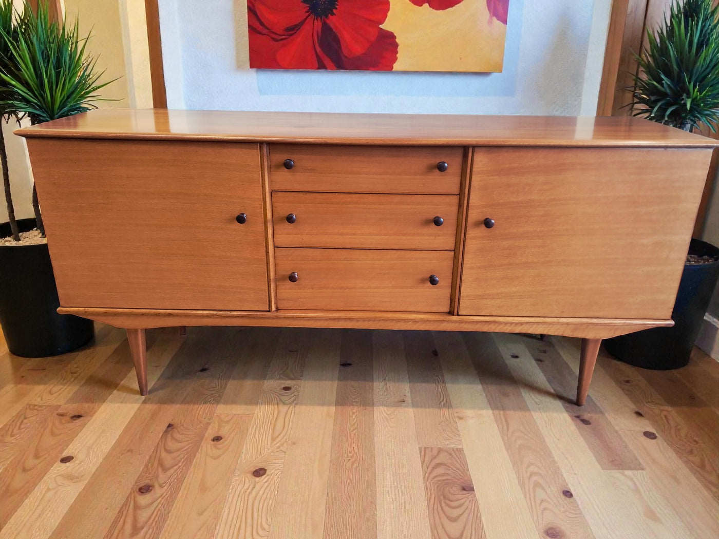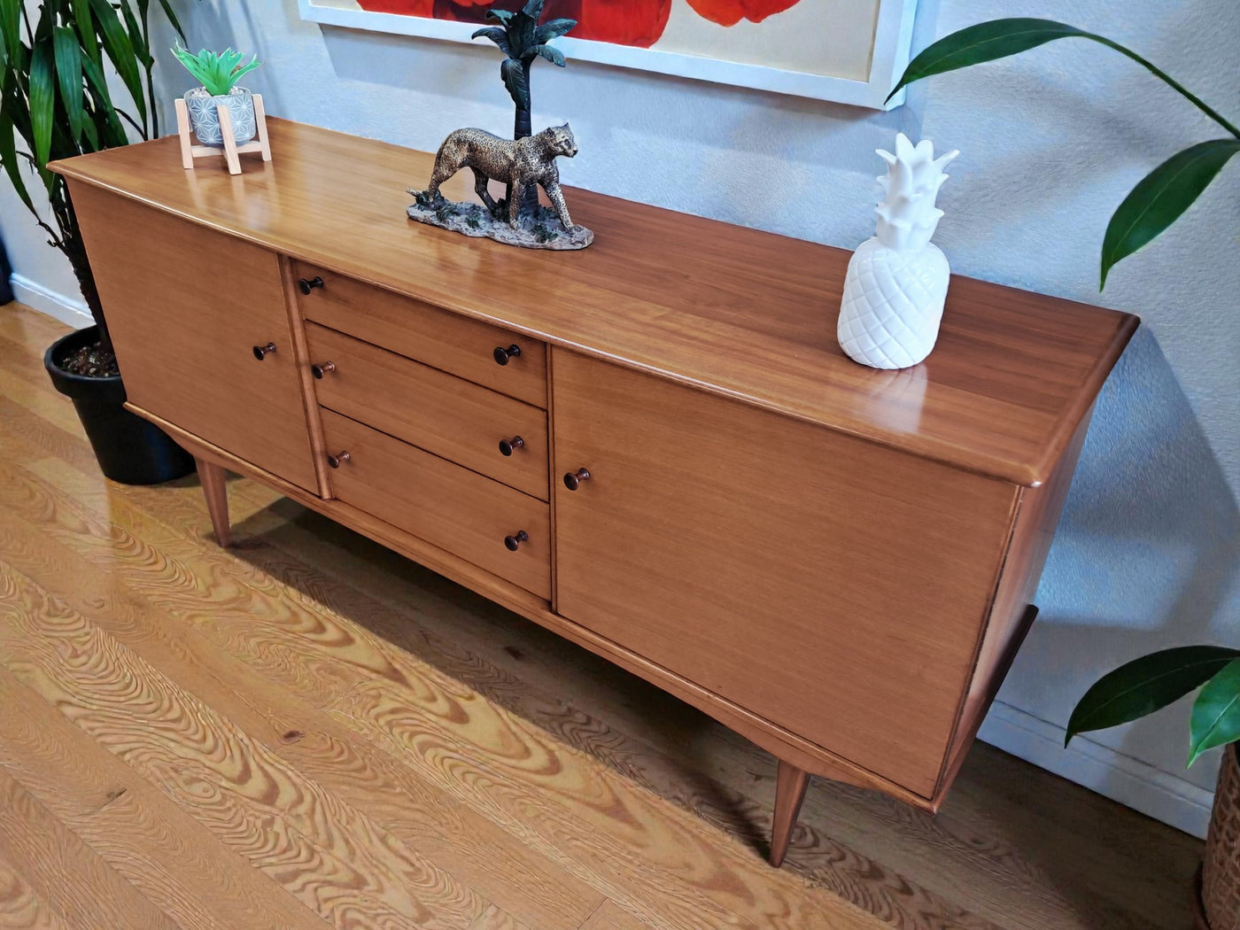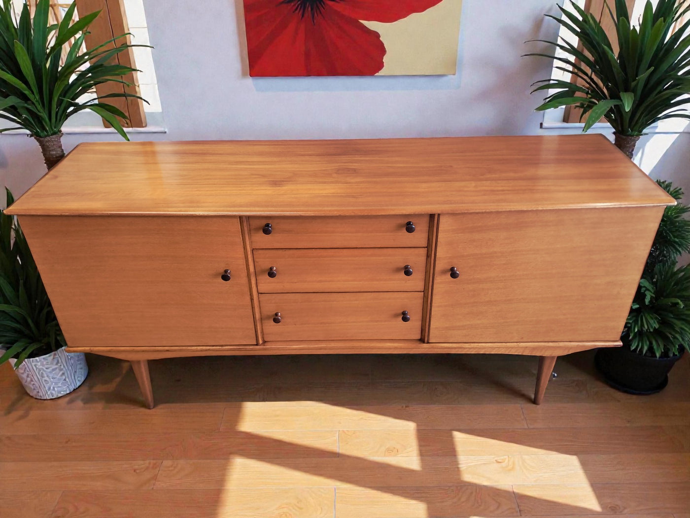{"id":15609289933178,"title":"Mid Century Vintage Sideboard Alfred Cox Vintage Walnut TV Unit 1950's vgc","handle":"mid-century-vintage-sideboard-alfred-cox-vintage-walnut-tv-unit-restored-1950s","description":"\u003cp\u003e\u003cstrong\u003eAlfred Cox Mid-Century Walnut Sideboard – Professionally Restored, 1950s\u003c\/strong\u003e\u003c\/p\u003e\n\u003cp\u003eThis exceptional mid-century sideboard was designed by the esteemed British furniture maker Alfred Cox and dates to the 1950s, a period synonymous with restrained elegance and exemplary craftsmanship. Originally retailed through Heals of London and other prestigious outlets, this piece has been professionally restored and is presented in superb vintage condition.\u003c\/p\u003e\n\u003cp\u003eCrafted from beautiful walnut wood, the sideboard displays a warm, rich tone and a striking natural grain that is particularly evident across the expansive top and clean-lined frontage. Its well-balanced proportions make it an ideal choice for modern living spaces—substantial yet not overly long—allowing it to function equally well as a refined storage piece or an elegant TV unit.\u003c\/p\u003e\n\u003cp\u003eThe central section comprises three graduated drawers, each constructed with traditional dovetail joints and finished with understated sculpted wooden pull handles. The top drawer retains its original felt lining, designed for cutlery or delicate items. Flanking the drawers are two generously sized cupboards, each offering practical internal shelving for versatile storage.\u003c\/p\u003e\n\u003cp\u003eThe sideboard is raised on four gently tapered wooden legs, lending the piece a light, architectural presence that is characteristic of Alfred Cox’s mid-century designs. Inside one cupboard door, the original metal AC badge and ‘Handcraft’ registered trademark remain intact, confirming the authenticity and heritage of this finely made piece.\u003c\/p\u003e\n\u003cp\u003eA rare and highly desirable example of British mid-century furniture, this Alfred Cox sideboard combines timeless design with everyday practicality—an increasingly scarce find of genuine quality and enduring appeal.\u003c\/p\u003e\n\u003cp\u003e\u003cstrong\u003eFor Lovers of Vintage Furniture \u0026amp; Accessories\u003c\/strong\u003e\u003c\/p\u003e\n\u003cp\u003eA timeless and stylish addition to any home, this piece is perfect for those who appreciate mid-century design, as well as interior designers looking to bring its elegance into their projects.\u003c\/p\u003e\n\u003cp\u003e\u003cstrong\u003eThe measurements are (all measurements are approximate)\u003c\/strong\u003e\u003c\/p\u003e\n\u003cp\u003eLength : 172 cm\u003c\/p\u003e\n\u003cp\u003eDepth 49.5 cm\u003c\/p\u003e\n\u003cp\u003eHeight: 78.5 cm\u003c\/p\u003e\n\u003cp\u003e\u003cstrong\u003eFREE collection from our showroom available\u003c\/strong\u003e\u003cspan\u003e \u003c\/span\u003eby appointment only. Viewing also available. Tel: 01895675596\u003c\/p\u003e\n\u003cp\u003eOur motto is to reuse and recycle these wonderful antique and vintage items so that they get a new lease of life and at the same time you will have a unique, personal item of good quality in your home that will also contribute to the world's carbon footprint. We owe it to our future generations NOT to be a throwaway society.\u003c\/p\u003e\n\u003cp\u003eAll of our furniture has been restored\/upcycled professionally with care and attention using quality paints and materials. This sideboard is in exceptional condition.\u003c\/p\u003e\n\u003cp\u003eThe delivery quoted in this listing is for mainland UK only.\u003c\/p\u003e\n\u003cp\u003ePlease contact us for a delivery quote to Cornwall, Scotland, Highlands or Islands or Offshore UK, Northern Ireland, Jersey, Guernsey, IOW, etc as it may be more than the price quote.\u003c\/p\u003e\n\u003cp\u003eCourier price quoted is for one man courier to ground floor level only – help will be needed your end. Timed and exact delivery day requests are not available but delivery will normally be within a two week window. If you wish to have a two man courier then we can give you a quote for this.\u003c\/p\u003e\n\u003cp\u003eThis item is available to view in our showroom RetroNovia, 12 New Pond Parade, West End Road, Ruislip Gardens, Middlesex HA4 6LR . Please call us on 01895 675596 to make sure the item is available before coming to view.\u003c\/p\u003e\n\u003cp\u003eWe are located easy access from London and Oxford and are directly off the Main A40 Polish War memorial junction.\u003c\/p\u003e","published_at":"2026-01-08T18:18:00+00:00","created_at":"2026-01-08T18:18:00+00:00","vendor":"Alfred Cox","type":"Sideboard","tags":["Mid Century","Sideboard"],"price":69500,"price_min":69500,"price_max":69500,"available":true,"price_varies":false,"compare_at_price":null,"compare_at_price_min":0,"compare_at_price_max":0,"compare_at_price_varies":false,"variants":[{"id":56438021554554,"title":"Default Title","option1":"Default Title","option2":null,"option3":null,"sku":null,"requires_shipping":true,"taxable":false,"featured_image":null,"available":true,"name":"Mid Century Vintage Sideboard Alfred Cox Vintage Walnut TV Unit 1950's vgc","public_title":null,"options":["Default Title"],"price":69500,"weight":80000,"compare_at_price":null,"inventory_management":"shopify","barcode":null,"requires_selling_plan":false,"selling_plan_allocations":[]}],"images":["\/\/retronovia.co.uk\/cdn\/shop\/files\/sideboard_alfred_cox_mid_century_1.jpg?v=1767896338","\/\/retronovia.co.uk\/cdn\/shop\/files\/sideboard_alfred_cox_mid_century_2.jpg?v=1767896338","\/\/retronovia.co.uk\/cdn\/shop\/files\/sideboard_alfred_cox_mid_century_2a.jpg?v=1767896337","\/\/retronovia.co.uk\/cdn\/shop\/files\/sideboard_alfred_cox_mid_century_3.jpg?v=1767896340","\/\/retronovia.co.uk\/cdn\/shop\/files\/sideboard_alfred_cox_mid_century_4.jpg?v=1767896338","\/\/retronovia.co.uk\/cdn\/shop\/files\/sideboard_alfred_cox_mid_century_5.jpg?v=1767896337