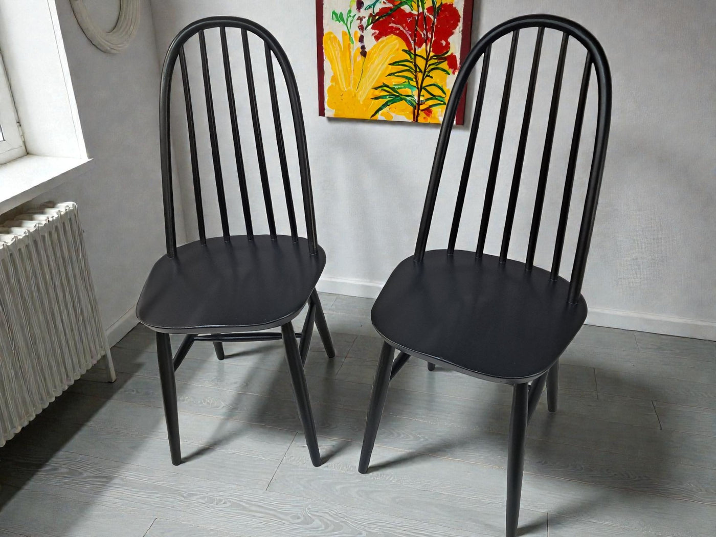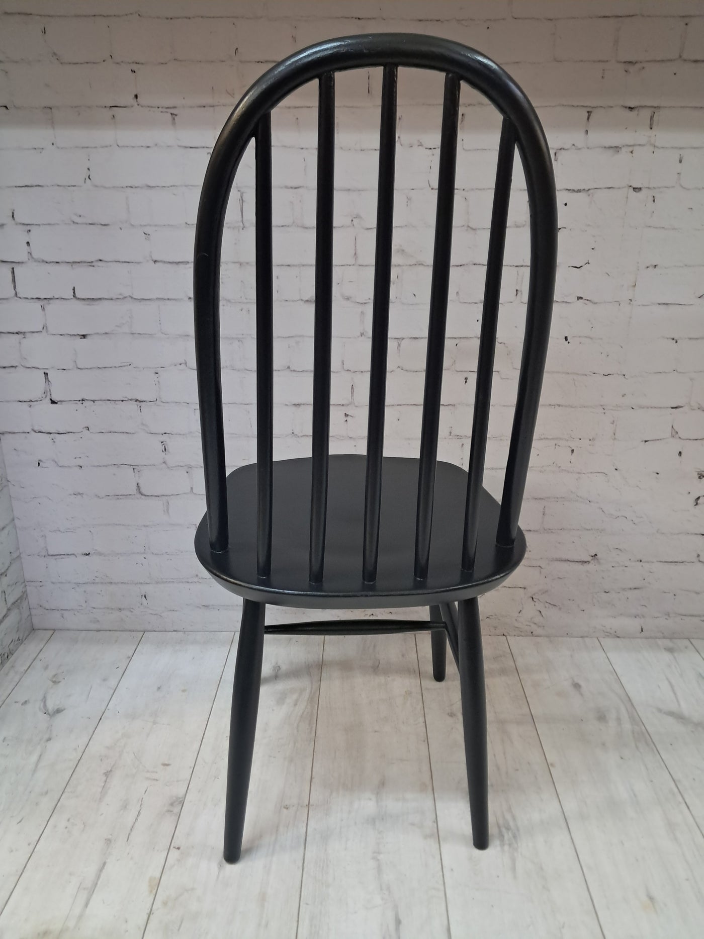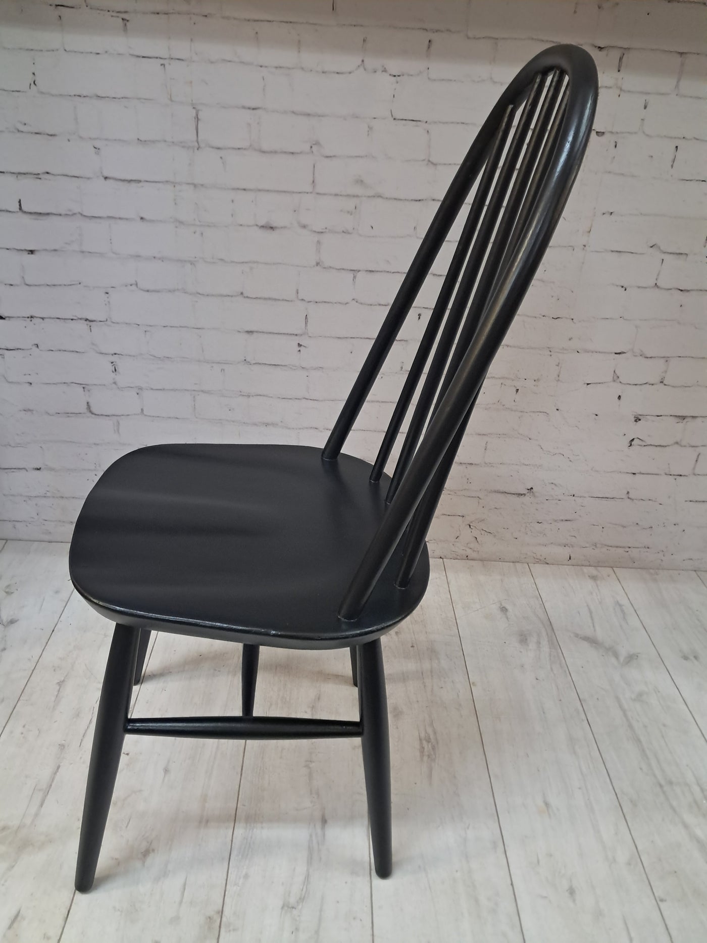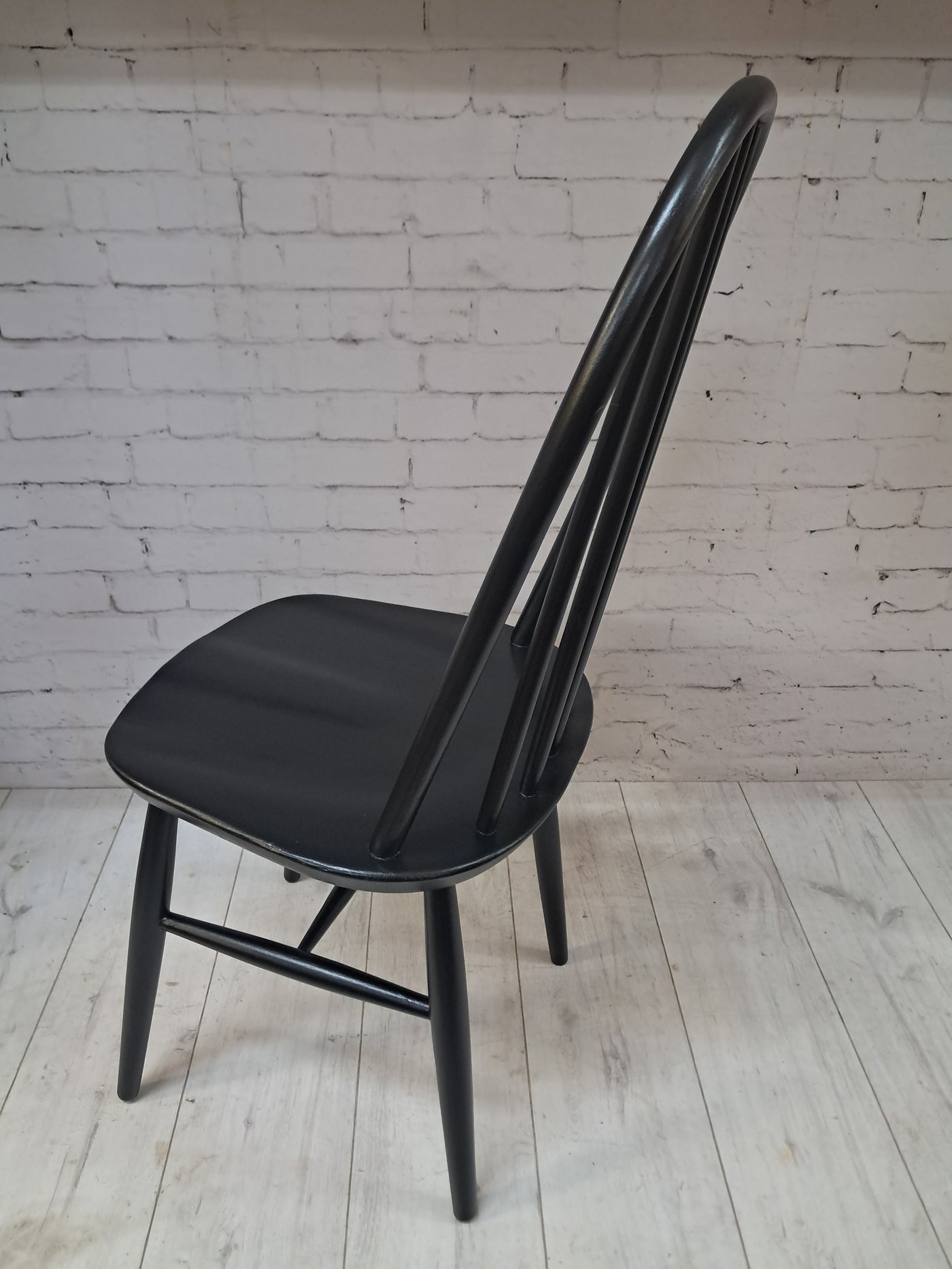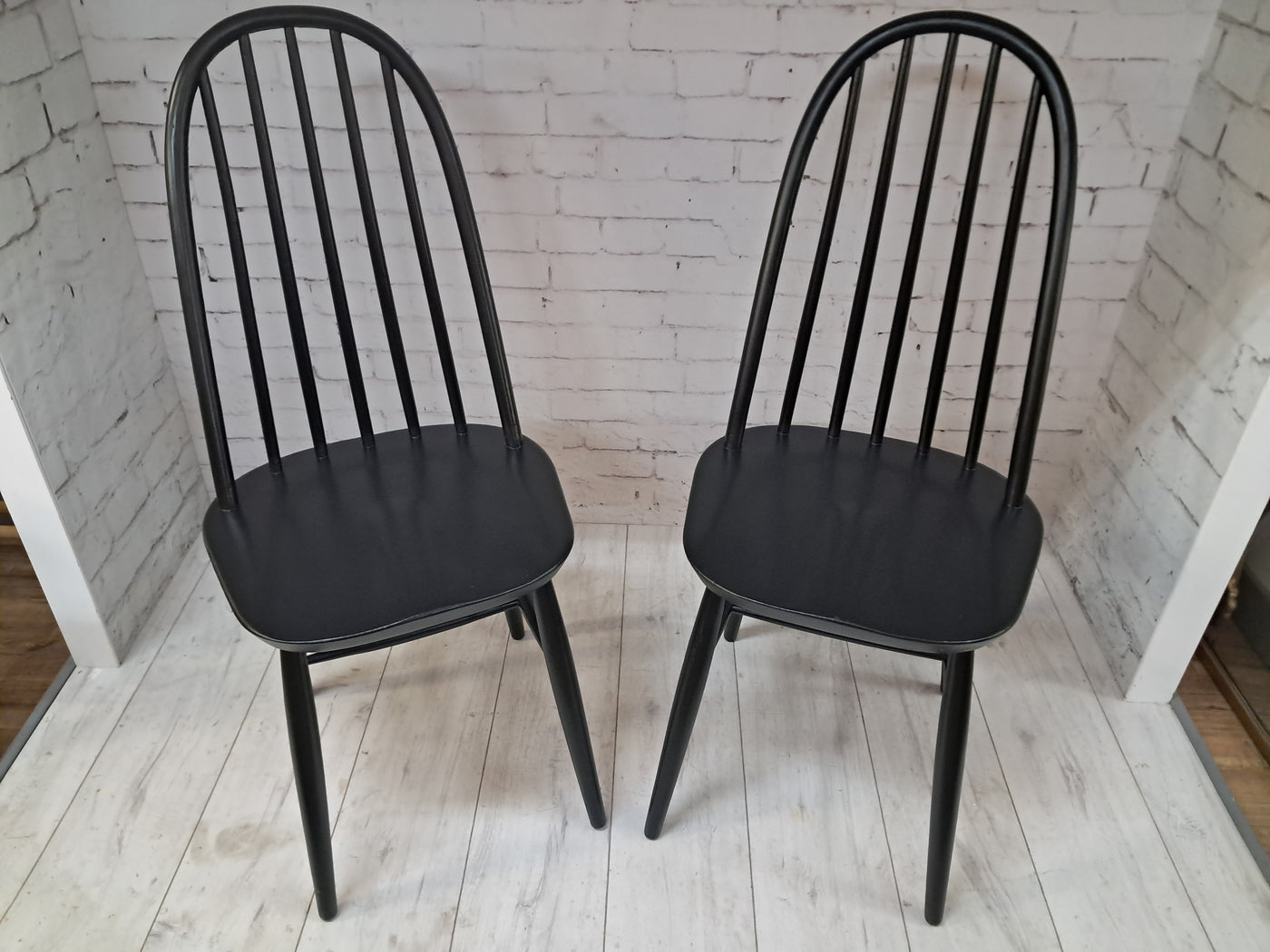 {"id":15606160294266,"title":"Vintage Ercol Windsor Quaker Dining Chairs x 2 - Black Mid Century Chairs Restored 1970","handle":"vintage-ercol-windsor-quaker-dining-chairs-x-2-black-mid-century-chairs-restored-1970","description":"\u003cp\u003e\u003cstrong\u003eMid Century Ercol Windsor Quaker Dining Chairs x 2 - Black Vintage Chairs Restored 1970\u003c\/strong\u003e\u003c\/p\u003e\n\u003cdiv\u003e\n\u003cstrong\u003eA beautifully refined pair of Mid Century Ercol dining chairs, expertly revitalised in a striking Coal Black finish\u003c\/strong\u003e. Originally designed by the celebrated Luciano Ercolani for Ercol in England, this pair from the 1970's showcases everything that makes Mid Century design so timeless — clean lines, sculptural silhouettes, and impeccable craftsmanship. \u003c\/div\u003e\n\u003cdiv\u003e\u003cbr\u003e\u003c\/div\u003e\n\u003cdiv\u003eEach chair features a solid Elm seat paired with a Beech frame, highlighting the natural strength and integrity of Ercol’s materials. The elegant splayed legs, connected with sturdy stretchers, ensure superb stability, while the iconic high hoop backs with five slim spindles offer both style and comfort in equal measure.\u003c\/div\u003e\n\u003cdiv\u003e\u003cbr\u003e\u003c\/div\u003e\n\u003cdiv\u003e\n\u003cstrong\u003eProfessionally sprayed in a luxurious Coal Black paint,\u003c\/strong\u003e\u003cspan\u003e \u003c\/span\u003ethese chairs now carry a refined modern edge while still honouring their Mid Century roots. Their flawless, smooth finish enhances their sculptural form, making them an understated yet commanding addition to any dining room. Beautiful, practical, and steeped in design history, this pair promises to elevate any interior with sophistication and charm.\u003c\/div\u003e\n\u003cdiv\u003e\u003cbr\u003e\u003c\/div\u003e\n\u003cdiv\u003e\n\u003cstrong\u003eFREE collection available from our shop\u003c\/strong\u003e\u003cspan\u003e \u003c\/span\u003eby appointment only. Viewing also available by appointment — Tel: 01895 675596\u003c\/div\u003e\n\u003cdiv\u003e\u003cbr\u003e\u003c\/div\u003e\n\u003cdiv\u003e\u003cstrong\u003eMeasurements (Approx):\u003c\/strong\u003e\u003c\/div\u003e\n\u003cdiv\u003eOverall Height: 98cm Overall Width: 44cm Overall Depth: 42.5cm\u003c\/div\u003e\n\u003cdiv\u003eSeat Height: 46cm Seat Width: 44cm Seat Depth: 42.5cm\u003c\/div\u003e\n\u003cdiv\u003e\u003cbr\u003e\u003c\/div\u003e\n\u003cdiv\u003e\u003cstrong\u003eFor Lovers of Vintage Furniture \u0026amp; Accessories\u003c\/strong\u003e\u003c\/div\u003e\n\u003cdiv\u003e\u003cbr\u003e\u003c\/div\u003e\n\u003cdiv\u003eA timeless and stylish addition to any home, this pair is perfect for those who appreciate Mid Century design, offering practicality and enduring beauty in equal measure.\u003c\/div\u003e\n\u003cdiv\u003e\u003cbr\u003e\u003c\/div\u003e\n\u003cdiv\u003e\u003cb\u003eFor Interior Designers\u003c\/b\u003e\u003c\/div\u003e\n\u003cdiv\u003e\u003cbr\u003e\u003c\/div\u003e\n\u003cdiv\u003eThese chairs provide an elegant, sculptural accent ideal for sophisticated design schemes. A timeless and stylish addition to any home, this set is perfect for those who appreciate mid-century design, as well as interior designers looking to bring its elegance into their projects.\u003c\/div\u003e\n\u003cdiv\u003e\u003cbr\u003e\u003c\/div\u003e\n\u003cdiv\u003eAt our vintage furniture emporium, we wholeheartedly embrace the ethos of reusing and recycling these remarkable antique and vintage treasures. By breathing new life into these items, we not only provide them with a fresh start but also offer you the opportunity to adorn your home with a truly distinctive and high-quality piece, all while making a positive impact on the planet's carbon footprint.\u003c\/div\u003e\n\u003cdiv\u003e\u003cbr\u003e\u003c\/div\u003e\n\u003cdiv\u003eEvery item in our collection has undergone either meticulous restoration, thoughtful upcycling or sympathetic cleaning \u0026amp; oiling, depending on the amount of work needed to bring the item back to its former glory and this is carried out with utmost care and attention. We employ top-notch paints and materials to ensure a professional finish that stands the test of time. It's important to note that, given their antique nature, our pieces may exhibit charming signs of age and minor imperfections, which only add to their character and authenticity.\u003c\/div\u003e\n\u003cdiv\u003e\u003cbr\u003e\u003c\/div\u003e\n\u003cdiv\u003eChoose to be a part of our sustainable journey and relish the chance to own a personalised item of exceptional quality, enriching your living space with a touch of history and reducing environmental impact in the process.\u003c\/div\u003e\n\u003cdiv\u003e\u003cbr\u003e\u003c\/div\u003e\n\u003cdiv\u003eThe delivery quoted in this listing is for mainland UK only.\u003c\/div\u003e\n\u003cdiv\u003ePlease contact us for a delivery quote to Cornwall, Scotland, Highlands or Islands or Offshore UK, Northern Ireland, Jersey, Guernsey, IOW, etc as it may be more than the price quote.\u003c\/div\u003e\n\u003cdiv\u003e\u003cbr\u003e\u003c\/div\u003e\n\u003cdiv\u003eCourier price quoted is for specialist antique courier to ground floor level only. Timed and exact delivery day requests are not available but delivery will normally be within a two week window. If you wish to have a two man courier then we can give you a quote for this.\u003c\/div\u003e\n\u003cdiv\u003e\u003cbr\u003e\u003c\/div\u003e\n\u003cdiv\u003eThis item is available to view at our showroom RetroNovia , 12 New Pond Parade, West End Road, Ruislip Gardens, Middlesex HA4 6LR . Please call us on 01895 675596 to make sure the item is available before coming to view.\u003c\/div\u003e\n\u003cdiv\u003e\u003cbr\u003e\u003c\/div\u003e\n\u003cdiv\u003eWe are located easy access from London and Oxford and are directly off the Main A40 Polish War memorial junction.\u003c\/div\u003e\n\u003cdiv\u003eThis item is available to view at our showroom R