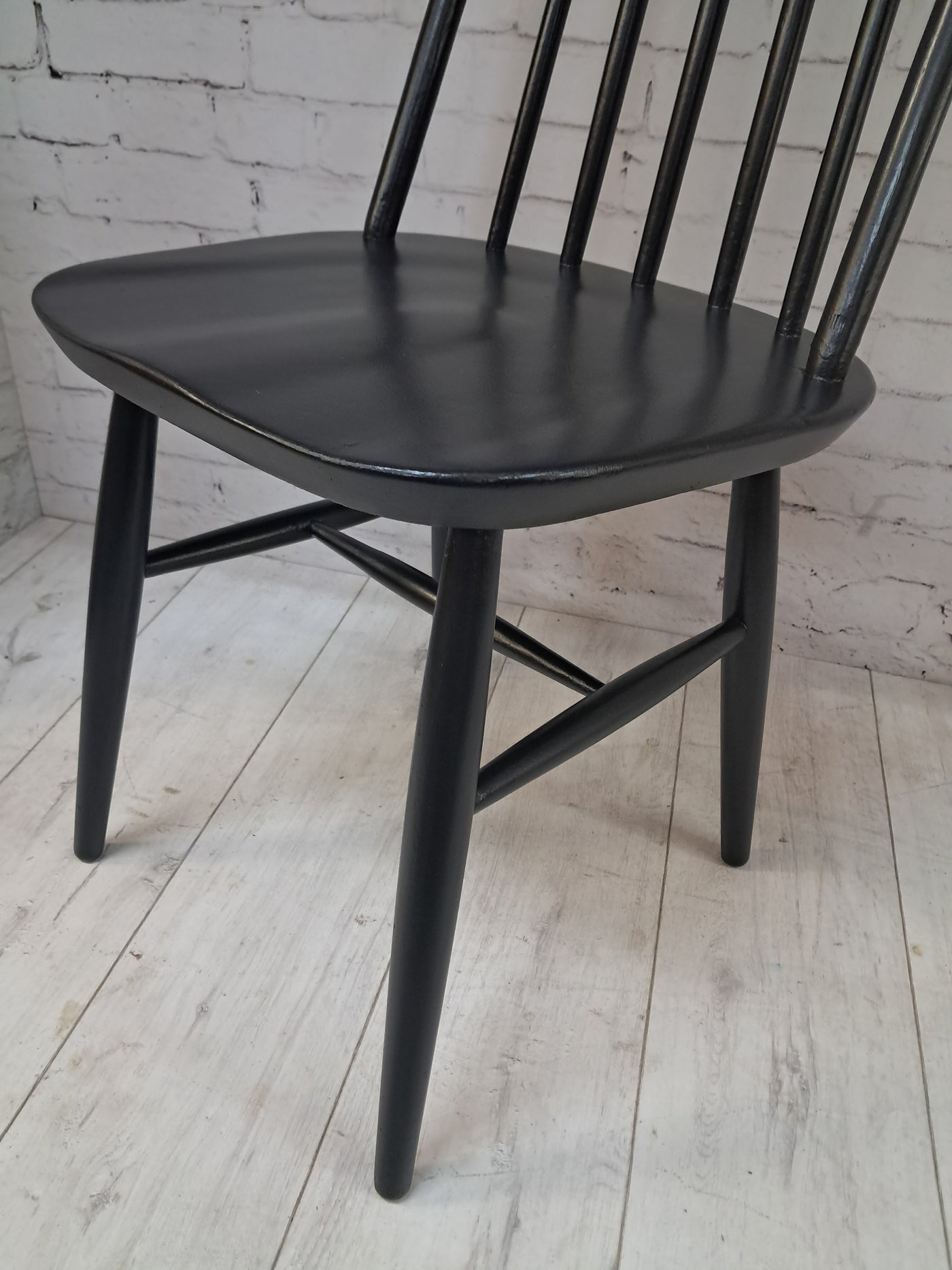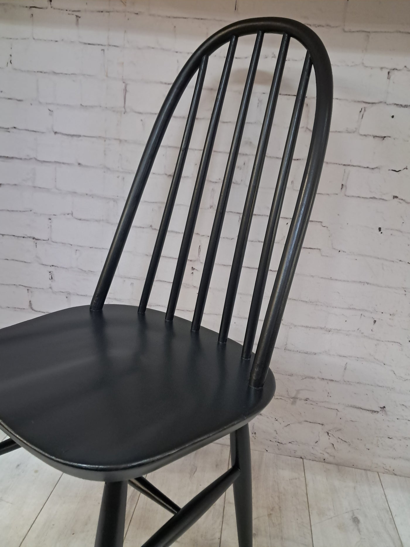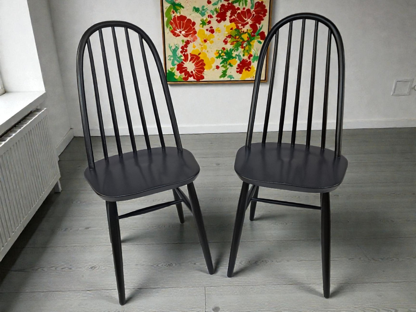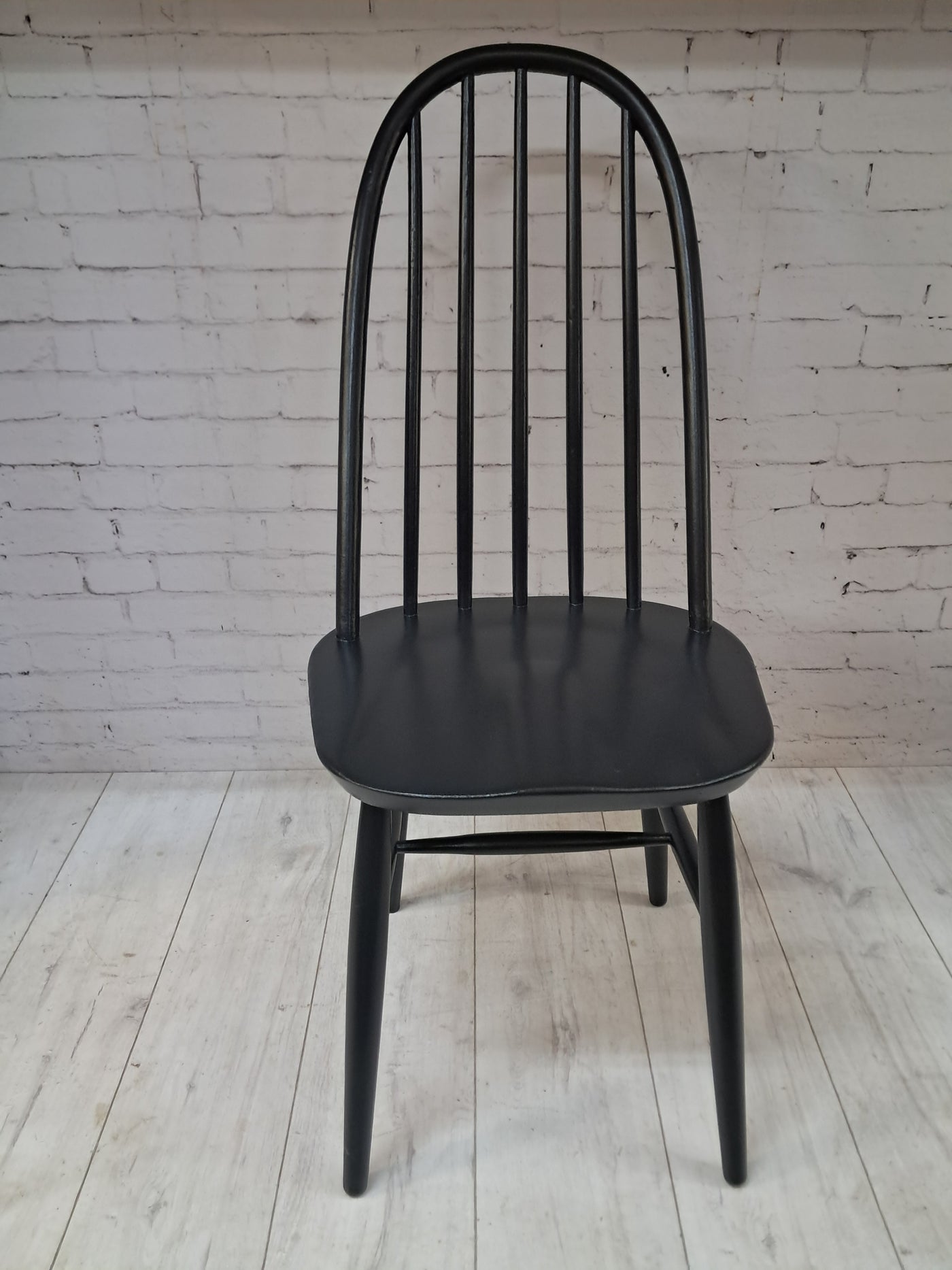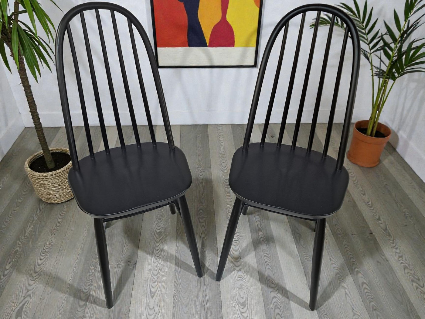 {"id":15606160294266,"title":"Vintage Ercol Windsor Quaker Dining Chairs x 2 - Black Mid Century Chairs Restored 1970","handle":"vintage-ercol-windsor-quaker-dining-chairs-x-2-black-mid-century-chairs-restored-1970","description":"\u003cp\u003e\u003cstrong\u003eMid Century Ercol Windsor Quaker Dining Chairs x 2 - Black Vintage Chairs Restored 1970\u003c\/strong\u003e\u003c\/p\u003e\n\u003cdiv\u003e\n\u003cstrong\u003eA beautifully refined pair of Mid Century Ercol dining chairs, expertly revitalised in a striking Coal Black finish\u003c\/strong\u003e. Originally designed by the celebrated Luciano Ercolani for Ercol in England, this pair from the 1970's showcases everything that makes Mid Century design so timeless — clean lines, sculptural silhouettes, and impeccable craftsmanship. \u003c\/div\u003e\n\u003cdiv\u003e\u003cbr\u003e\u003c\/div\u003e\n\u003cdiv\u003eEach chair features a solid Elm seat paired with a Beech frame, highlighting the natural strength and integrity of Ercol’s materials. The elegant splayed legs, connected with sturdy stretchers, ensure superb stability, while the iconic high hoop backs with five slim spindles offer both style and comfort in equal measure.\u003c\/div\u003e\n\u003cdiv\u003e\u003cbr\u003e\u003c\/div\u003e\n\u003cdiv\u003e\n\u003cstrong\u003eProfessionally sprayed in a luxurious Coal Black paint,\u003c\/strong\u003e\u003cspan\u003e \u003c\/span\u003ethese chairs now carry a refined modern edge while still honouring their Mid Century roots. Their flawless, smooth finish enhances their sculptural form, making them an understated yet commanding addition to any dining room. Beautiful, practical, and steeped in design history, this pair promises to elevate any interior with sophistication and charm.\u003c\/div\u003e\n\u003cdiv\u003e\u003cbr\u003e\u003c\/div\u003e\n\u003cdiv\u003e\n\u003cstrong\u003eFREE collection available from our shop\u003c\/strong\u003e\u003cspan\u003e \u003c\/span\u003eby appointment only. Viewing also available by appointment — Tel: 01895 675596\u003c\/div\u003e\n\u003cdiv\u003e\u003cbr\u003e\u003c\/div\u003e\n\u003cdiv\u003e\u003cstrong\u003eMeasurements (Approx):\u003c\/strong\u003e\u003c\/div\u003e\n\u003cdiv\u003eOverall Height: 98cm Overall Width: 44cm Overall Depth: 42.5cm\u003c\/div\u003e\n\u003cdiv\u003eSeat Height: 46cm Seat Width: 44cm Seat Depth: 42.5cm\u003c\/div\u003e\n\u003cdiv\u003e\u003cbr\u003e\u003c\/div\u003e\n\u003cdiv\u003e\u003cstrong\u003eFor Lovers of Vintage Furniture \u0026amp; Accessories\u003c\/strong\u003e\u003c\/div\u003e\n\u003cdiv\u003e\u003cbr\u003e\u003c\/div\u003e\n\u003cdiv\u003eA timeless and stylish addition to any home, this pair is perfect for those who appreciate Mid Century design, offering practicality and enduring beauty in equal measure.\u003c\/div\u003e\n\u003cdiv\u003e\u003cbr\u003e\u003c\/div\u003e\n\u003cdiv\u003e\u003cb\u003eFor Interior Designers\u003c\/b\u003e\u003c\/div\u003e\n\u003cdiv\u003e\u003cbr\u003e\u003c\/div\u003e\n\u003cdiv\u003eThese chairs provide an elegant, sculptural accent ideal for sophisticated design schemes. A timeless and stylish addition to any home, this set is perfect for those who appreciate mid-century design, as well as interior designers looking to bring its elegance into their projects.\u003c\/div\u003e\n\u003cdiv\u003e\u003cbr\u003e\u003c\/div\u003e\n\u003cdiv\u003eAt our vintage furniture emporium, we wholeheartedly embrace the ethos of reusing and recycling these remarkable antique and vintage treasures. By breathing new life into these items, we not only provide them with a fresh start but also offer you the opportunity to adorn your home with a truly distinctive and high-quality piece, all while making a positive impact on the planet's carbon footprint.\u003c\/div\u003e\n\u003cdiv\u003e\u003cbr\u003e\u003c\/div\u003e\n\u003cdiv\u003eEvery item in our collection has undergone either meticulous restoration, thoughtful upcycling or sympathetic cleaning \u0026amp; oiling, depending on the amount of work needed to bring the item back to its former glory and this is carried out with utmost care and attention. We employ top-notch paints and materials to ensure a professional finish that stands the test of time. It's important to note that, given their antique nature, our pieces may exhibit charming signs of age and minor imperfections, which only add to their character and authenticity.\u003c\/div\u003e\n\u003cdiv\u003e\u003cbr\u003e\u003c\/div\u003e\n\u003cdiv\u003eChoose to be a part of our sustainable journey and relish the chance to own a personalised item of exceptional quality, enriching your living space with a touch of history and reducing environmental impact in the process.\u003c\/div\u003e\n\u003cdiv\u003e\u003cbr\u003e\u003c\/div\u003e\n\u003cdiv\u003eThe delivery quoted in this listing is for mainland UK only.\u003c\/div\u003e\n\u003cdiv\u003ePlease contact us for a delivery quote to Cornwall, Scotland, Highlands or Islands or Offshore UK, Northern Ireland, Jersey, Guernsey, IOW, etc as it may be more than the price quote.\u003c\/div\u003e\n\u003cdiv\u003e\u003cbr\u003e\u003c\/div\u003e\n\u003cdiv\u003eCourier price quoted is for specialist antique courier to ground floor level only. Timed and exact delivery day requests are not available but delivery will normally be within a two week window. If you wish to have a two man courier then we can give you a quote for this.\u003c\/div\u003e\n\u003cdiv\u003e\u003cbr\u003e\u003c\/div\u003e\n\u003cdiv\u003eThis item is available to view at our showroom RetroNovia , 12 New Pond Parade, West End Road, Ruislip Gardens, Middlesex HA4 6LR . Please call us on 01895 675596 to make sure the item is available before coming to view.\u003c\/div\u003e\n\u003cdiv\u003e\u003cbr\u003e\u003c\/div\u003e\n\u003cdiv\u003eWe are located easy access from London and Oxford and are directly off the Main A40 Polish War memorial junction.\u003c\/div\u003e\n\u003cdiv\u003eThis item is available to view at our showroom R