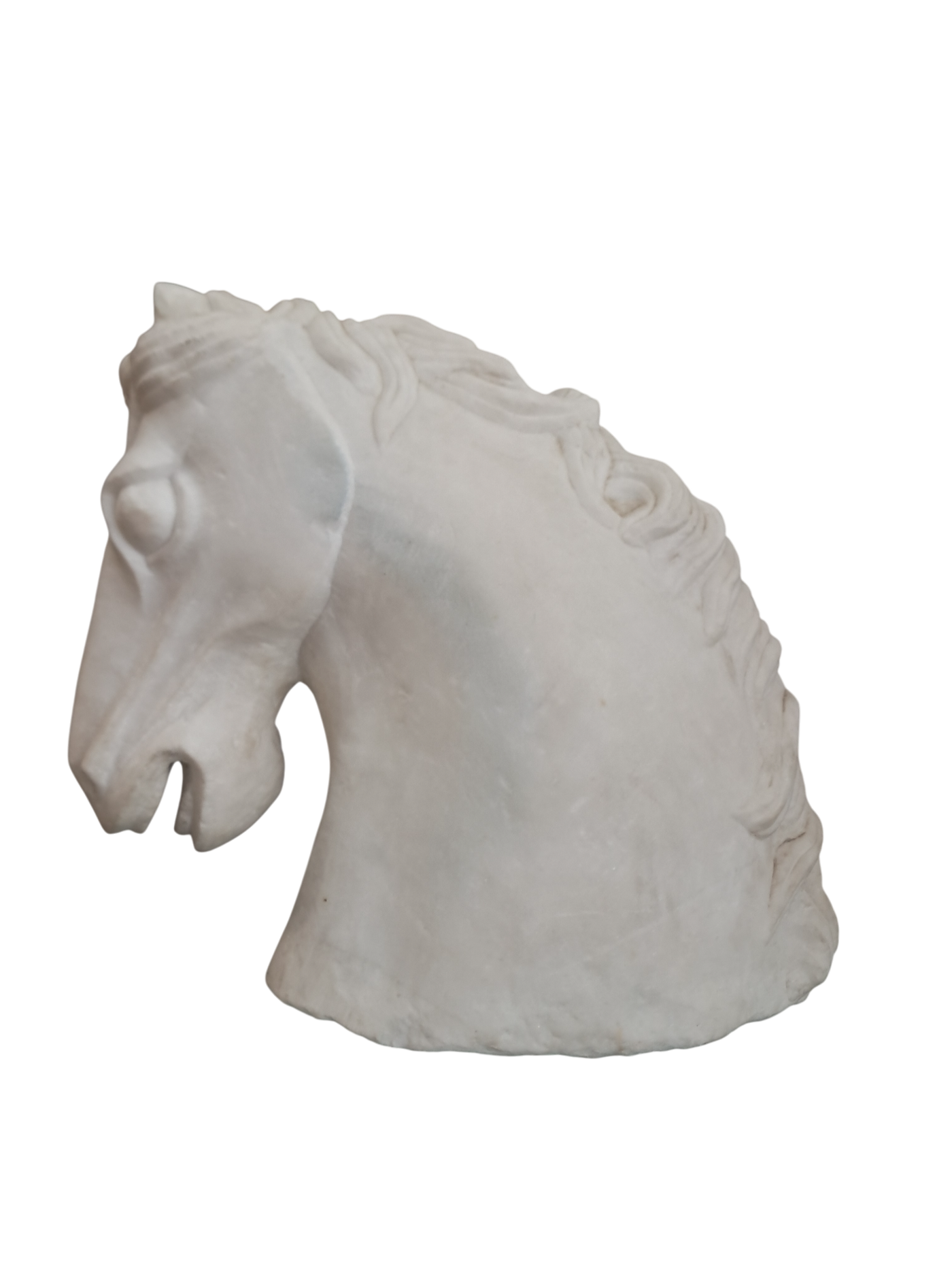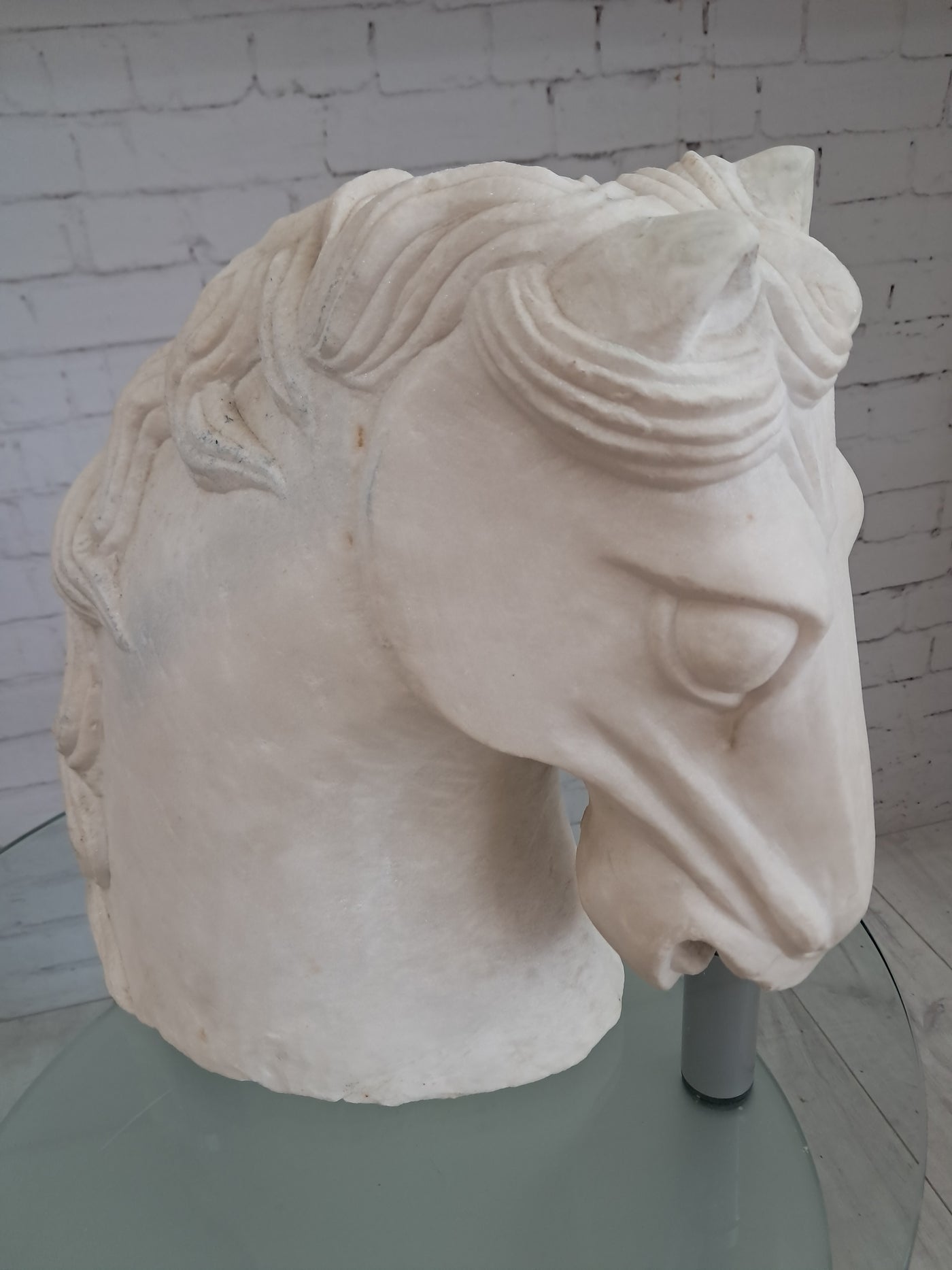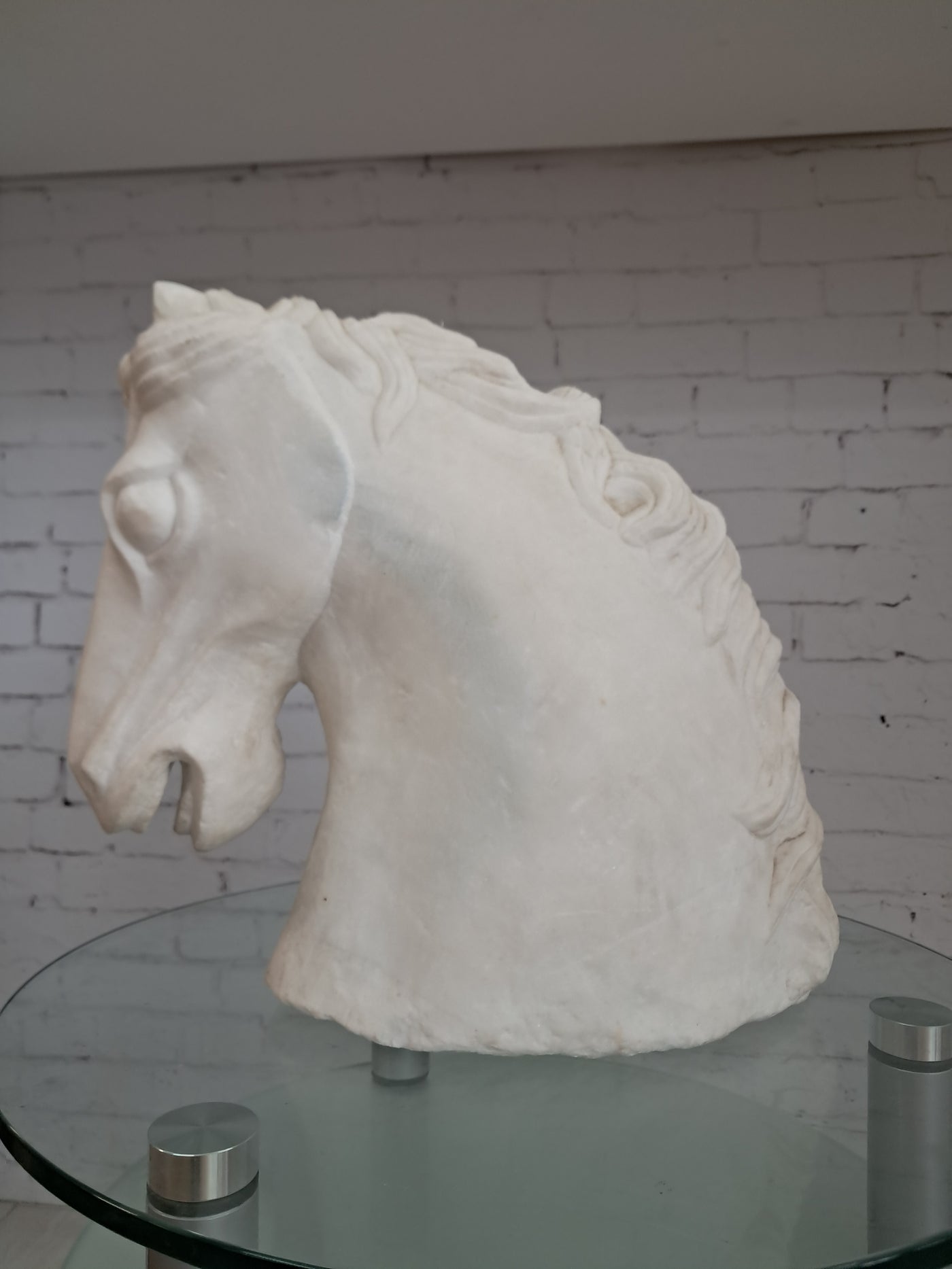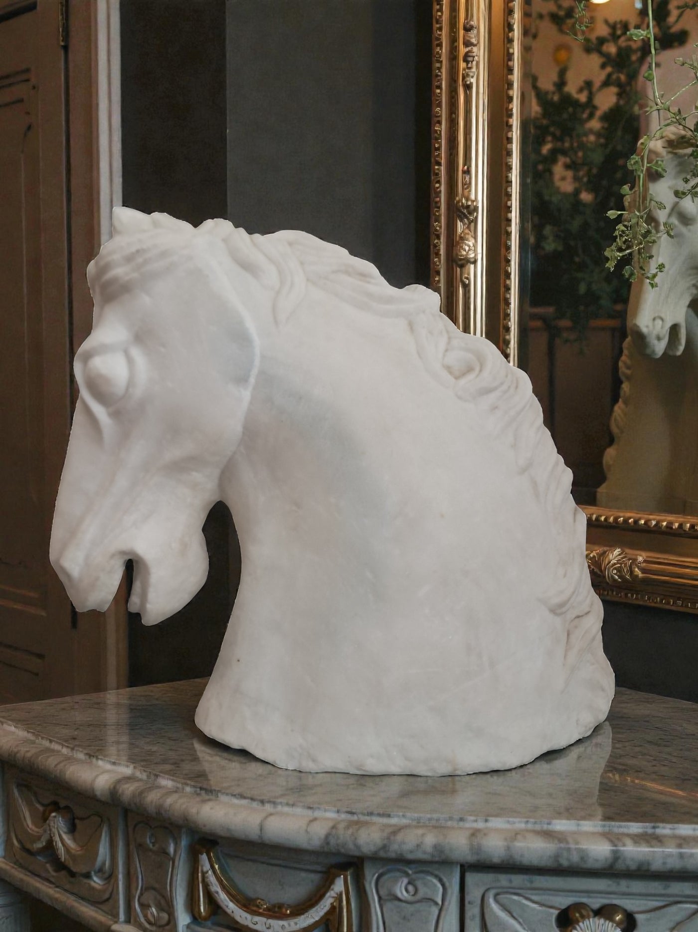 {"id":15627865031034,"title":"Vintage LARGE Horse Head Bust Sculpture White Marble Ancient Greek Style 35cm Tall","handle":"vintage-large-horse-head-bust-sculpture-white-marble-ancient-greek-style-35cm-tall","description":"\u003cdiv\u003e\u003cstrong\u003eMonumental Vintage White Marble Horse Head Bust – Classical Greek Style - In superb Condition\u003c\/strong\u003e\u003c\/div\u003e\n\u003cdiv\u003e\u003cbr\u003e\u003c\/div\u003e\n\u003cdiv\u003eThis magnificent vintage horse head bust is a striking sculptural piece carved from solid white marble, exuding classical elegance and timeless presence. Substantial in both scale and weight, it is an unmistakably high-quality object that commands attention the moment it is placed within a space.\u003c\/div\u003e\n\u003cdiv\u003e\u003cbr\u003e\u003c\/div\u003e\n\u003cdiv\u003eThe sculpture is executed in a Greco-classical style, with beautifully proportioned features and a strong, noble profile. The flowing mane is expertly carved with rhythmic movement and depth, while the softly contoured musculature of the neck conveys strength, poise, and restrained power—hallmarks of classical Greek influence. The marble itself has a gentle, natural patina, enhancing its authenticity and lending warmth to the otherwise crisp white surface.\u003c\/div\u003e\n\u003cdiv\u003e\u003cbr\u003e\u003c\/div\u003e\n\u003cdiv\u003eThis is a very heavy and large piece, clearly intended as a statement object rather than a decorative afterthought. Its weight and solidity speak to its quality and durability, making it suitable for both private and commercial environments.\u003c\/div\u003e\n\u003cdiv\u003e\u003cbr\u003e\u003c\/div\u003e\n\u003cdiv\u003e\u003cstrong\u003eInterior \u0026amp; Styling Suggestions\u003c\/strong\u003e\u003c\/div\u003e\n\u003cdiv\u003e\u003cbr\u003e\u003c\/div\u003e\n\u003cdiv\u003e\u003cstrong\u003eResidential Settings:\u003c\/strong\u003e\u003c\/div\u003e\n\u003cdiv\u003e\u003cbr\u003e\u003c\/div\u003e\n\u003cdiv\u003eIdeal as a dramatic focal point in a grand hallway or entrance hall, where its sculptural form can be appreciated from multiple angles.\u003c\/div\u003e\n\u003cdiv\u003e\u003cbr\u003e\u003c\/div\u003e\n\u003cdiv\u003eExceptionally well-suited to period homes, Georgian or Victorian properties, or modern interiors seeking a bold classical contrast.\u003c\/div\u003e\n\u003cdiv\u003e\u003cbr\u003e\u003c\/div\u003e\n\u003cdiv\u003eLooks particularly striking in minimalist or neutral interiors, where the purity of the white marble can take centre stage.\u003c\/div\u003e\n\u003cdiv\u003e\u003cbr\u003e\u003c\/div\u003e\n\u003cdiv\u003eA superb addition to a study, library, or living room styled with classical, equestrian, or art-led influences.\u003c\/div\u003e\n\u003cdiv\u003e\u003cbr\u003e\u003c\/div\u003e\n\u003cdiv\u003e\u003cstrong\u003eCommercial \u0026amp; Professional Spaces:\u003c\/strong\u003e\u003c\/div\u003e\n\u003cdiv\u003e\u003cbr\u003e\u003c\/div\u003e\n\u003cdiv\u003ePerfect for boutique hotels, luxury spas, private members’ clubs, or high-end restaurants seeking an atmosphere of refinement and heritage.\u003c\/div\u003e\n\u003cdiv\u003e\u003cbr\u003e\u003c\/div\u003e\n\u003cdiv\u003eAn outstanding statement piece for reception areas in law firms, architectural practices, galleries, or design studios.\u003c\/div\u003e\n\u003cdiv\u003e\u003cbr\u003e\u003c\/div\u003e\n\u003cdiv\u003eWorks beautifully in upscale retail environments, especially those focused on luxury goods, interiors, or art and design.\u003c\/div\u003e\n\u003cdiv\u003e\u003cbr\u003e\u003c\/div\u003e\n\u003cdiv\u003eA rare and powerful decorative object, this marble horse head bust embodies classical beauty and enduring craftsmanship. It is a piece for those who appreciate sculptural art with presence, history, and gravitas—equally at home in a refined private residence or a distinguished commercial setting.\u003c\/div\u003e\n\u003cdiv\u003e\u003cbr\u003e\u003c\/div\u003e\n\u003cdiv\u003eThis would make a great gift for anyone who loves horses or the equestrian life.\u003c\/div\u003e\n\u003cdiv\u003e\u003cstrong\u003e\u003cbr\u003e\u003c\/strong\u003e\u003c\/div\u003e\n\u003cdiv\u003e\u003cstrong\u003eMeasurements: approx\u003c\/strong\u003e\u003c\/div\u003e\n\u003cdiv\u003e35 cm H x 19cm W x 37cm D \u003c\/div\u003e\n\u003cdiv\u003e\u003cbr\u003e\u003c\/div\u003e\n\u003cdiv\u003eThis item is available to view by appointment only - Tel: 01895675596. FREE collection by appointment only.\u003c\/div\u003e\n\u003cdiv\u003e\u003cbr\u003e\u003c\/div\u003e\n\u003cdiv\u003eOur guiding principle is to breathe new life into these exceptional antique and vintage pieces, offering them a fresh opportunity for use. By doing so, you not only acquire a distinctive and high-quality item for your home but also play a part in reducing the world's carbon footprint. Join us in supporting future generations and avoid adopting a disposable mindset.\u003c\/div\u003e\n\u003cdiv\u003e\u003cbr\u003e\u003c\/div\u003e\n\u003cdiv\u003eFREE collection from our shop is available by appointment only.\u003c\/div\u003e\n\u003cdiv\u003eThe delivery quoted in this listing is for mainland UK only.\u003c\/div\u003e\n\u003cdiv\u003ePlease contact us for a delivery quote to Cornwall, Scotland, Highlands or Islands or Offshore UK, Northern Ireland, Jersey, Guernsey, IOW, etc as it may be more than the price quote.\u003c\/div\u003e\n\u003cdiv\u003e\u003cbr\u003e\u003c\/div\u003e\n\u003cdiv\u003eDue to the delicate nature of this item Courier price quoted is for specialist furniture courier. Timed and exact delivery day requests are not available but delivery will normally be within a two week window. \u003c\/div\u003e\n\u003cdiv\u003e\u003cbr\u003e\u003c\/div\u003e\n\u003cdiv\u003eThis item is available to view in our showroom RetroNovia, 12 New Pond Parade, West End Road, Ruislip Gardens, Middlesex HA4 6LR . Please call us on 01895 675596 to make sure the item is available before coming to vie