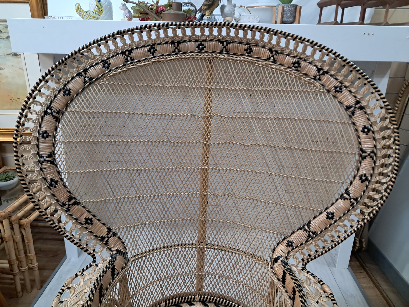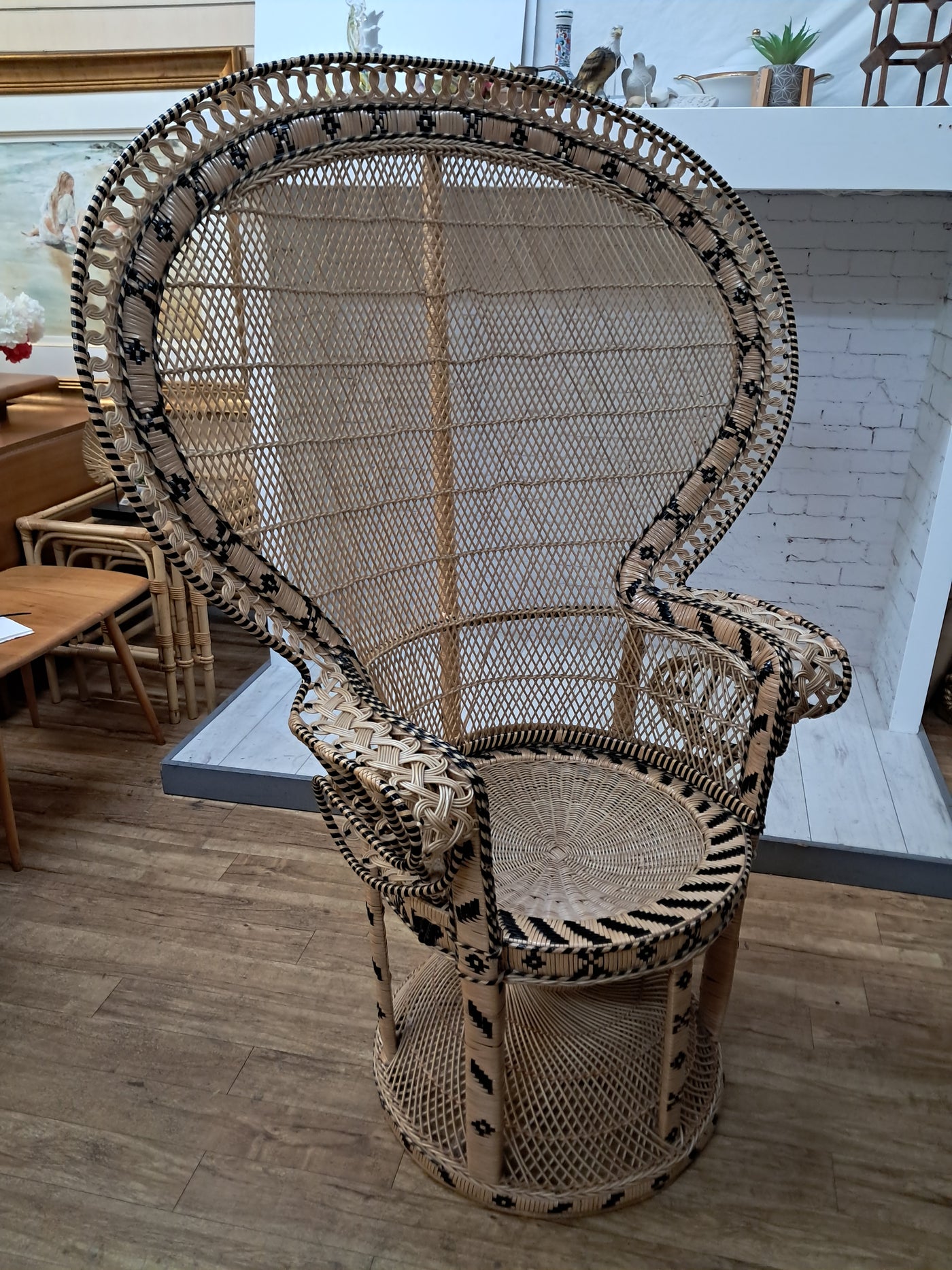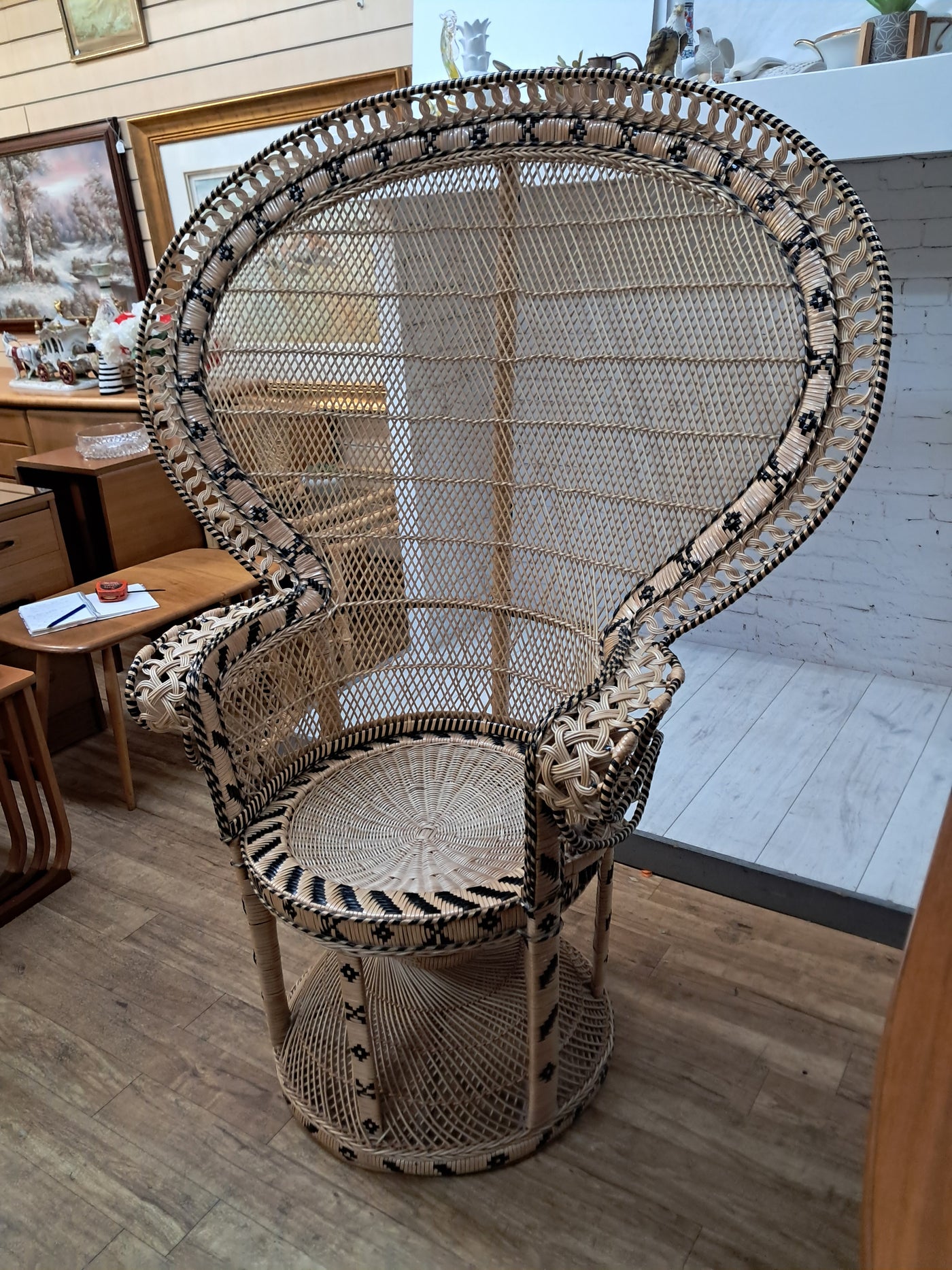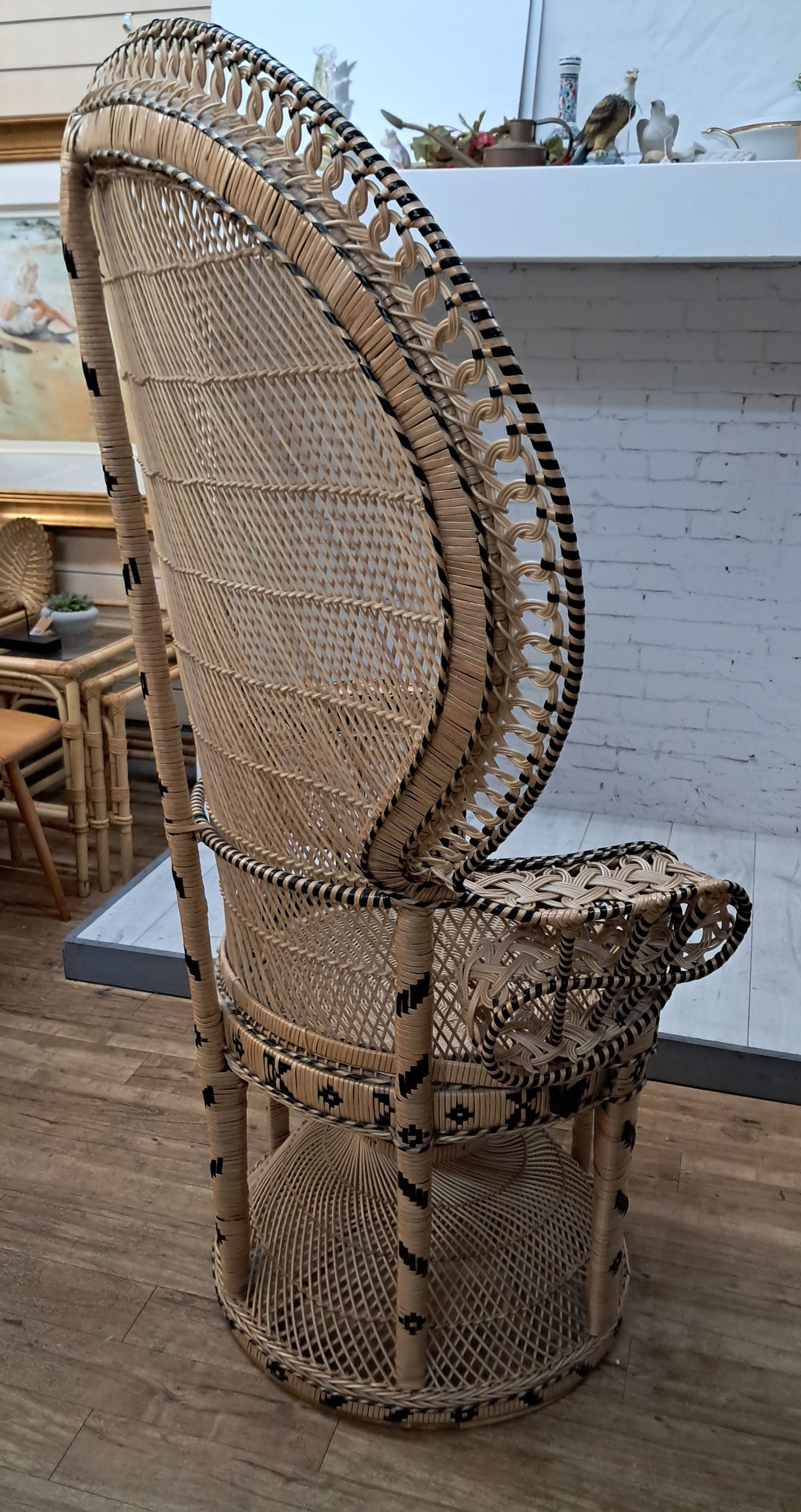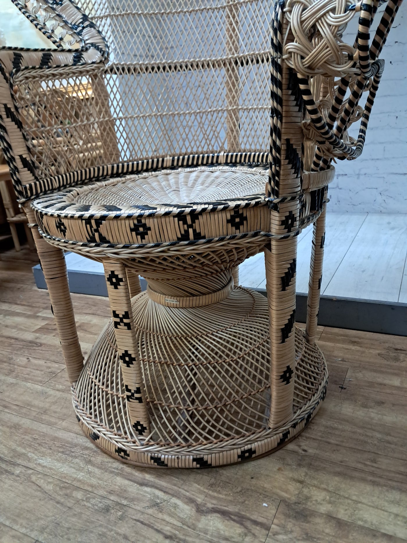 {"id":15563356242298,"title":"Mid Century Peacock Chair Emmanuelle Wicker Throne Rattan Bohemian 1970's LARGE","handle":"vintage-mid-century-white-rattan-peacock-chair-wicker-chair-conservatory-large-copy","description":"\u003cp\u003e\u003cstrong\u003eIconic 1970s Emmanuelle Peacock Chair with Twisted Base\u003c\/strong\u003e\u003c\/p\u003e\n\u003cp\u003eThis beautiful and highly decorative Emmanuelle Peacock Chair dates from the 1970s and is a striking example of this iconic design. Crafted from natural rattan, the chair features the classic high fan-shaped back with intricate woven detailing, elegant scroll arms and a distinctive twisted pedestal base, giving it both visual drama and excellent structural strength.\u003c\/p\u003e\n\u003cp\u003eThe Emmanuelle chair rose to fame through its appearances in popular culture, most notably in The Addams Family and the cult film Emmanuelle. As a result, it is commonly referred to as an “Emmanuelle” chair in France and remains one of the most recognisable and sought-after rattan designs of the 20th century.\u003c\/p\u003e\n\u003cp\u003eThis example is particularly well made and notably heavy, reflecting the quality of materials and craftsmanship. The level of detail throughout the weaving is excellent, from the patterned edging around the backrest to the finely constructed seat and base. The chair is in superb condition, with all rattan intact, tight, and free from damage, making it both decorative and functional.\u003c\/p\u003e\n\u003cp\u003eA removable seat cushion is included, providing added comfort while complementing the natural tones of the rattan.\u003c\/p\u003e\n\u003cp\u003e\u003cstrong\u003eFor Bohemian Beach House Vibes:\u003c\/strong\u003e\u003c\/p\u003e\n\u003cp\u003ePerfect for creating relaxed, bohemian beach house interiors, this Emmanuelle chair brings effortless style and warmth to any space. It works beautifully in a conservatory, where natural light enhances the woven rattan and creates an inviting, tranquil setting for reading or relaxation. Whether placed in a sunroom, coastal living area, bedroom, or styled corner, it evokes laid-back luxury with a hint of 1970s glamour, making it an ideal statement piece for interiors inspired by natural textures and easy living.\u003c\/p\u003e\n\u003cp\u003eA timeless and stylish addition to any home, this piece is perfect for those who appreciate iconic design, as well as interior designers looking to incorporate a bold and elegant focal point into their projects. It would also make an exceptional prop for weddings, photoshoots, and events, or for use within retail spaces, boutique hotels, salons, or hospitality interiors, where its instantly recognisable silhouette adds character, drama, and visual impact.\u003c\/p\u003e\n\u003cp\u003e\u003cstrong\u003eMeasurements: (approx)\u003c\/strong\u003e\u003cbr\u003eOverall: 147cm Height x 56 cm depth 113cm width\u003cbr\u003eHeight to seat: 46cm with cushion: 51cm\u003cbr\u003eSeat: Width 50cm x Depth: 50cm \u003c\/p\u003e\n\u003cp\u003eThis peacock chair is truly magnificent and will look very regal in any beach house, home interior, garden room, business reception or entryway, designer home interior.\u003c\/p\u003e\n\u003cp\u003eFor discerning lovers of bohemian vintage and interior connoisseurs, this piece offers an unparalleled blend of comfort and prestige. \u003c\/p\u003e\n\u003cp\u003eAll of our furniture has been restored\/upcycled or professionally cleaned with care and attention using quality paints and materials. \u003c\/p\u003e\n\u003cp\u003eOur motto is to reuse and recycle these wonderful antique and vintage items so that they get a new lease of life and at the same time you will have a unique, personal item of good quality in your home that will also contribute to the world's carbon footprint. We owe it to our future generations NOT to be a throwaway society.\u003c\/p\u003e\n\u003cp\u003eFREE collection is available from our shop by appointment only. Viewing by appointment - 01895 675596\u003c\/p\u003e\n\u003cp\u003eWe can offer local delivery please message for quote\u003cbr\u003eThe delivery quoted in this listing is for mainland UK only.\u003cbr\u003ePlease contact us for a delivery quote to Cornwall, Scotland, Highlands or Islands or Offshore UK, Northern Ireland, Jersey, Guernsey, IOW, etc as it may be more than the price quote.\u003c\/p\u003e\n\u003cp\u003eCourier price quoted is for one man courier to ground floor level only – help will be needed your end. Timed and exact delivery day requests are not available but delivery will normally be within a two week window. If you wish to have a two man courier then we can give you a quote for this.\u003c\/p\u003e\n\u003cp\u003eThis item is available to view at our showroom RetroNovia, 12 New Pond Parade, West End Road, Ruislip Gardens, Middlesex HA4 6LR . Please call us on 01895 675596 to make sure the item is available before coming to view.\u003c\/p\u003e\n\u003cp\u003eWe are located easy access from London and Oxford and are directly off the Main A40 Polish War memorial junction.\u003c\/p\u003e","published_at":"2025-12-17T15:52:43+00:00","created_at":"2025-12-17T15:52:43+00:00","vendor":"RetroNovia","type":"Peacock Chair","tags":["Chair","Peacock Chair","Rattan Chair","Wicker Chair"],"price":52500,"price_min":52500,"price_max":52500,"available":true,"price_varies":false,"compare_at_price":55000,"compare_at_price_min":55000,"compare_at_price_max":55000,"compare_at_price_varies":false,"variants":[{"id":56349986521466,"title":"Default Title","option1":"Default Title","option2":null,"option3":null,"sku":"1555","requires_shipping":true,"taxable":false,"featured_image":null,"available":true,"name":"Mid Century Peacock Chair Emmanuelle Wicker Throne Rattan Bohemian 1970's LARGE","public_title":null,"options":["Default Title"],"price":52500,"weight":70000,"compare_at_price":55000,"inventory_management":"shopify","barcode":null,"requires_selling_plan":false,"selling_plan_alloca